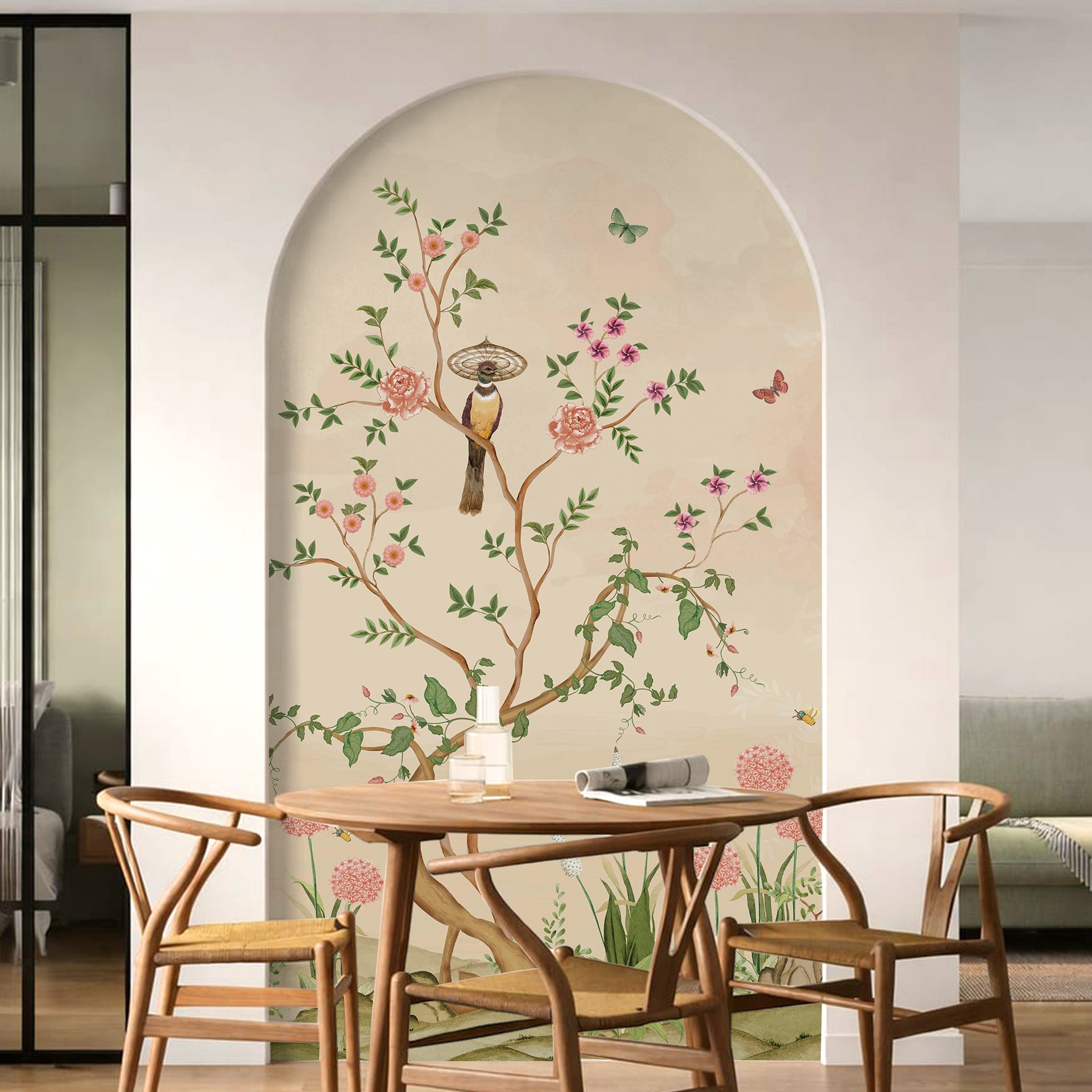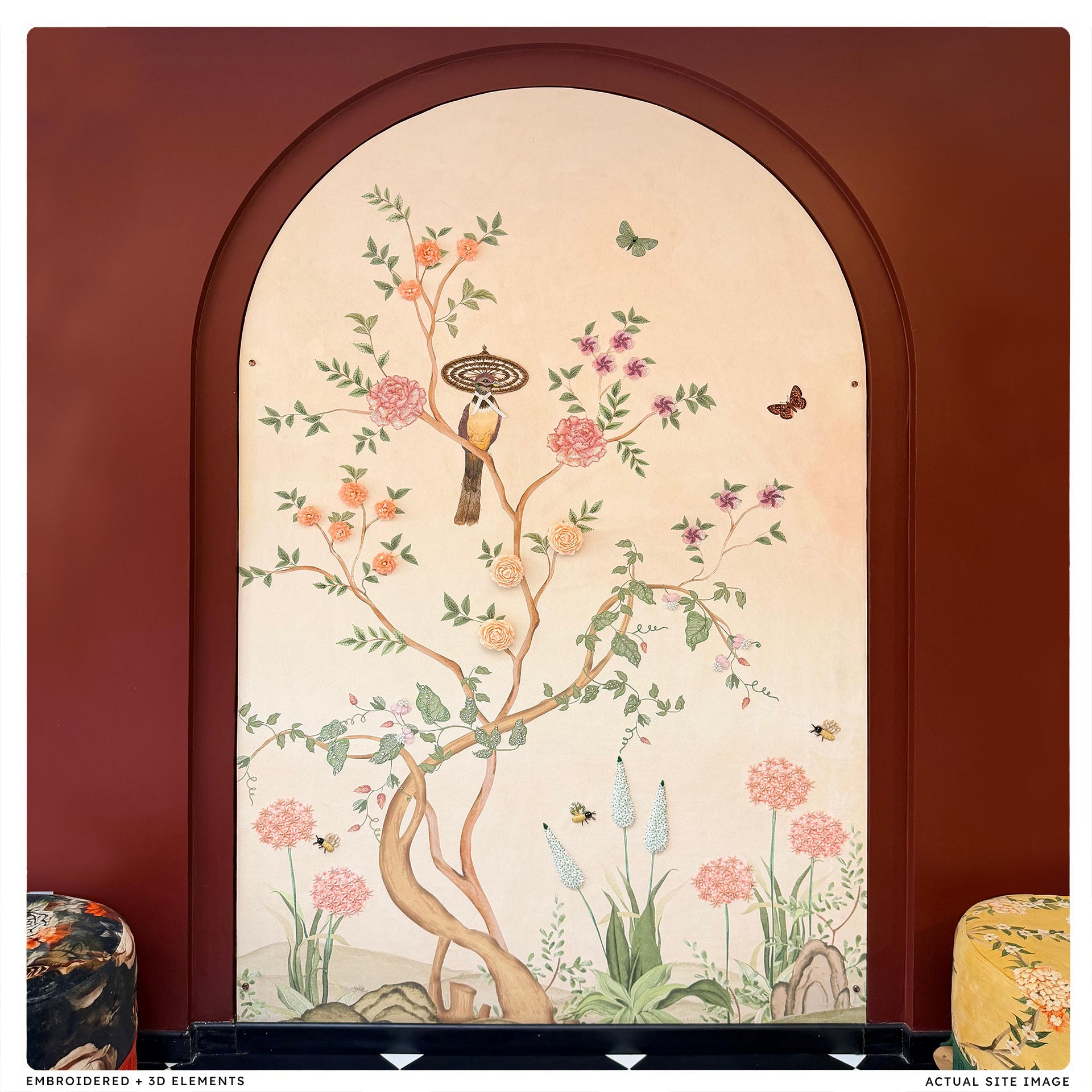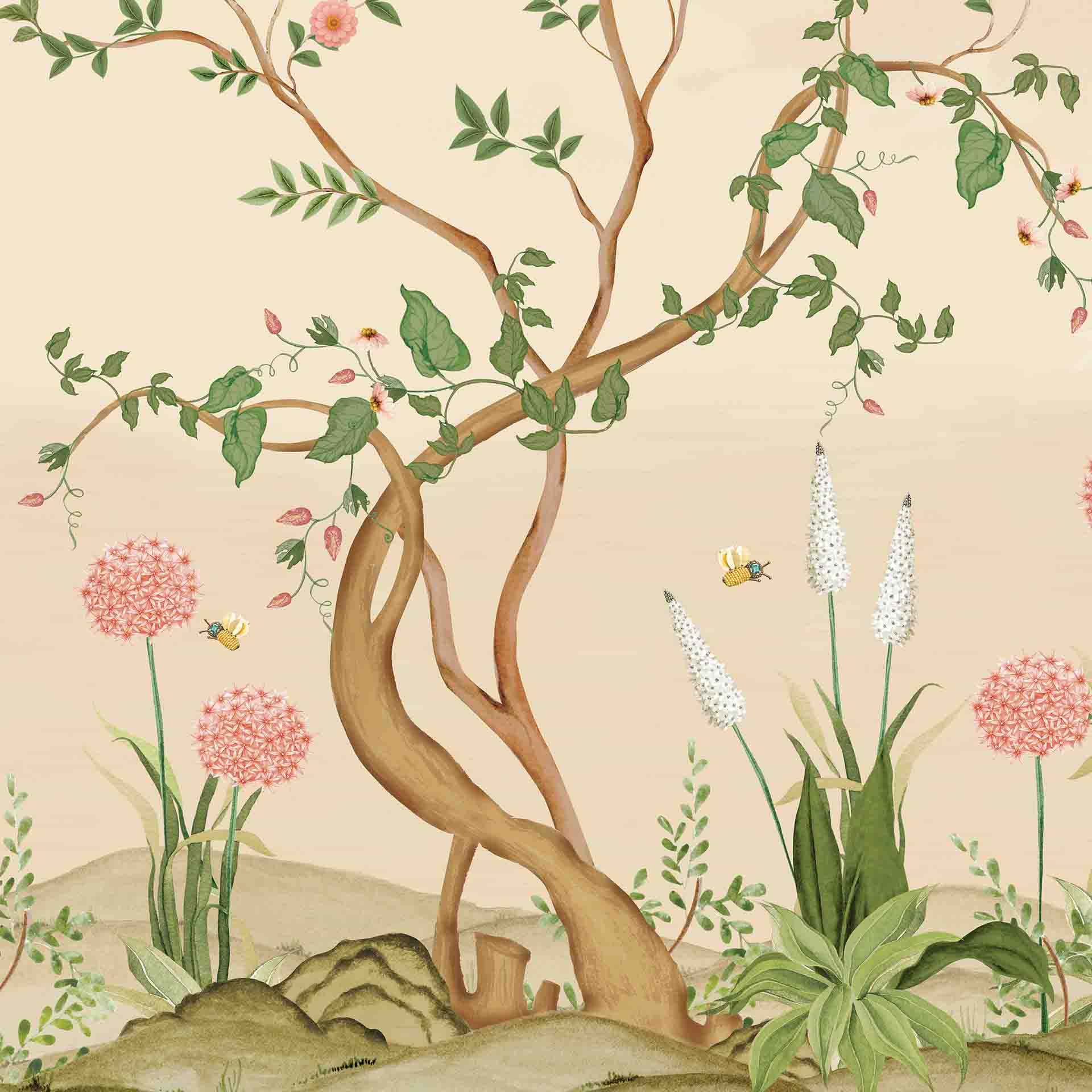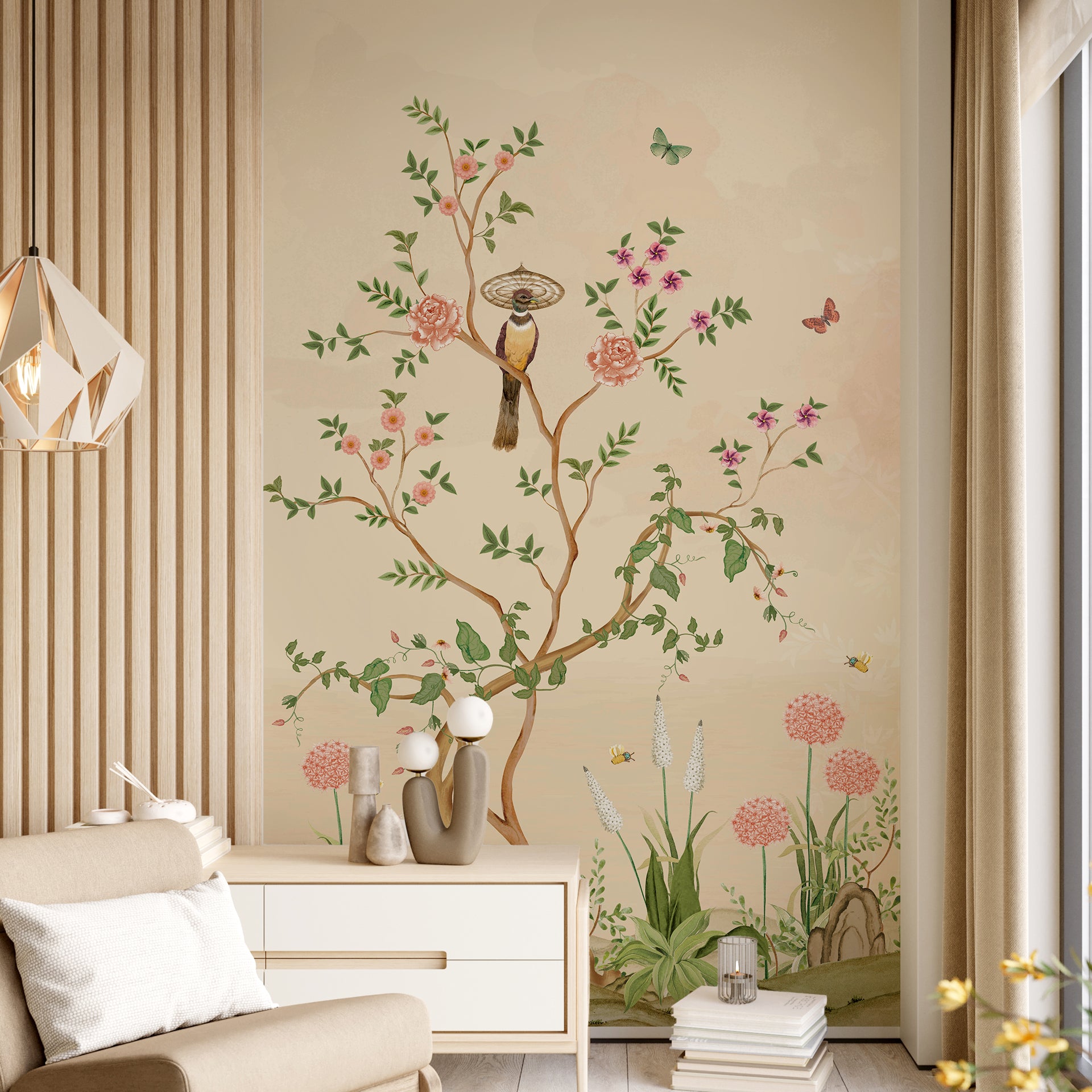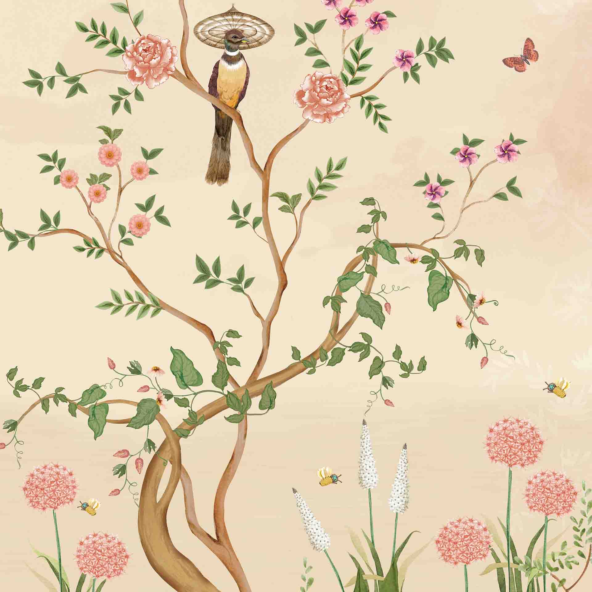 Delicate vintage-style botanical illustration featuring a twisting flowering tree with a perched bird, blooming peonies, butterflies and bees over a soft neutral backdrop for decorative or editorial use.