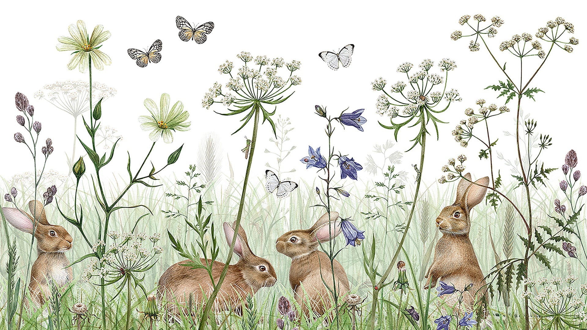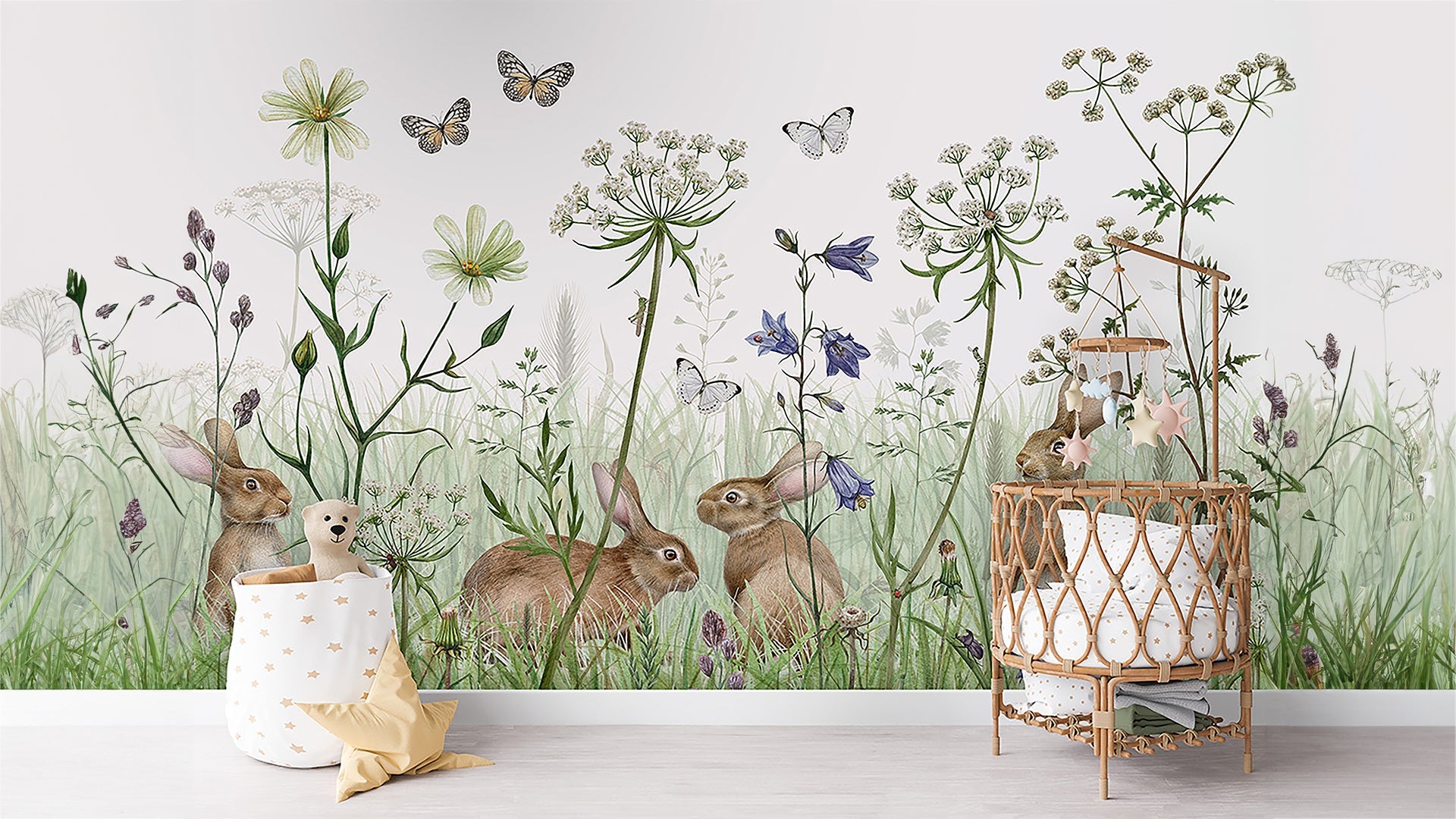 Bring the enchanting beauty of the forest into your child's bedroom with our Bunnies in forest wallpaper.