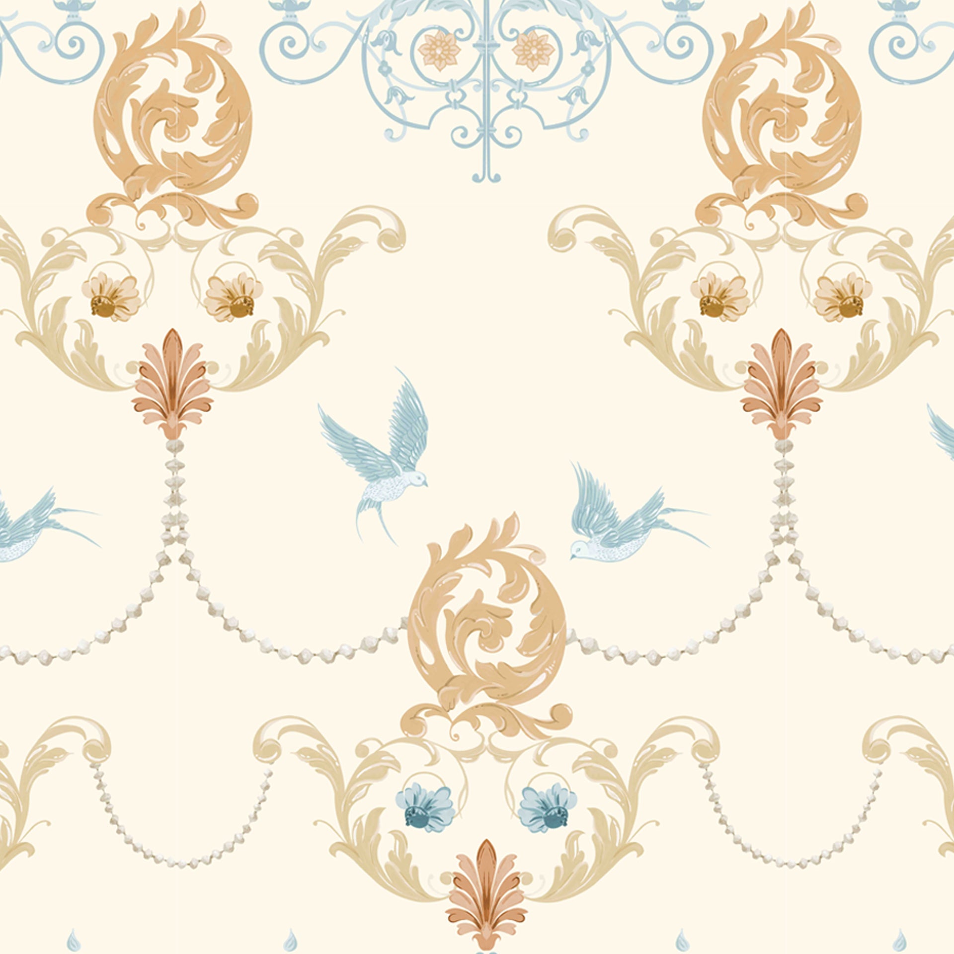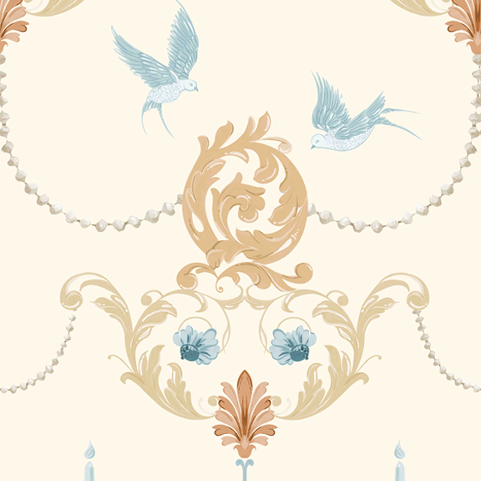 A seamless decorative design with vintage motifs, featuring intricate damask patterns, soft pastel tones, and candle ornamentation accompanied by hummingbird details for an elegant, refined aesthetic