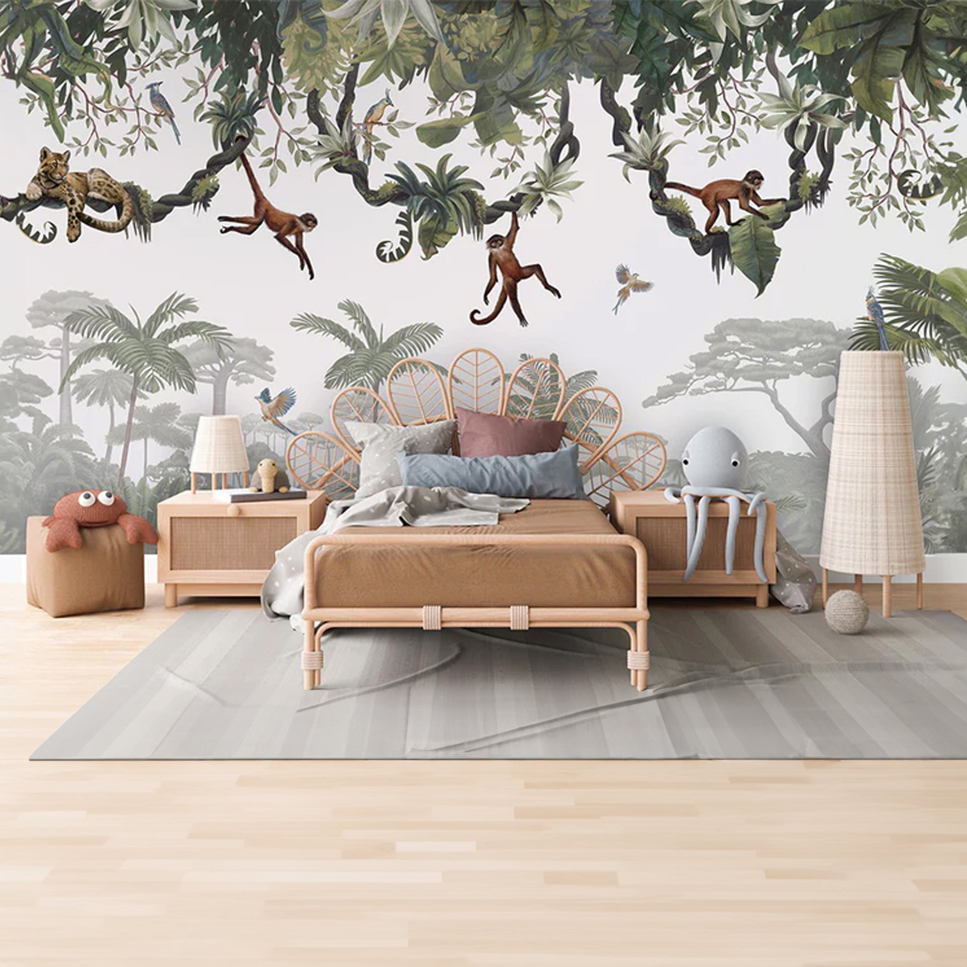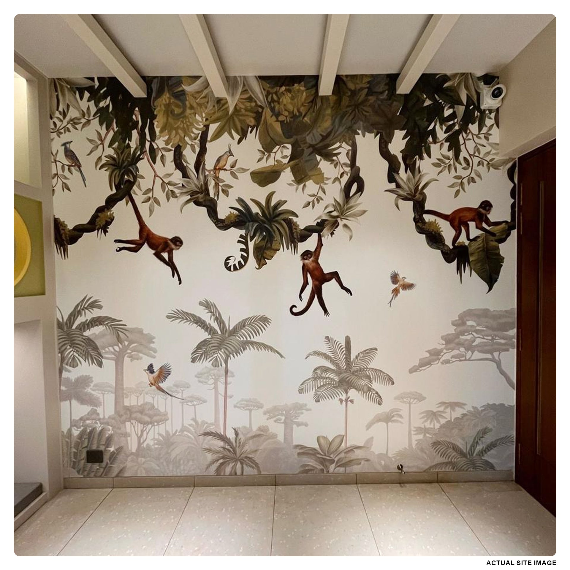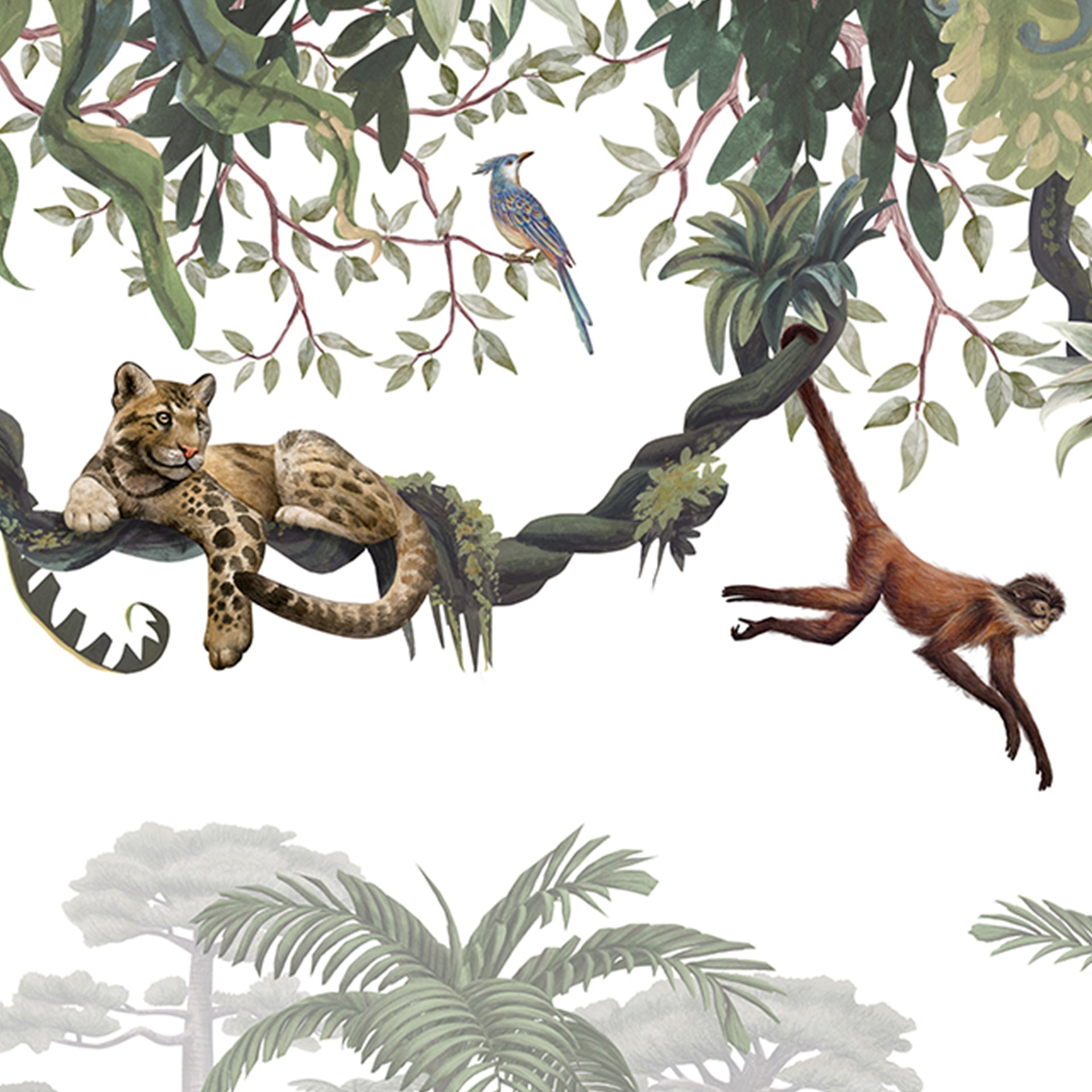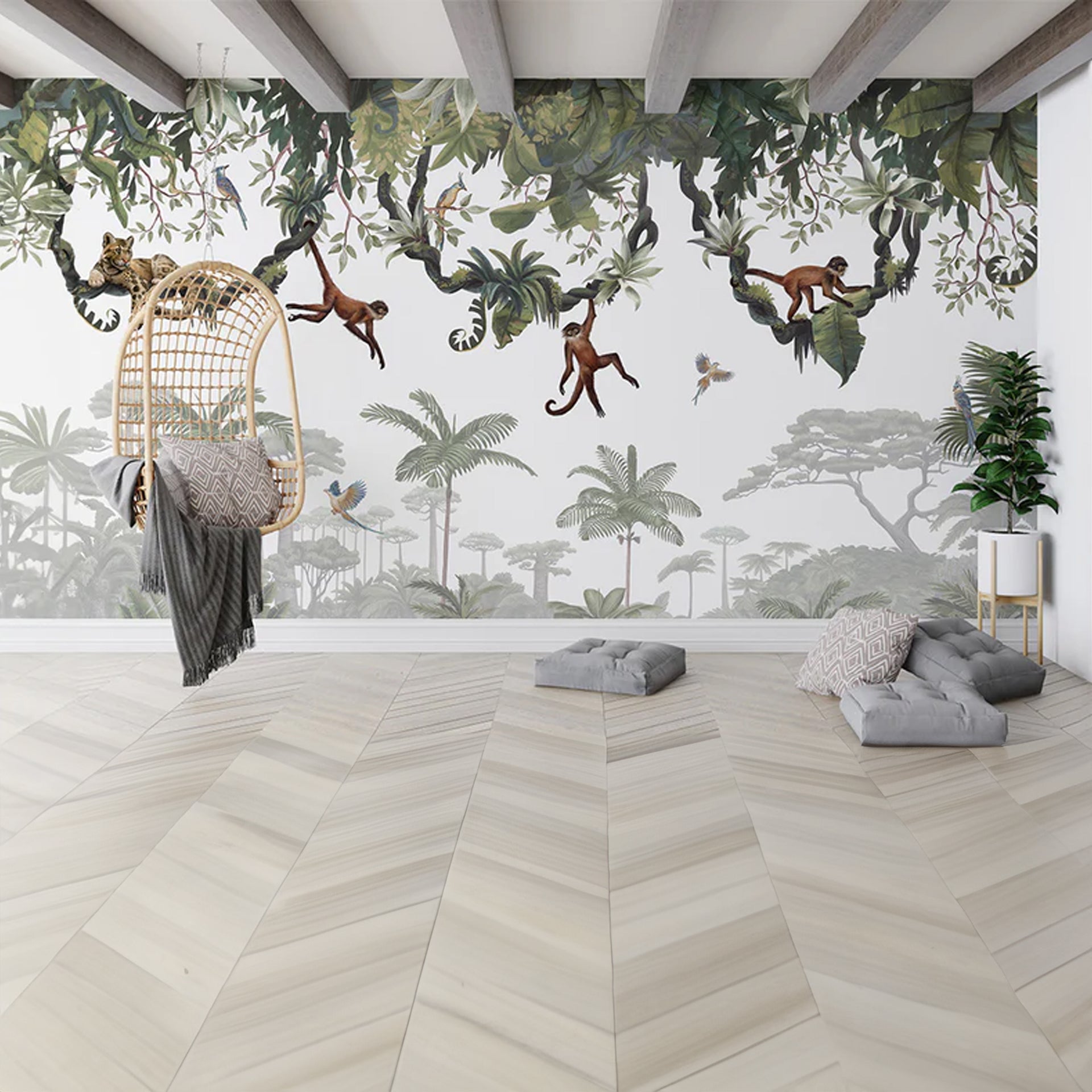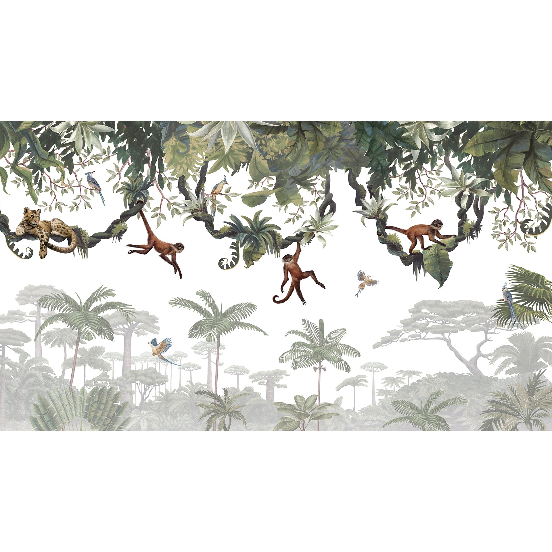 Cheeky-Monkeys: Lush Jungle wallpaper' With Monkeys And Tropical Birds Hanging On Branches In Dense Canopy-Sample