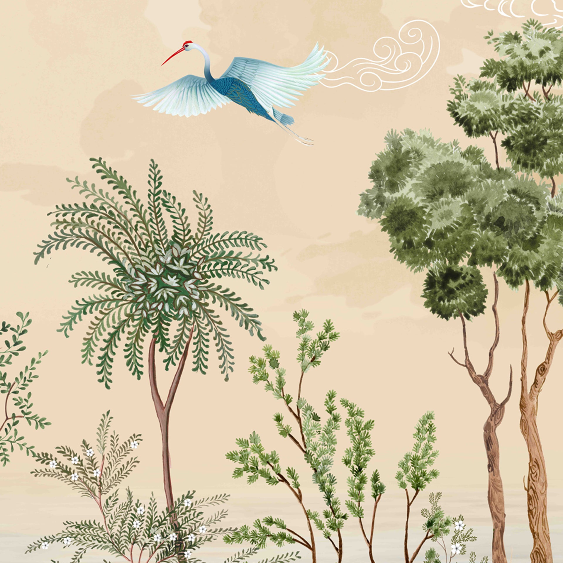 Illustration of a peaceful wetland scene featuring detailed trees, herons in expressive poses, and azure skies with billowing clouds. Evokes calmness inspired by nature's serene beauty and harmonious balance of elements.