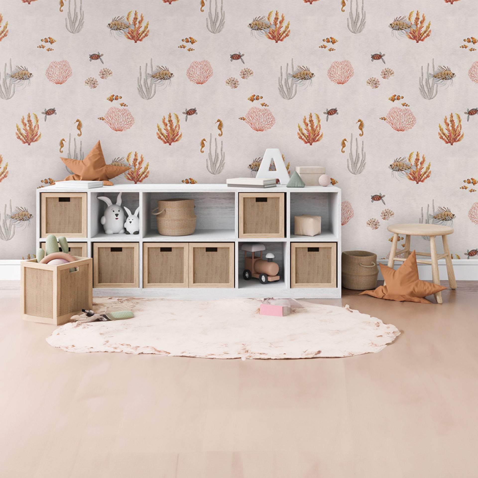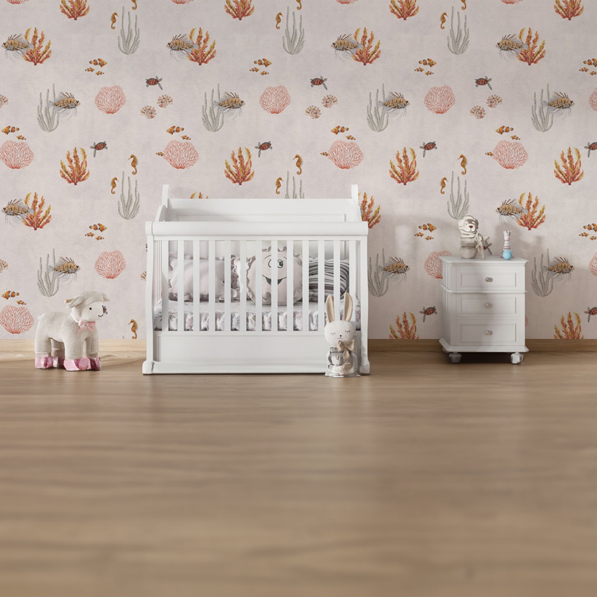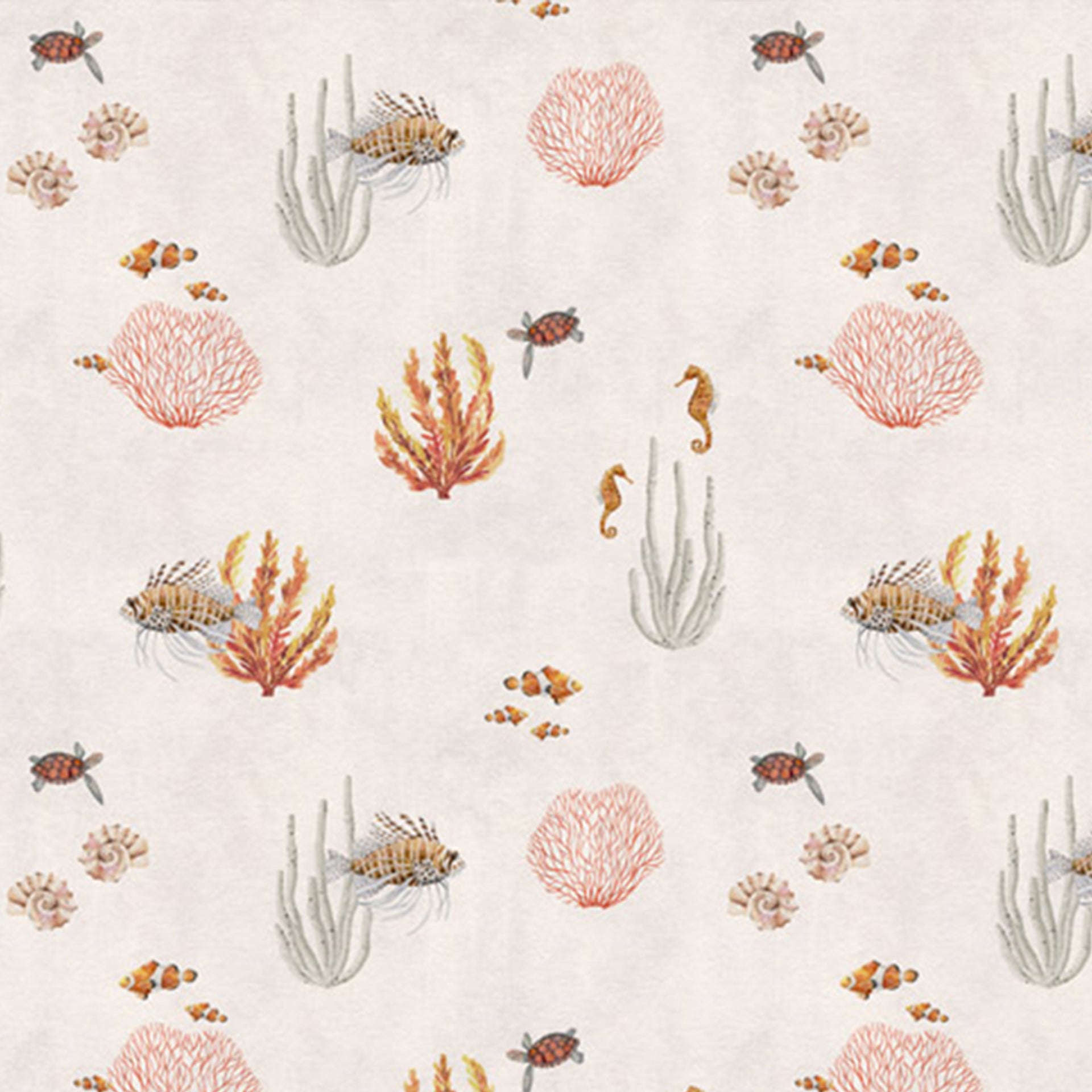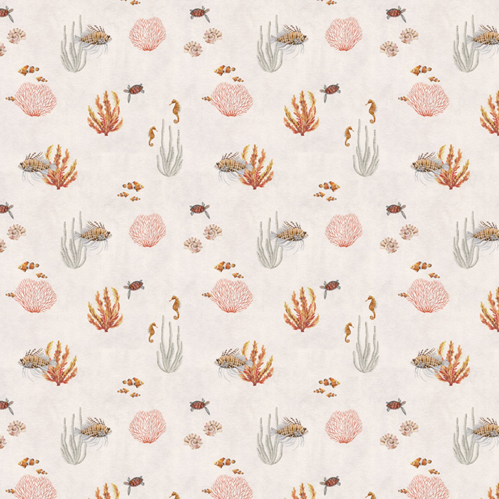 A soft, nautical pattern featuring coral, seaweed, shells, and tiny fish. Ideal for textiles, wallpaper, or gift wrap, offering a calm oceanic vibe and coastal decor appeal.