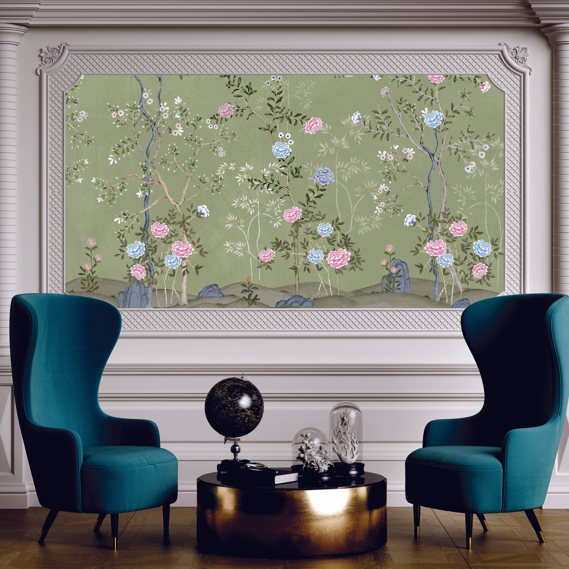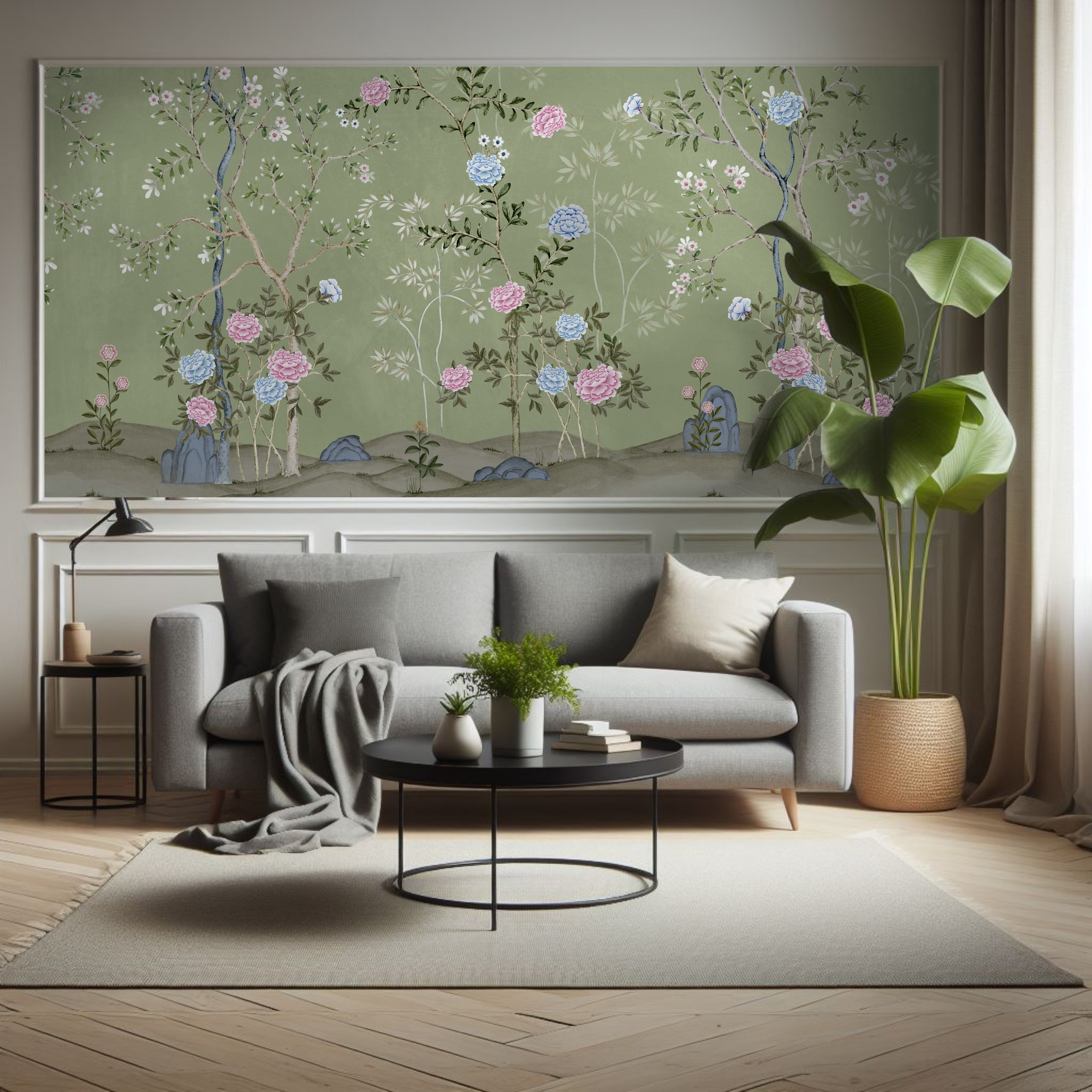 Delicate Blooms floral wallpaper featuring a beautiful pattern of soft pastel flowers set against a calming green background. Perfect for creating a serene, elegant ambiance in any room, this floral wallpaper combines subtle hues and intricate designs to bring nature-inspired beauty indoors. Ideal for bedrooms, living rooms, and cozy spaces seeking a fresh yet understated look.