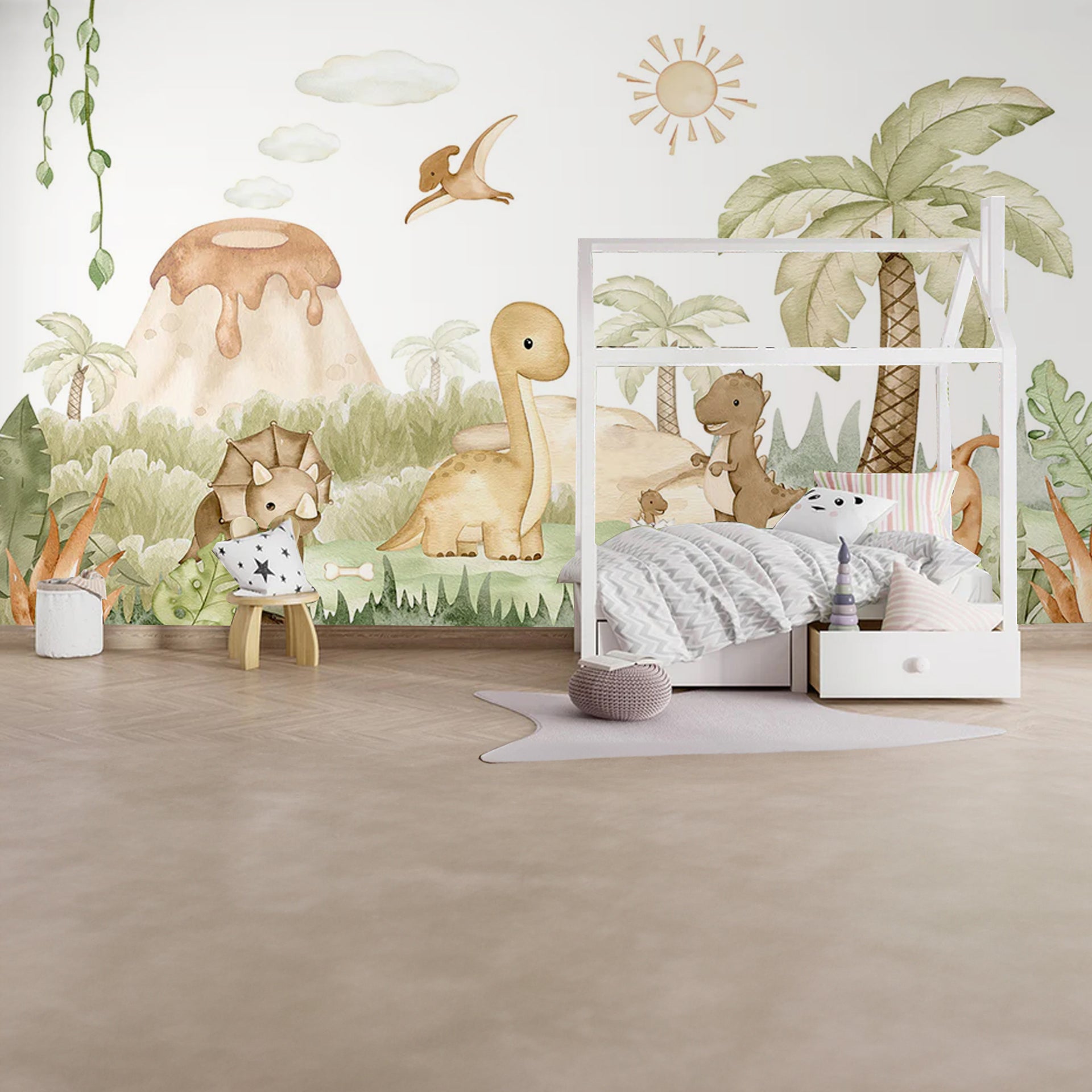 A charming watercolor illustration of friendly dinosaurs in a tropical jungle setting, featuring a volcano, palm trees, sunny sky, and playful hatchlings. Perfect for kids, education, and family-friendly projects..