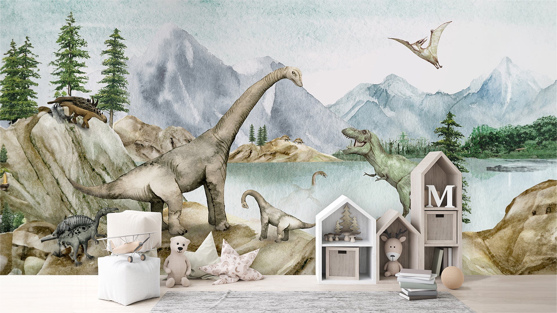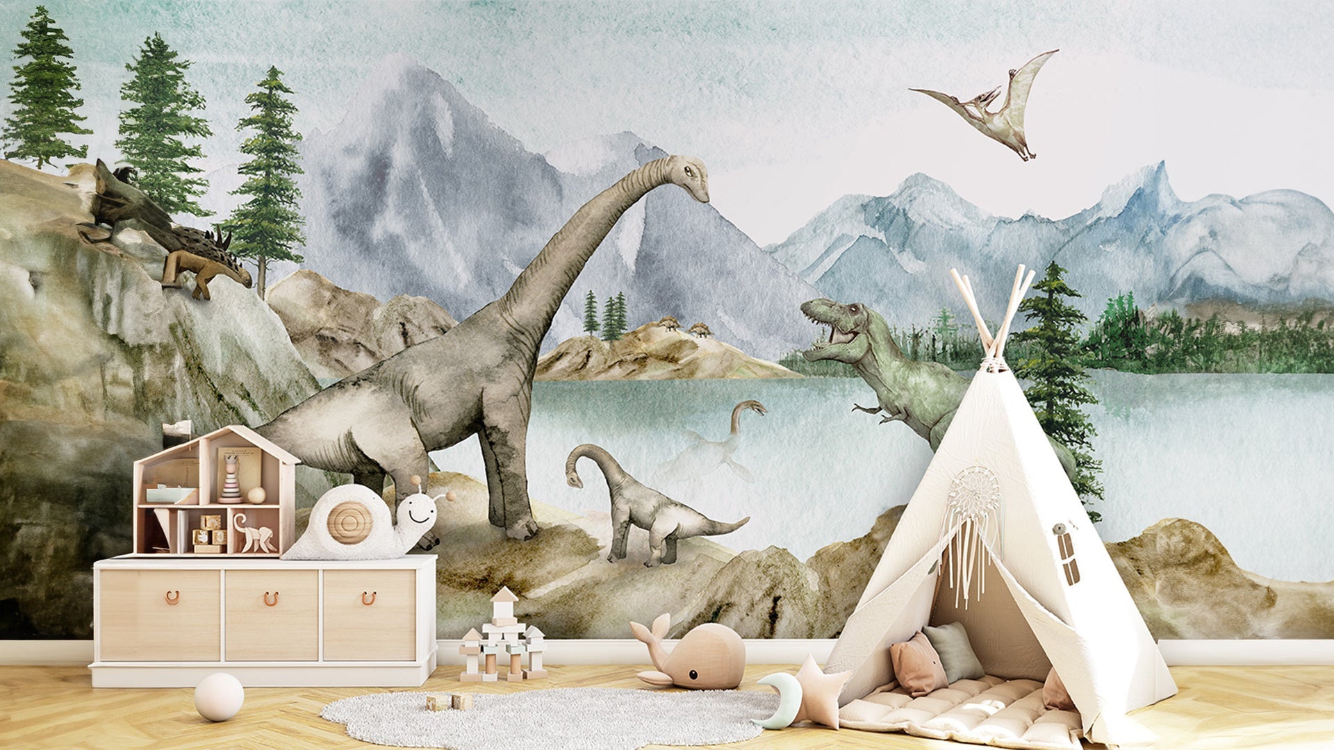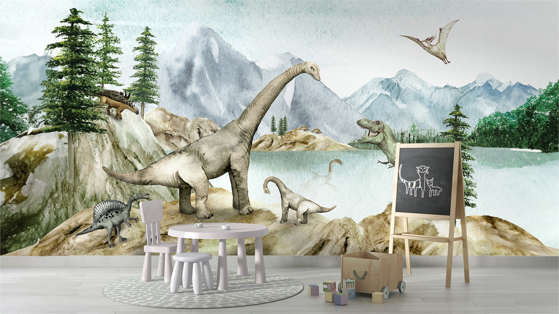 Transform your kids playroom or clubhouse with Dinosaurs in the Lake Wallpaper. This gender-neutral 3d Dinosaur wallpaper design features hand-painted motifs, bringing vibrant colors and lifelike details to any indoor play area or playschool. Perfect for creating a fun zone that's easy to clean and maintain.