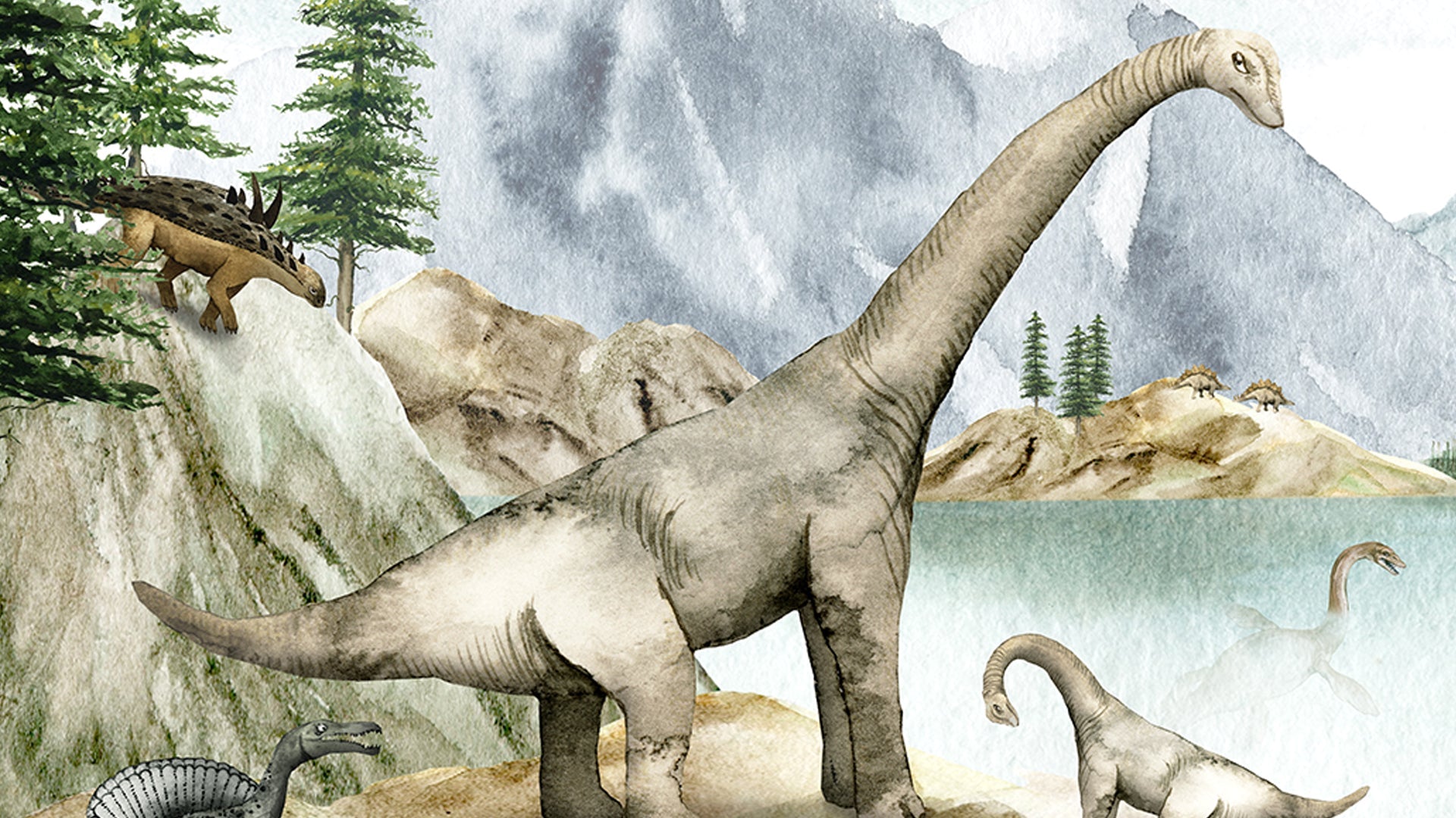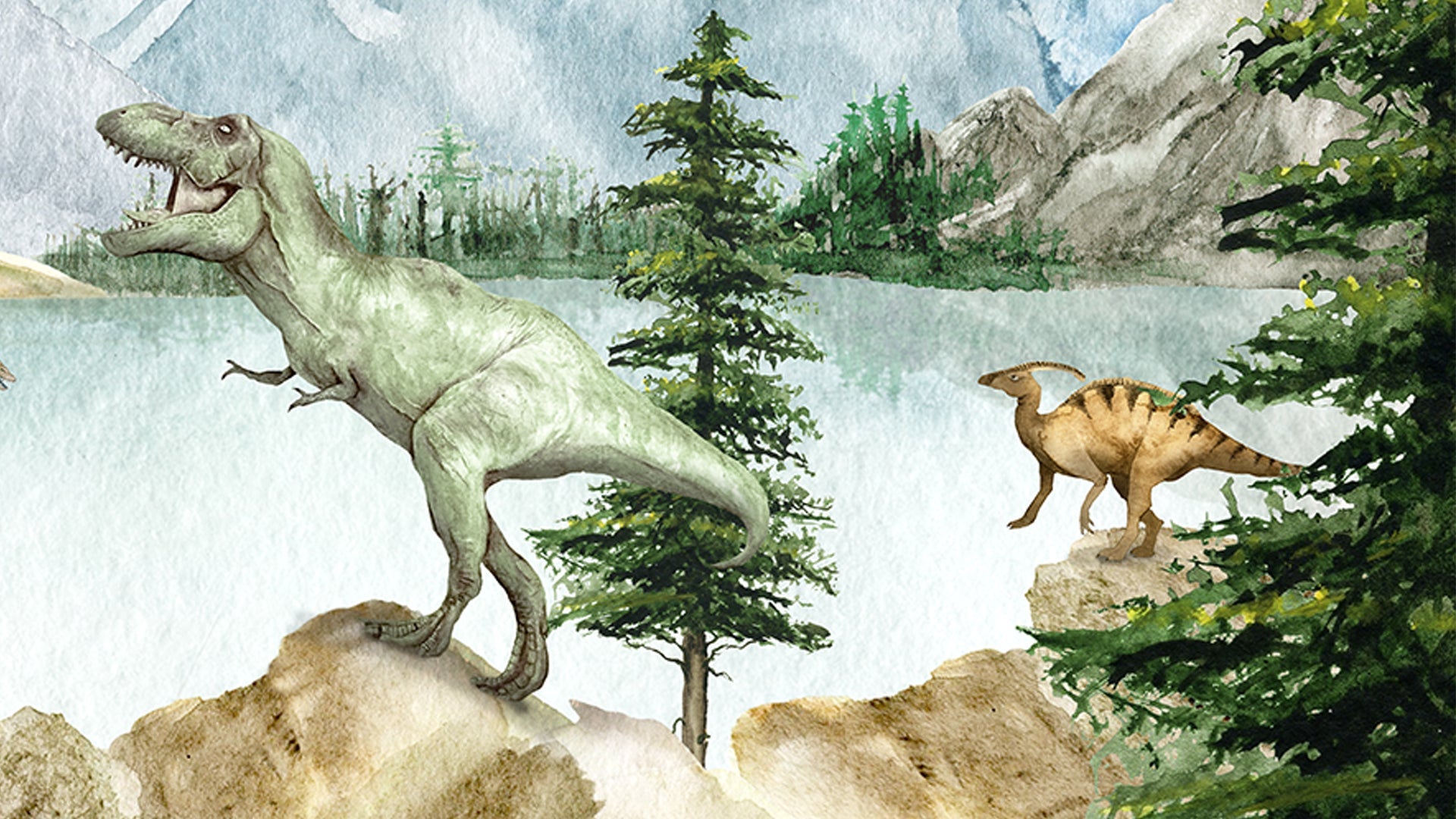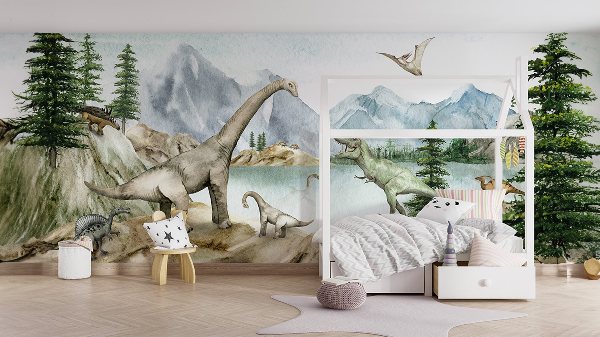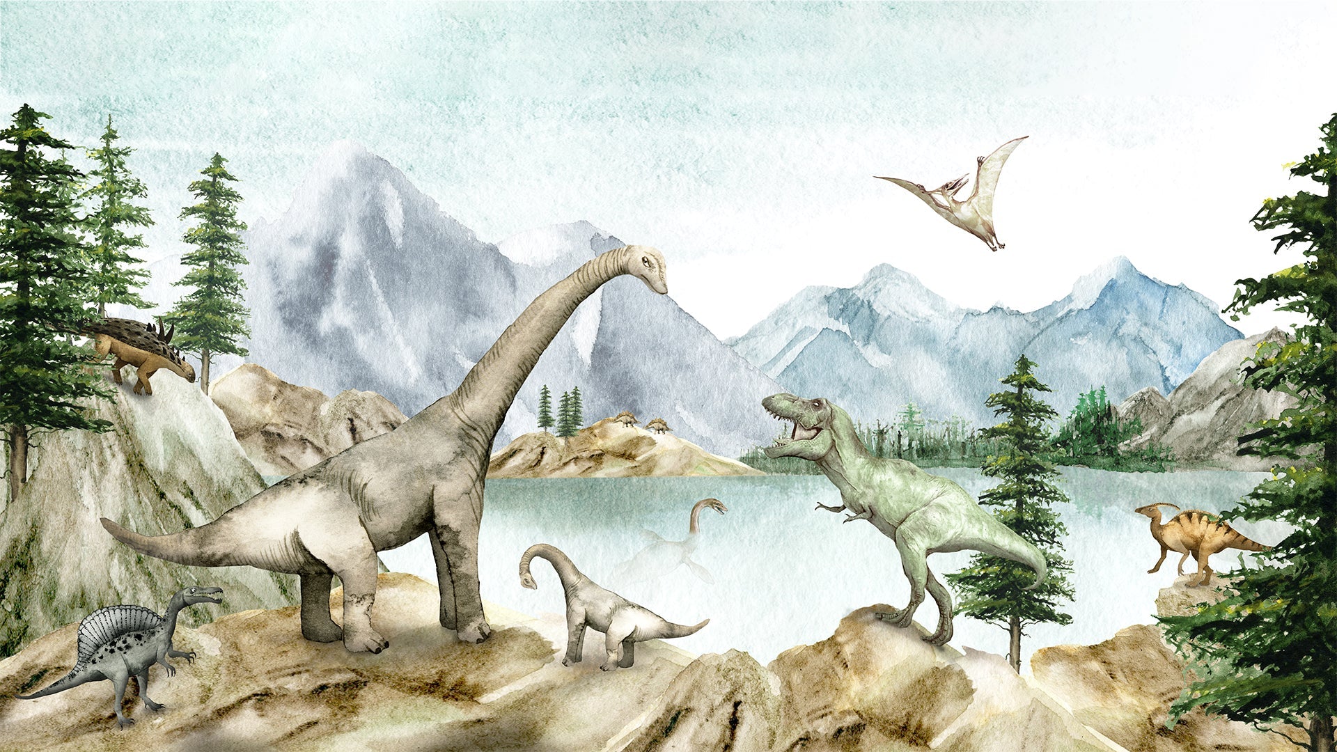 Transform your kids playroom or clubhouse with Dinosaurs in the Lake Wallpaper. This gender-neutral 3d Dinosaur wallpaper design features hand-painted motifs, bringing vibrant colors and lifelike details to any indoor play area or playschool. Perfect for creating a fun zone that's easy to clean and maintain.