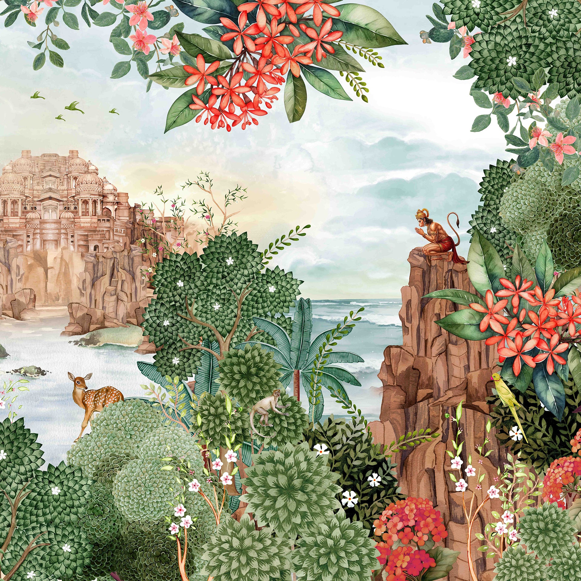Rich with lush greenery, exotic plants, and vibrant red and white blossoms, the artwork brings to life a harmonious tropical world. At the heart of the scene stands an ancient stone fortress perched atop rocky cliffs, overlooking a tranquil blue coastline. Delightful wildlife—including deer, monkeys, and birds—adds charm and movement, while soft skies and drifting clouds create a gentle, soothing backdrop.