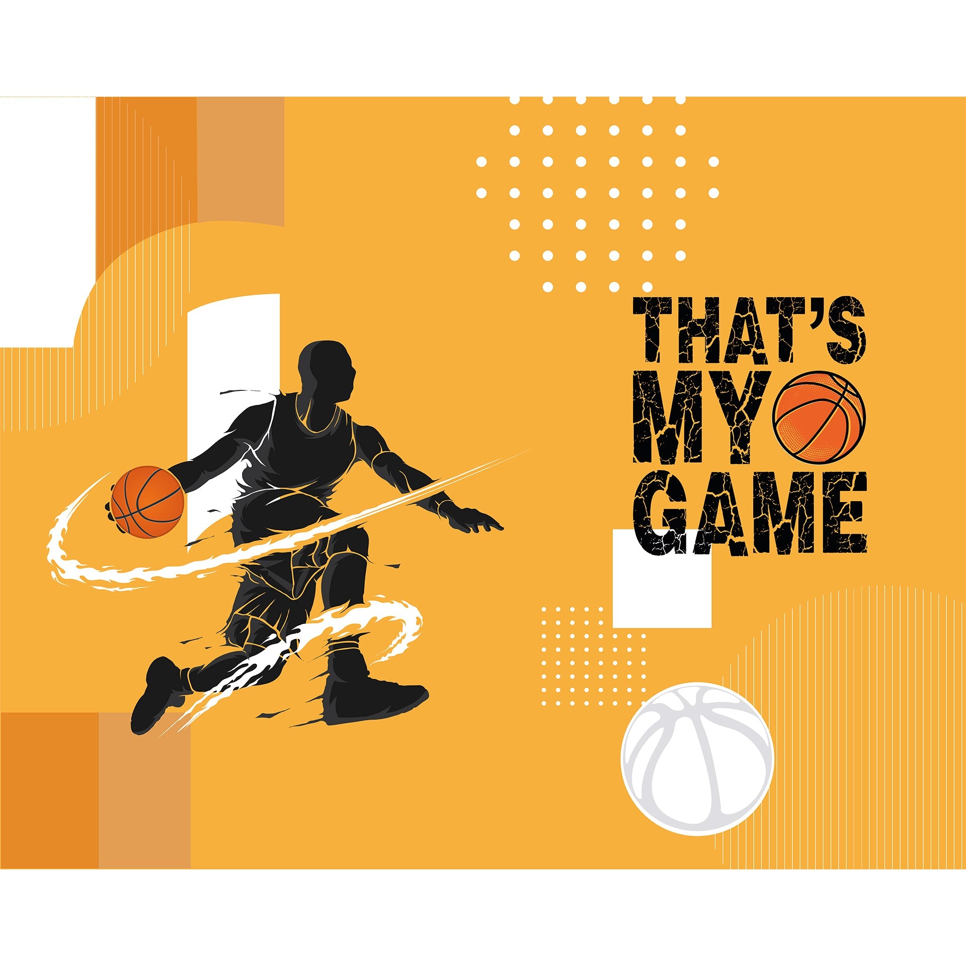 Illustrative graphic featuring a dynamic basketball player silhouette dribbling the ball, set against a vibrant background. The bold text 'That's My Game' emphasizes dedication and enthusiasm for the sport.