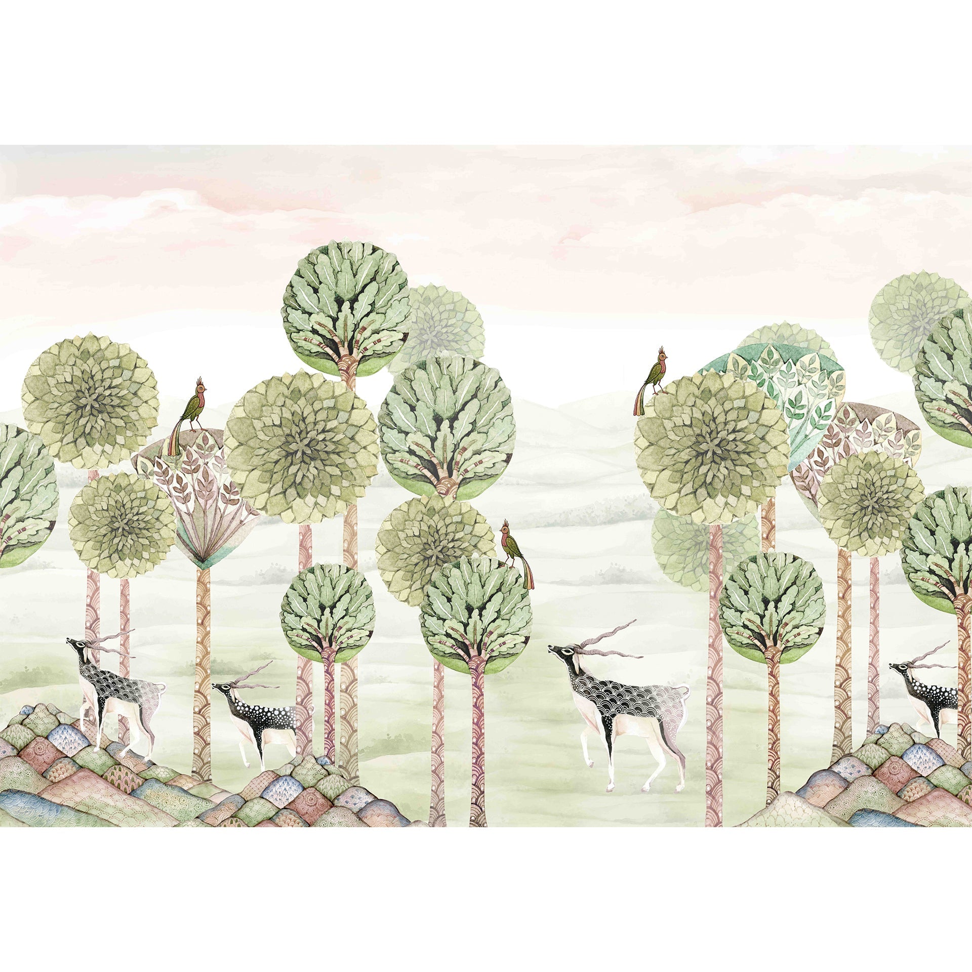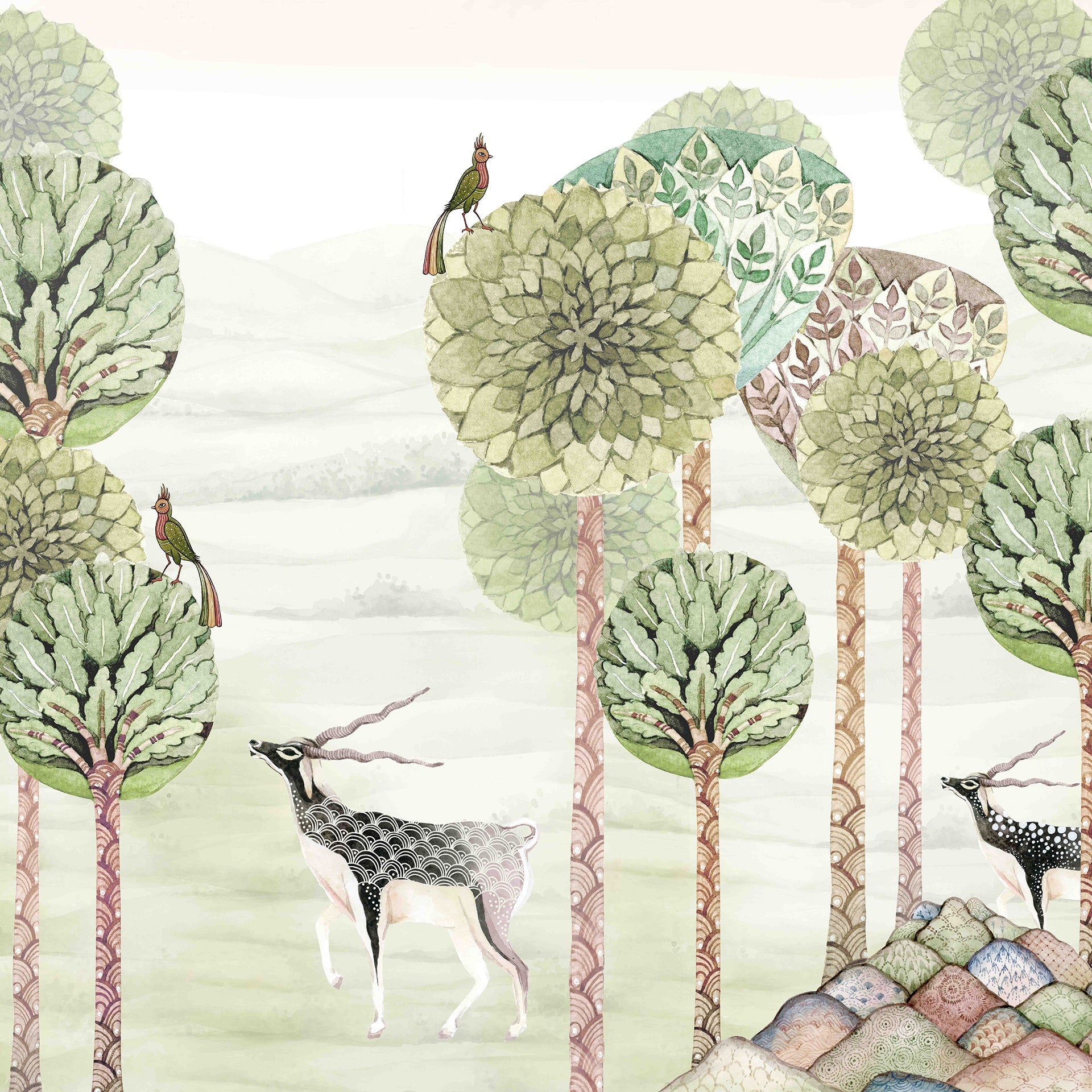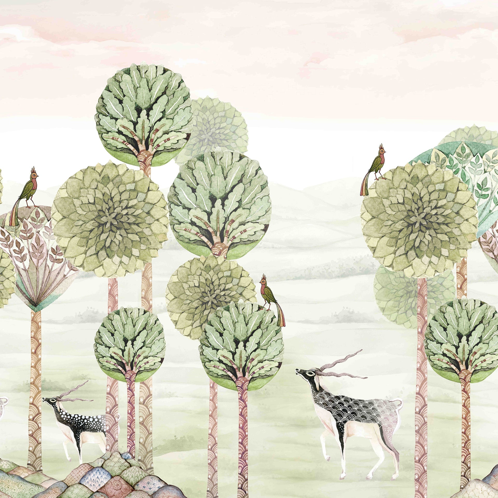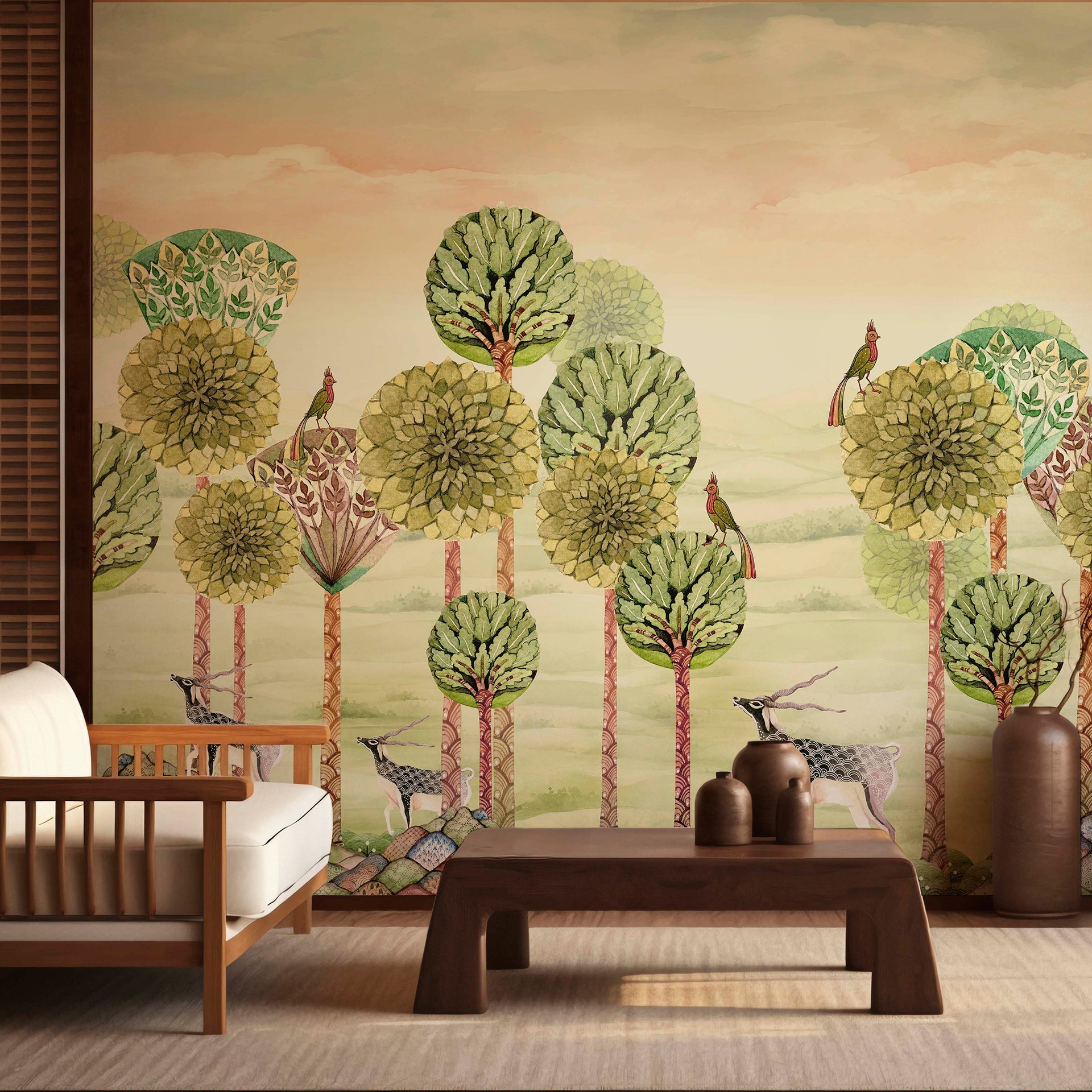 A mystical and artistic depiction of a serene nature scene featuring stylized trees, deer, and birds, blending rich textures and colors to evoke tranquility and whimsy.