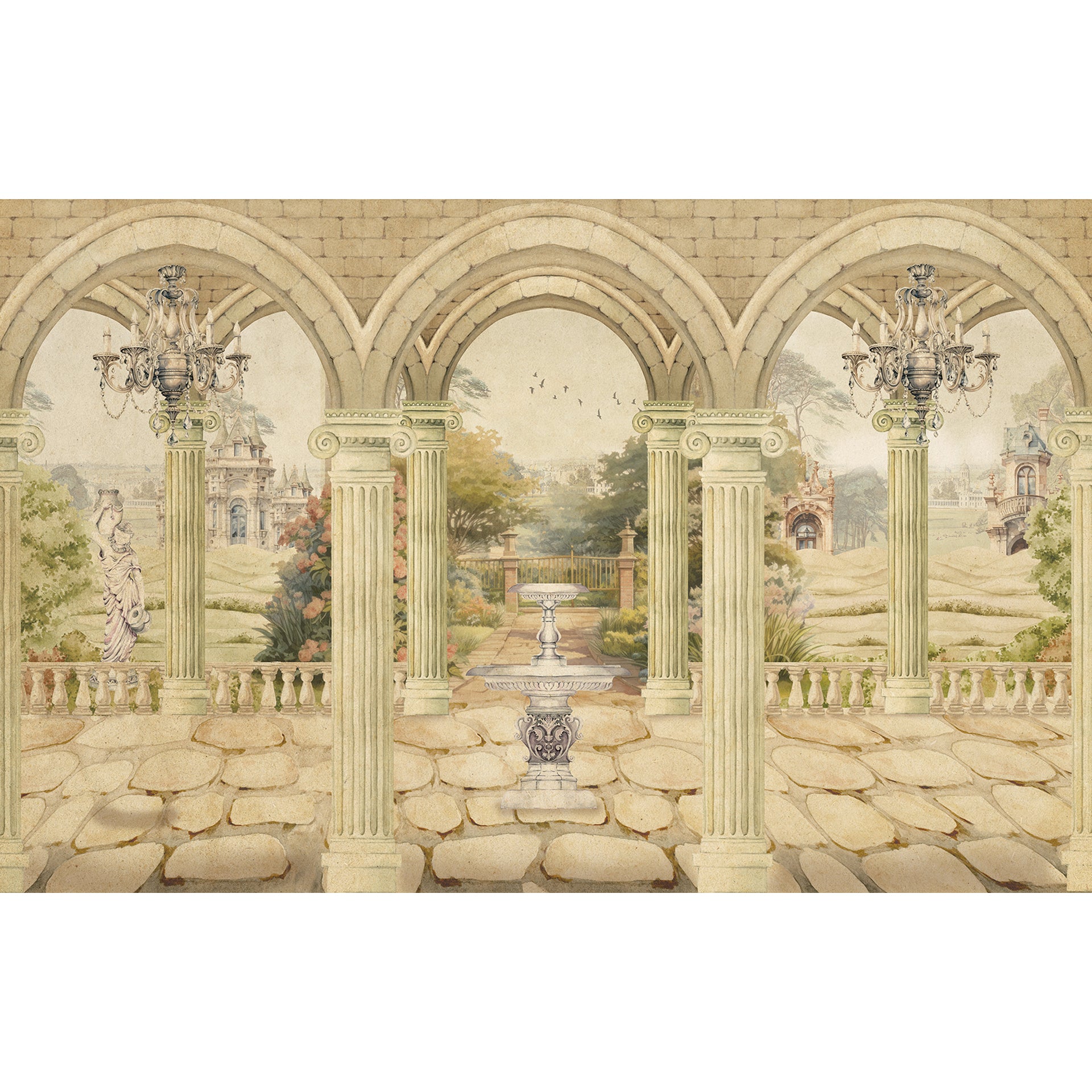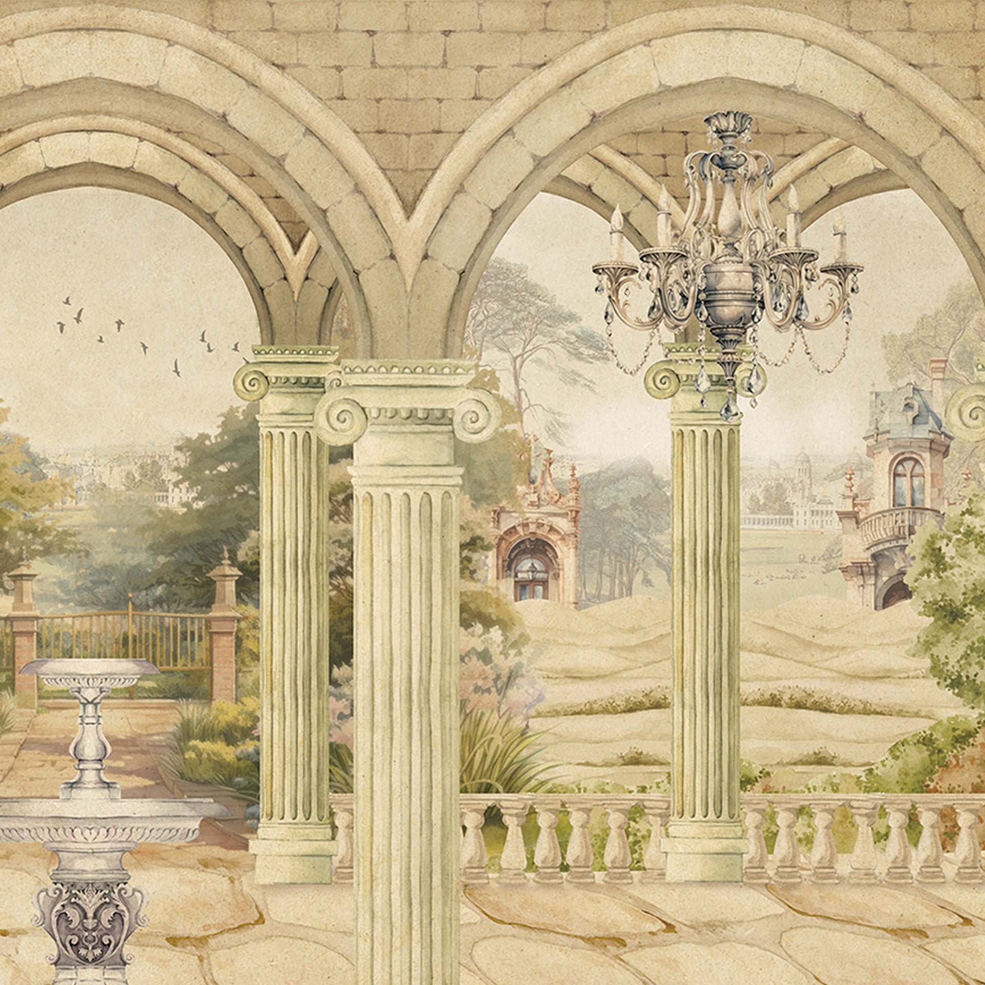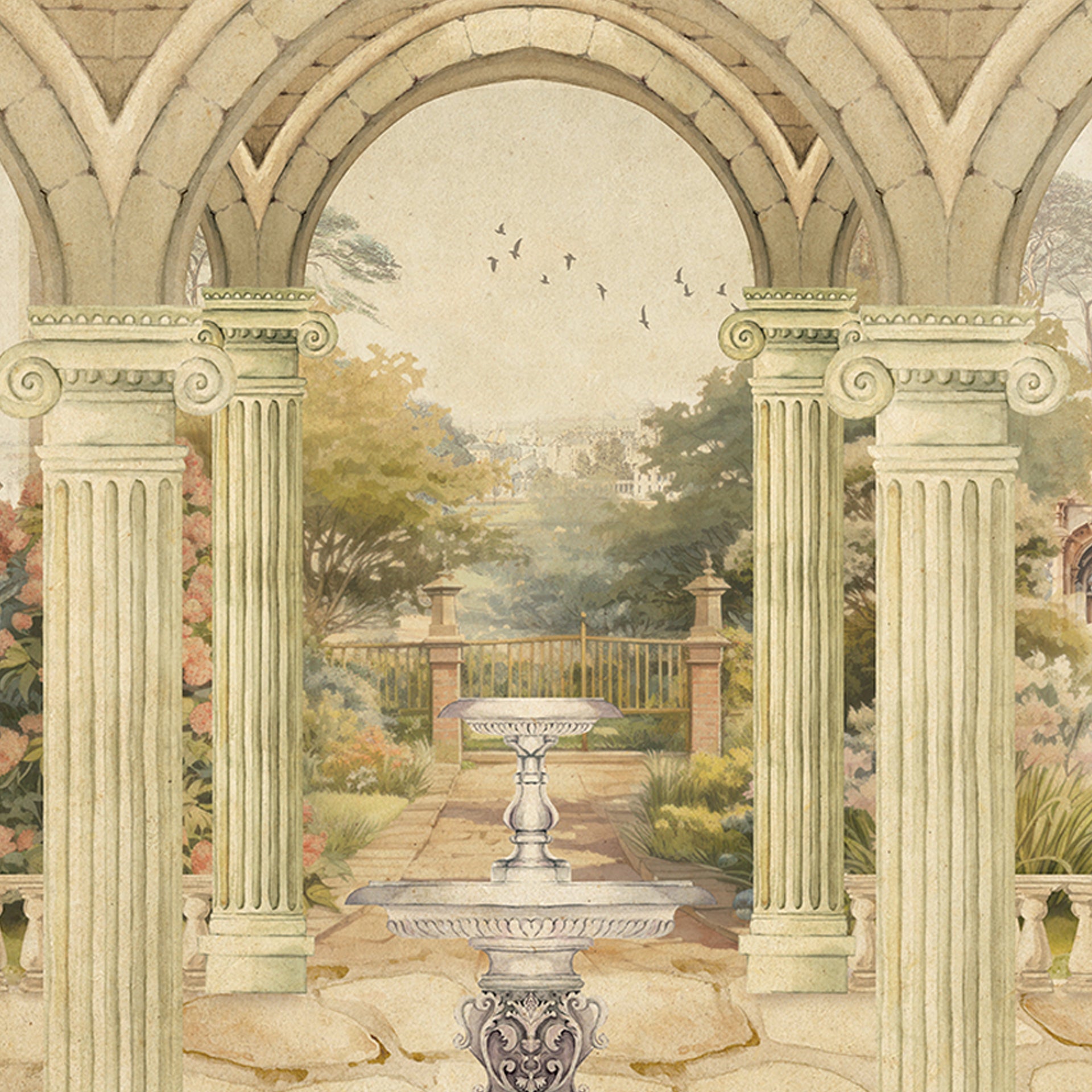 A serene, sunlit garden scene framed by arched colonnades and decorative chandeliers; stone-paved foreground leads to a sculpted fountain and distant stately structures, evoking timeless elegance and classical architecture.