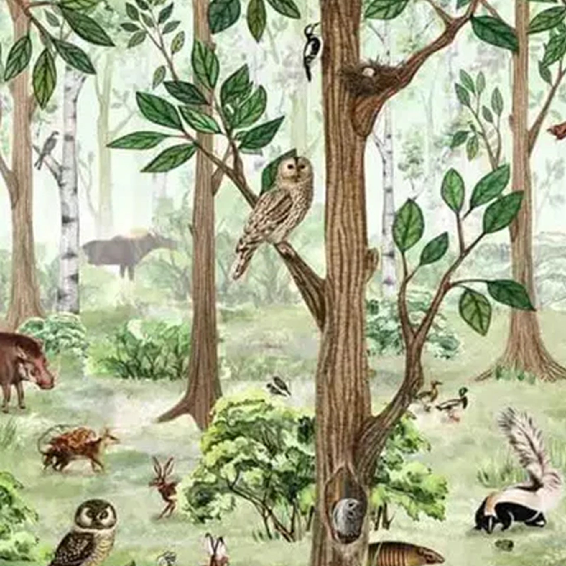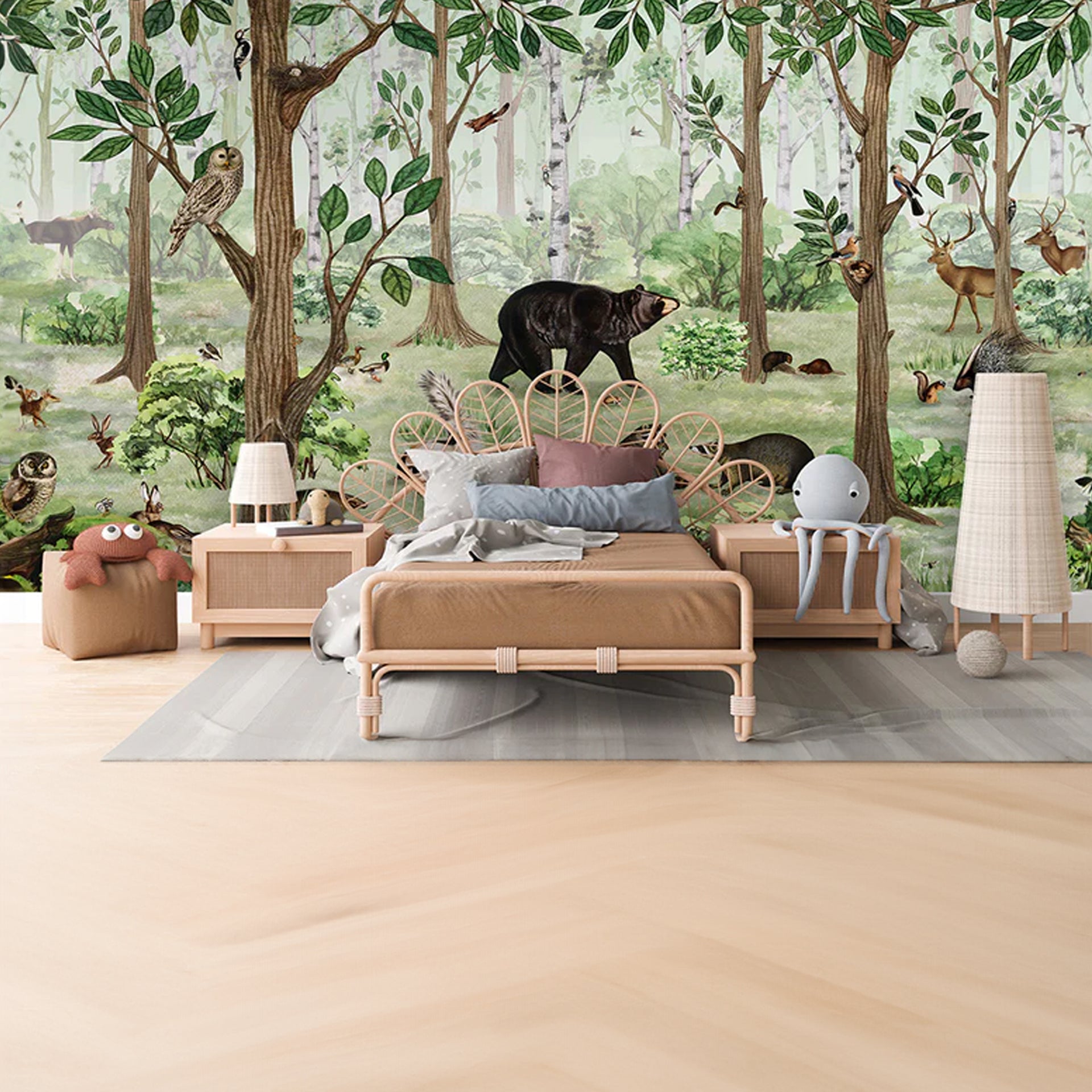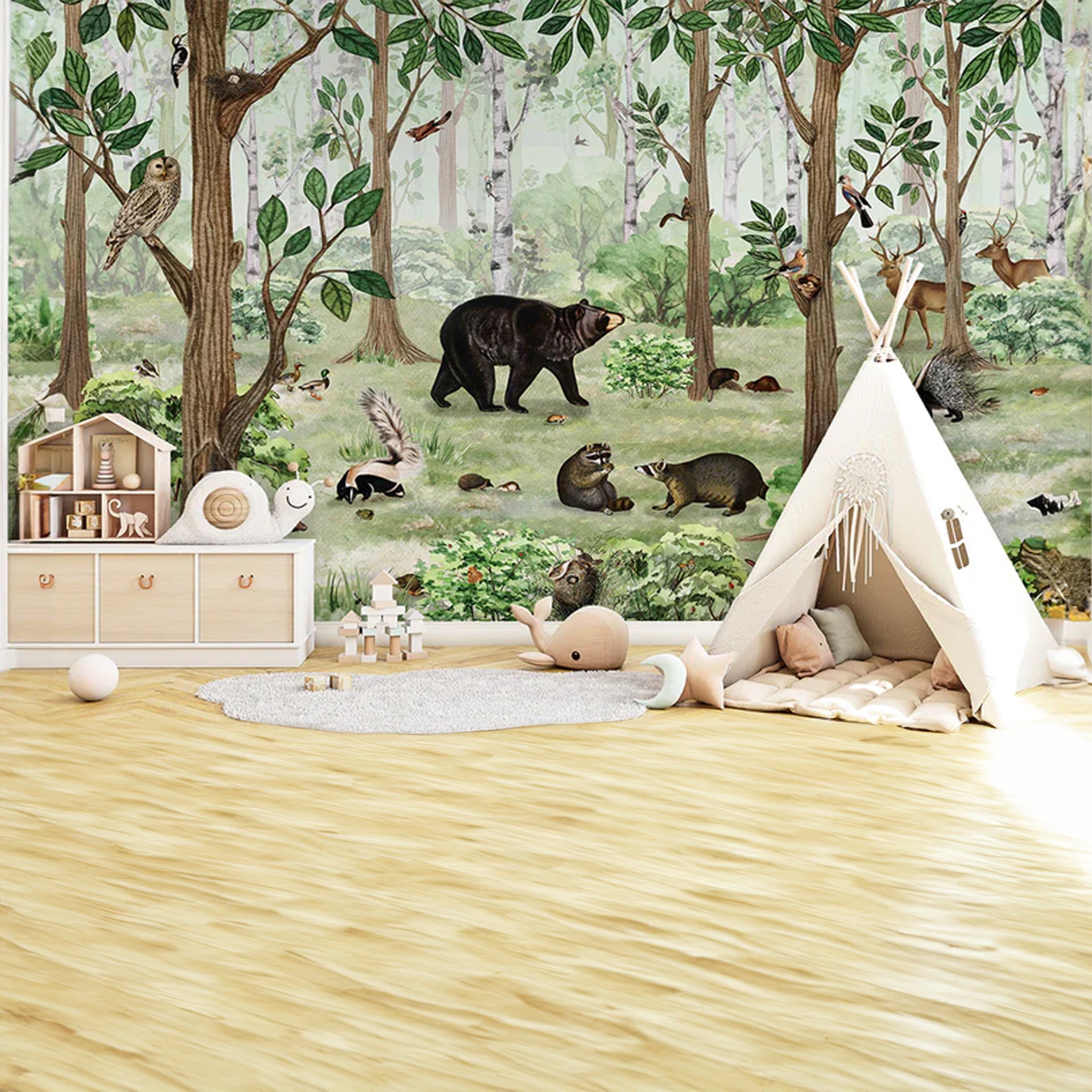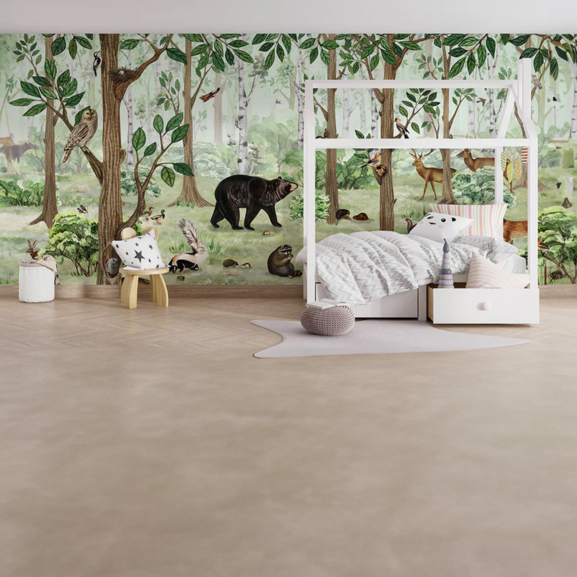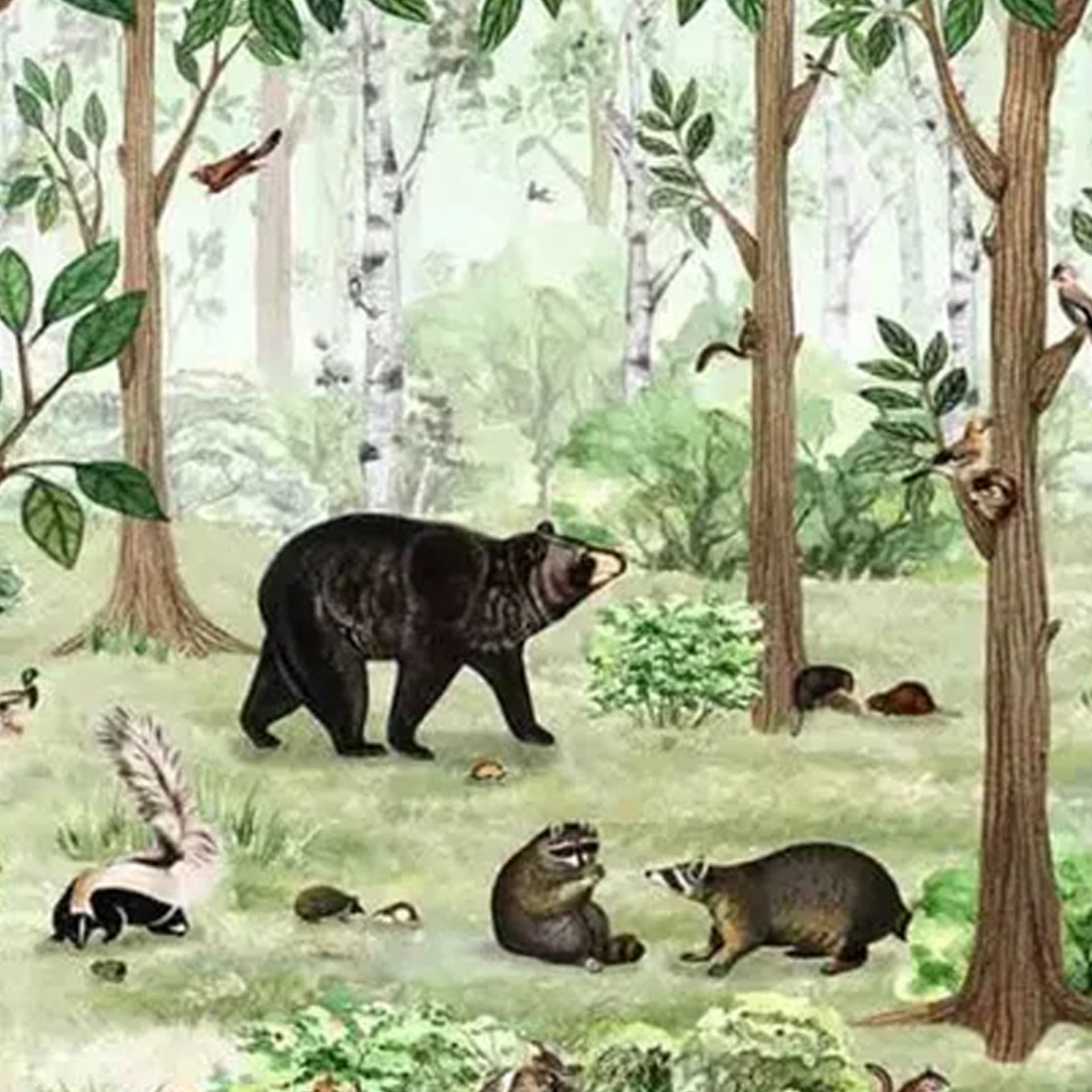 Forest-Lookbook: Panoramic Wallpaper With Diverse Wildlife Including Bears, Deer, Birds, and Squirrels-Sample