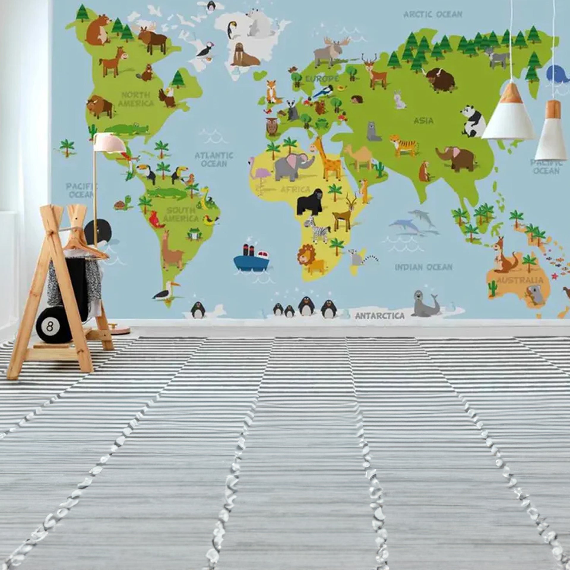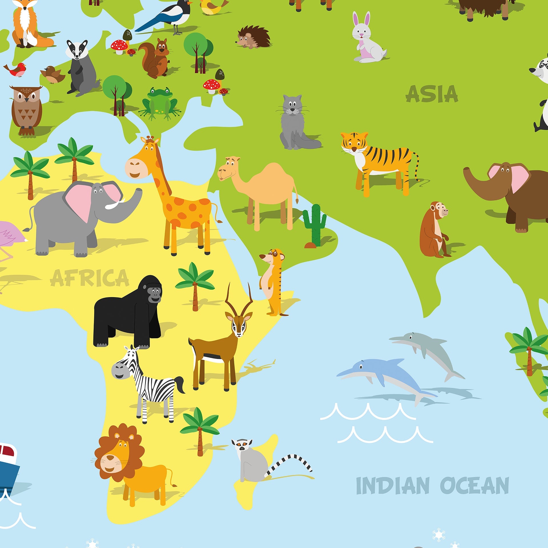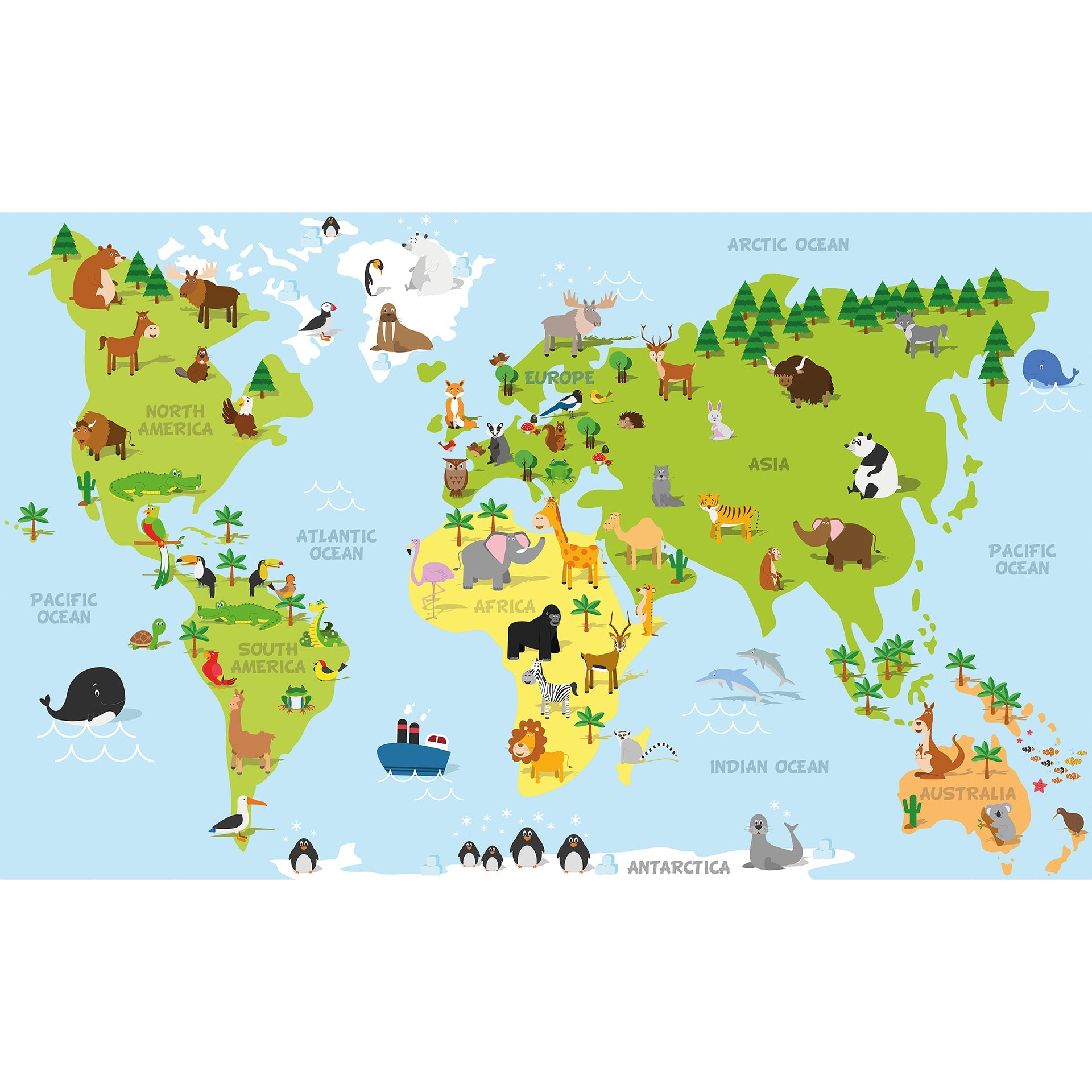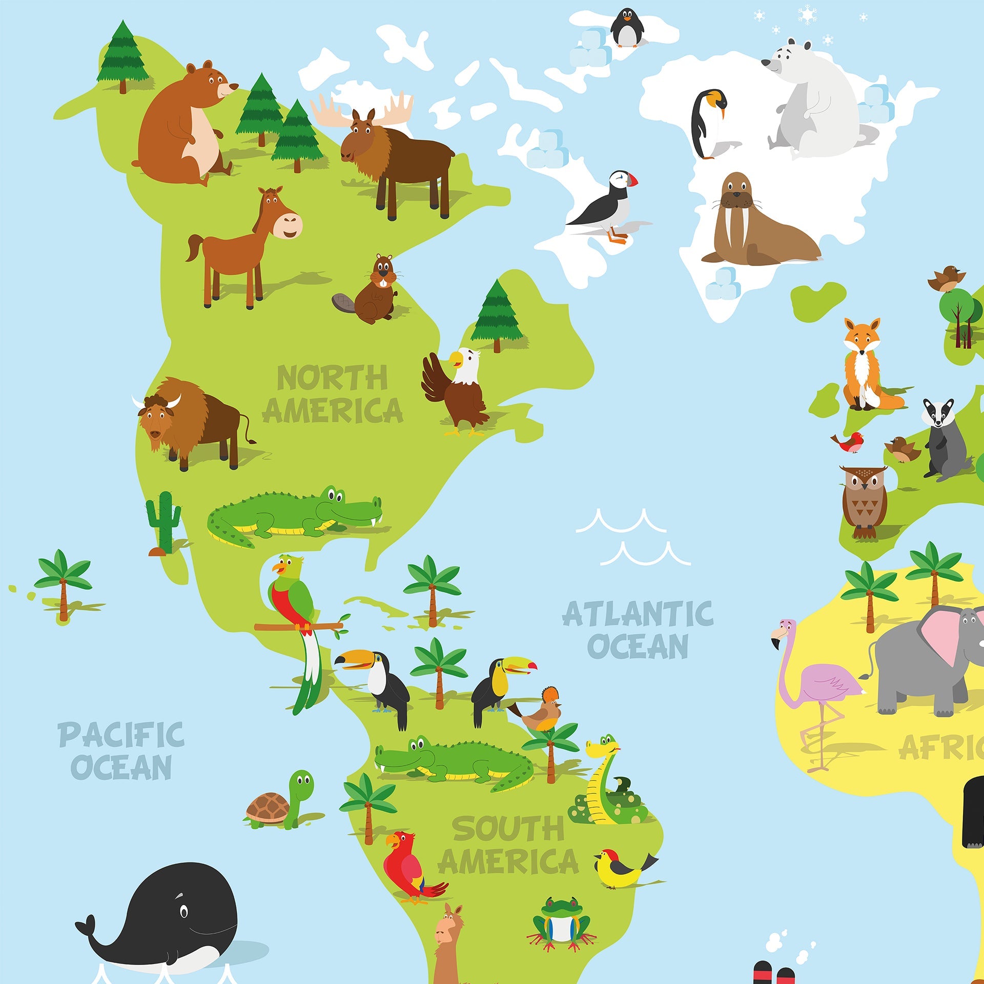 Funny cartoon world map with traditional animals of all the continents and oceans