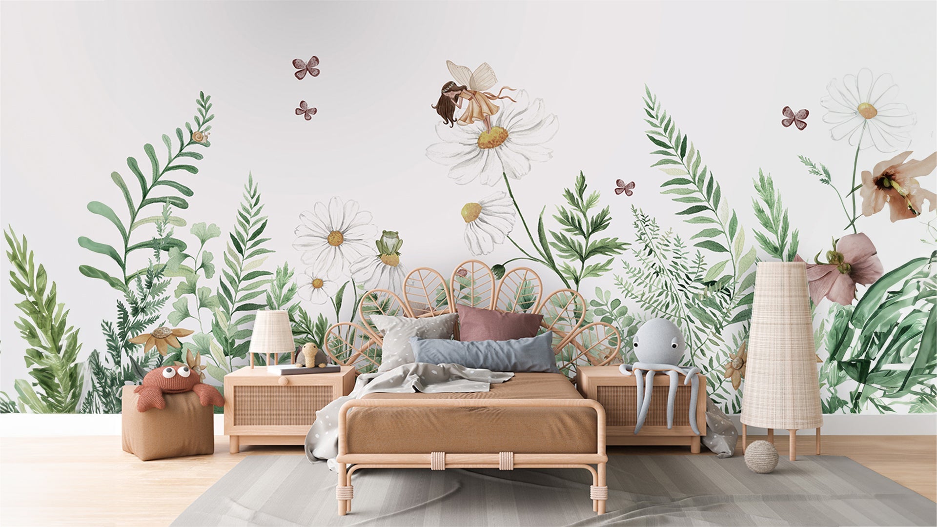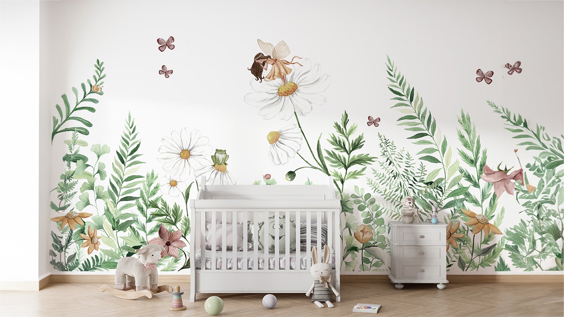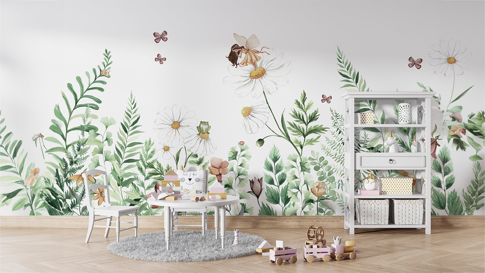Cute Fairies and Butterfly Wallpaper for Girls Room Walls – This enchanting mural features sweet little fairies, butterflies, delicate daisies, and lush ferns, adding a dreamy, whimsical touch to baby girl's nursery, bedrooms.