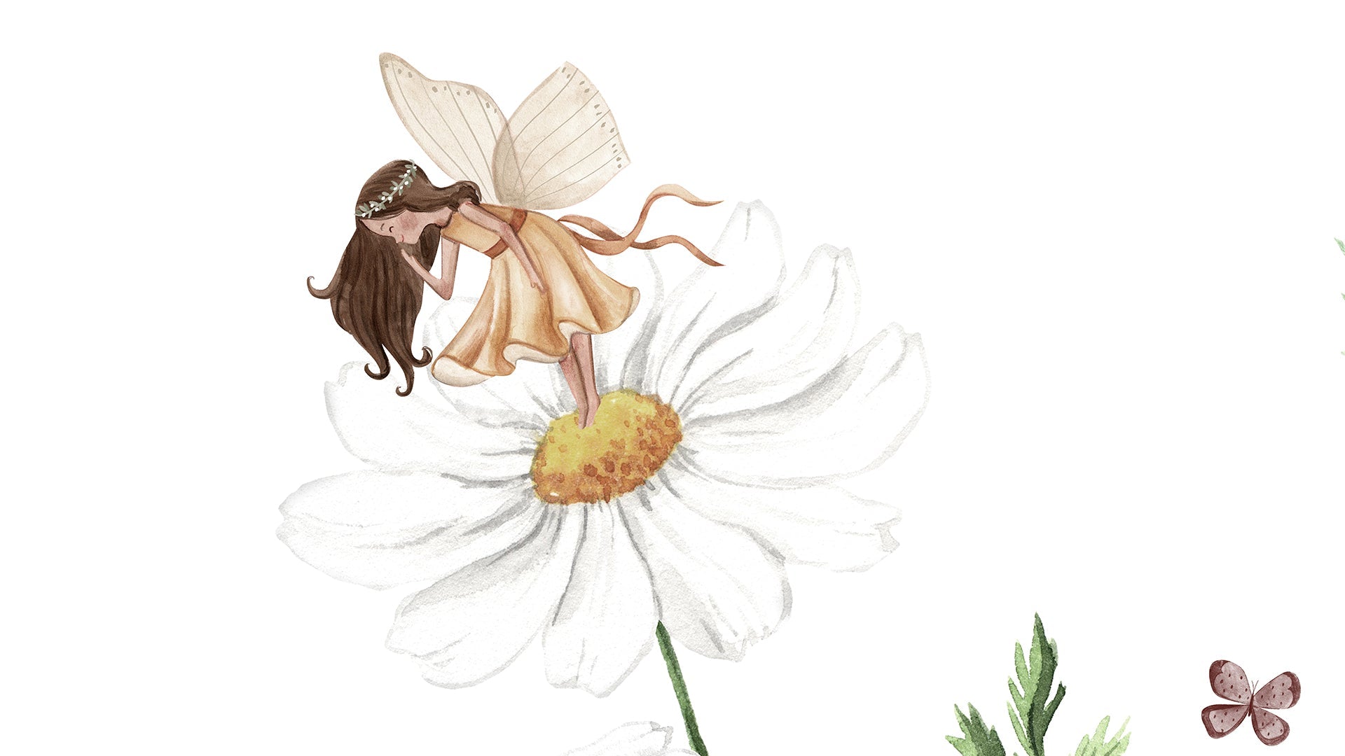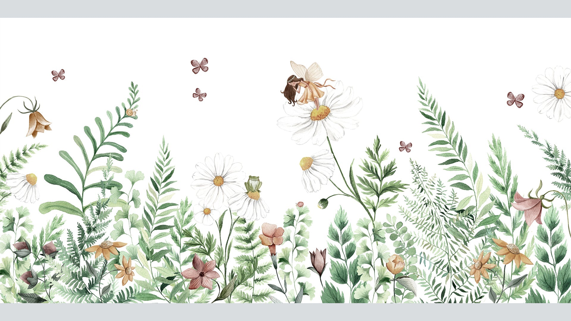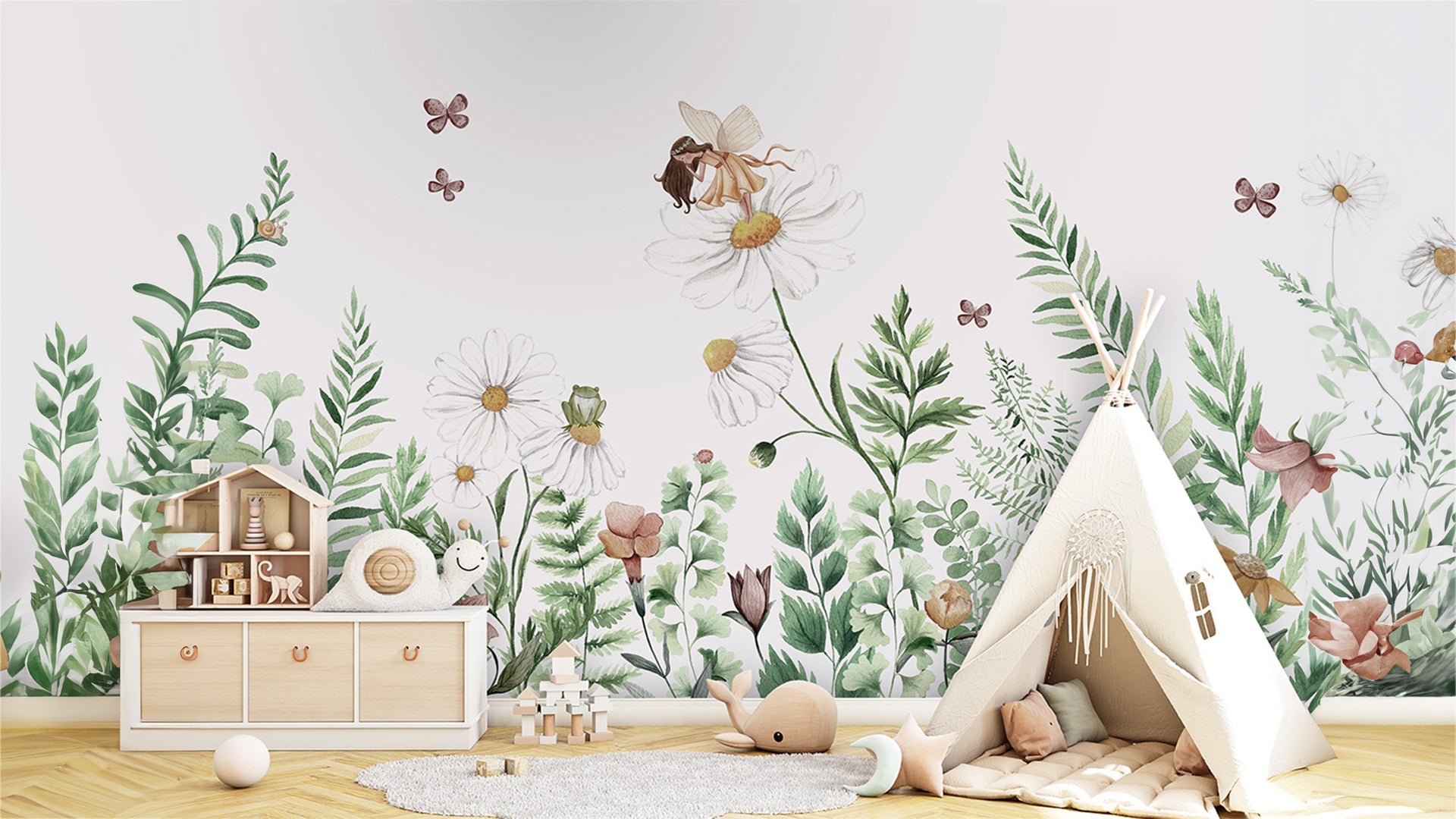 Cute Fairies and Butterfly Wallpaper for Girls Room Walls – This enchanting mural features sweet little fairies, butterflies, delicate daisies, and lush ferns, adding a dreamy, whimsical touch to baby girl's nursery, bedrooms.