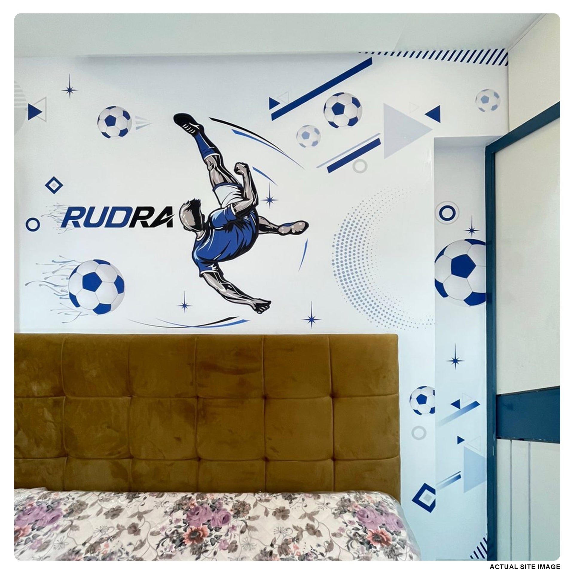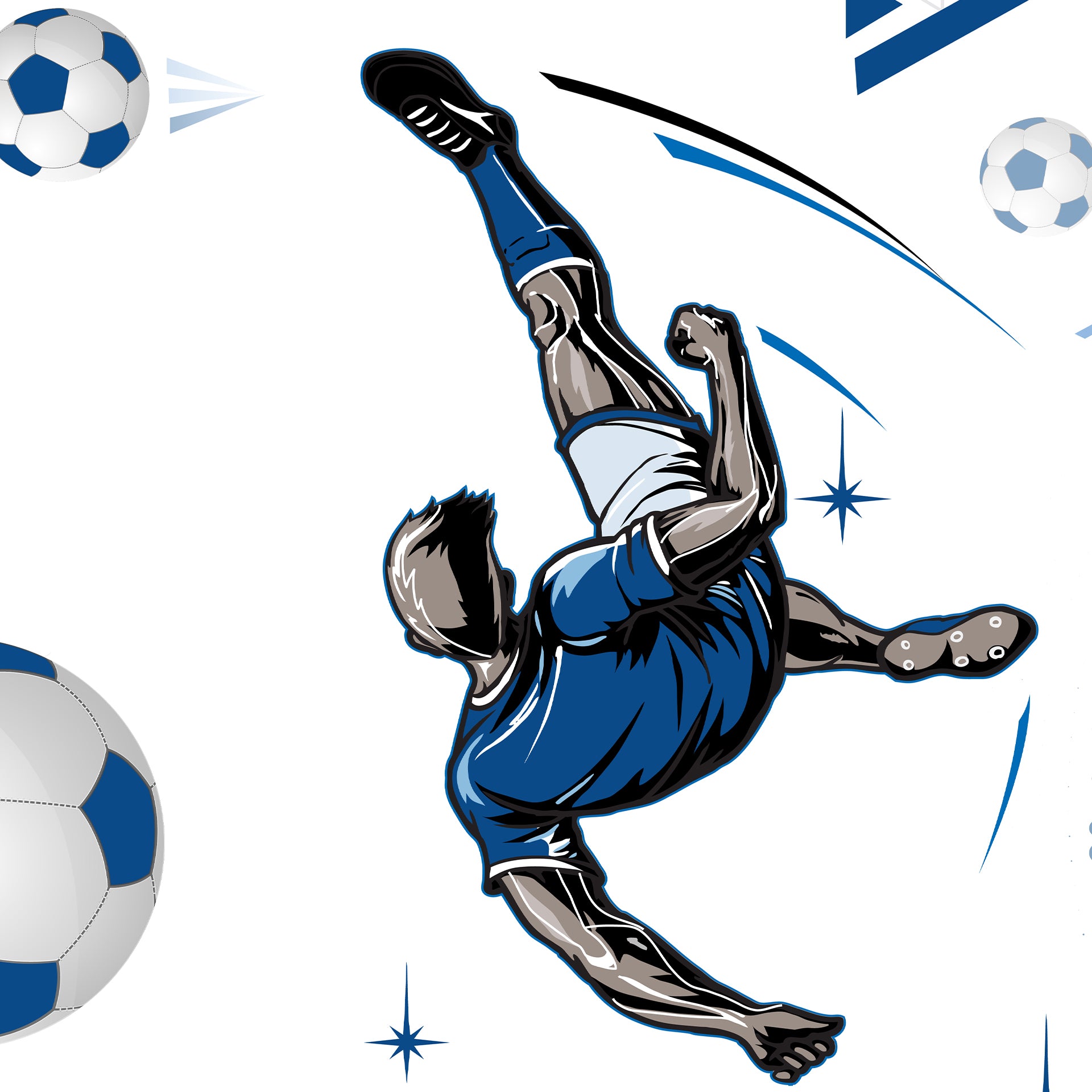 Vibrant, modern artwork featuring a soccer player mid-kick surrounded by blue geometric shapes, motion trails, and orbiting balls. Energetic and athletic, it conveys speed, movement, and competitive spirit.