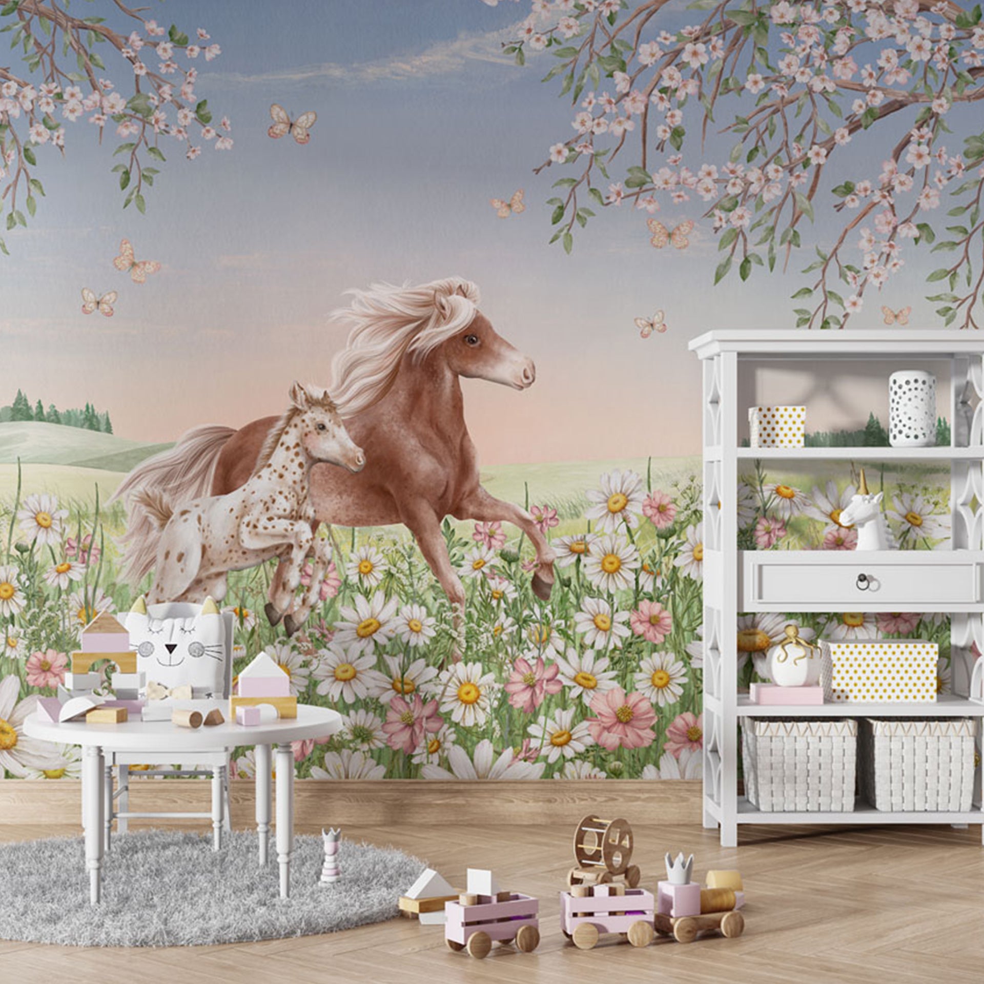 A tranquil spring scene features a brown horse and foal galloping through a daisy-filled meadow, framed by cherry blossoms and fluttering butterflies beneath a soft pastel sky.