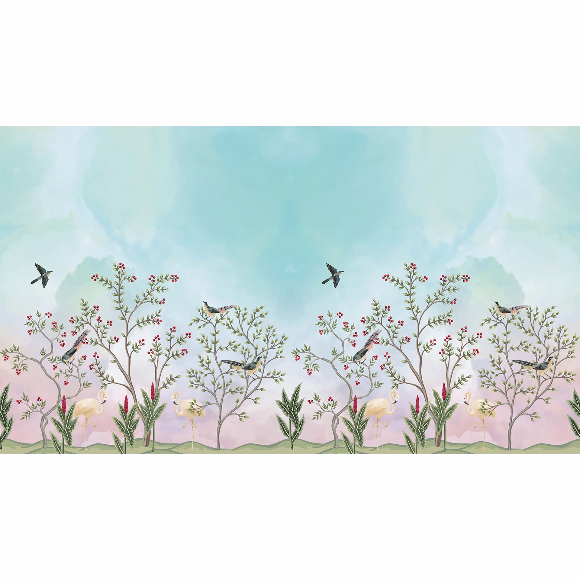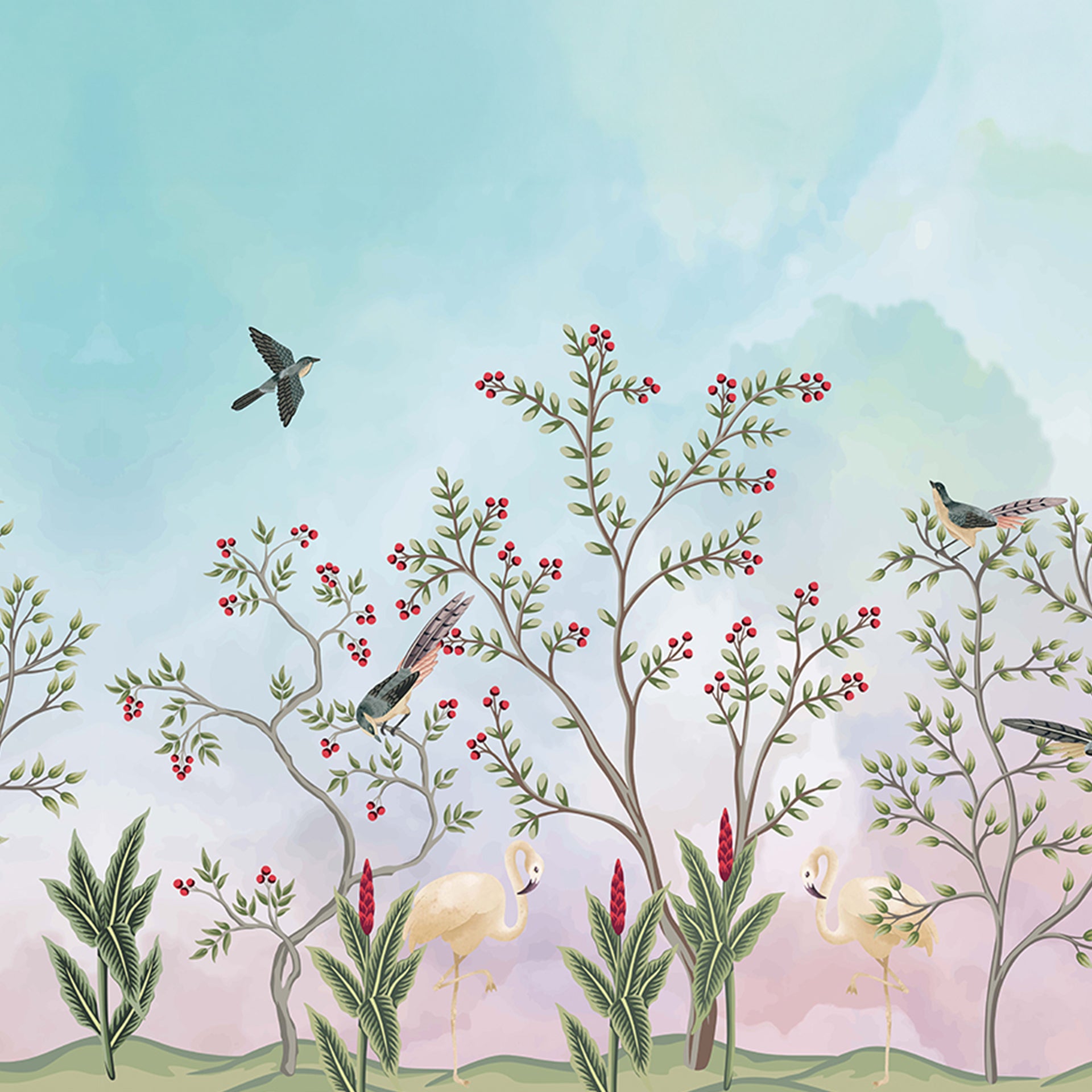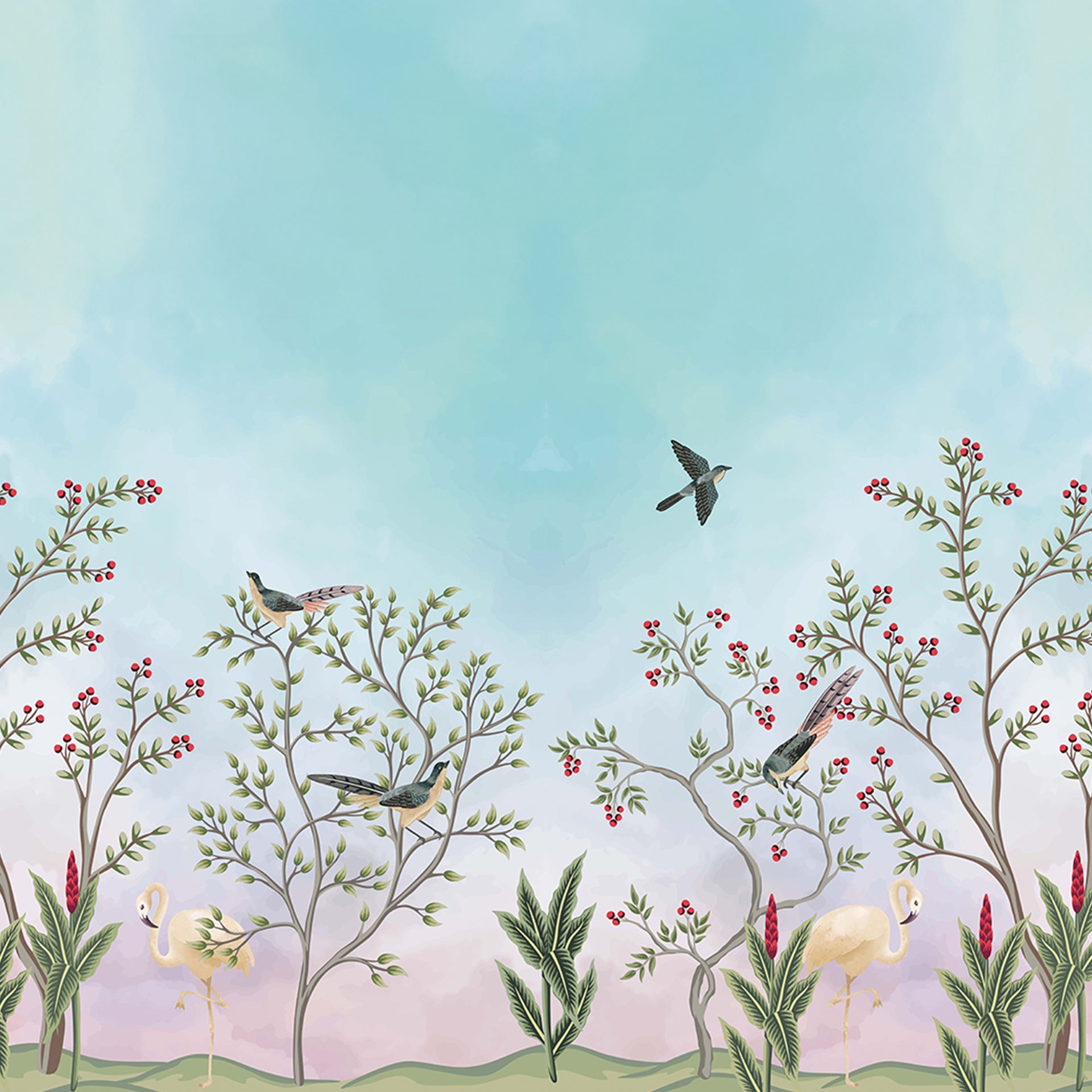 This design has a garden with trees bearing fruits and birds perched on top of the trees. The highlight of the design is the pair of white flamingos sitting under the trees. All the elements come together beautifully and create a stunning wallpaper