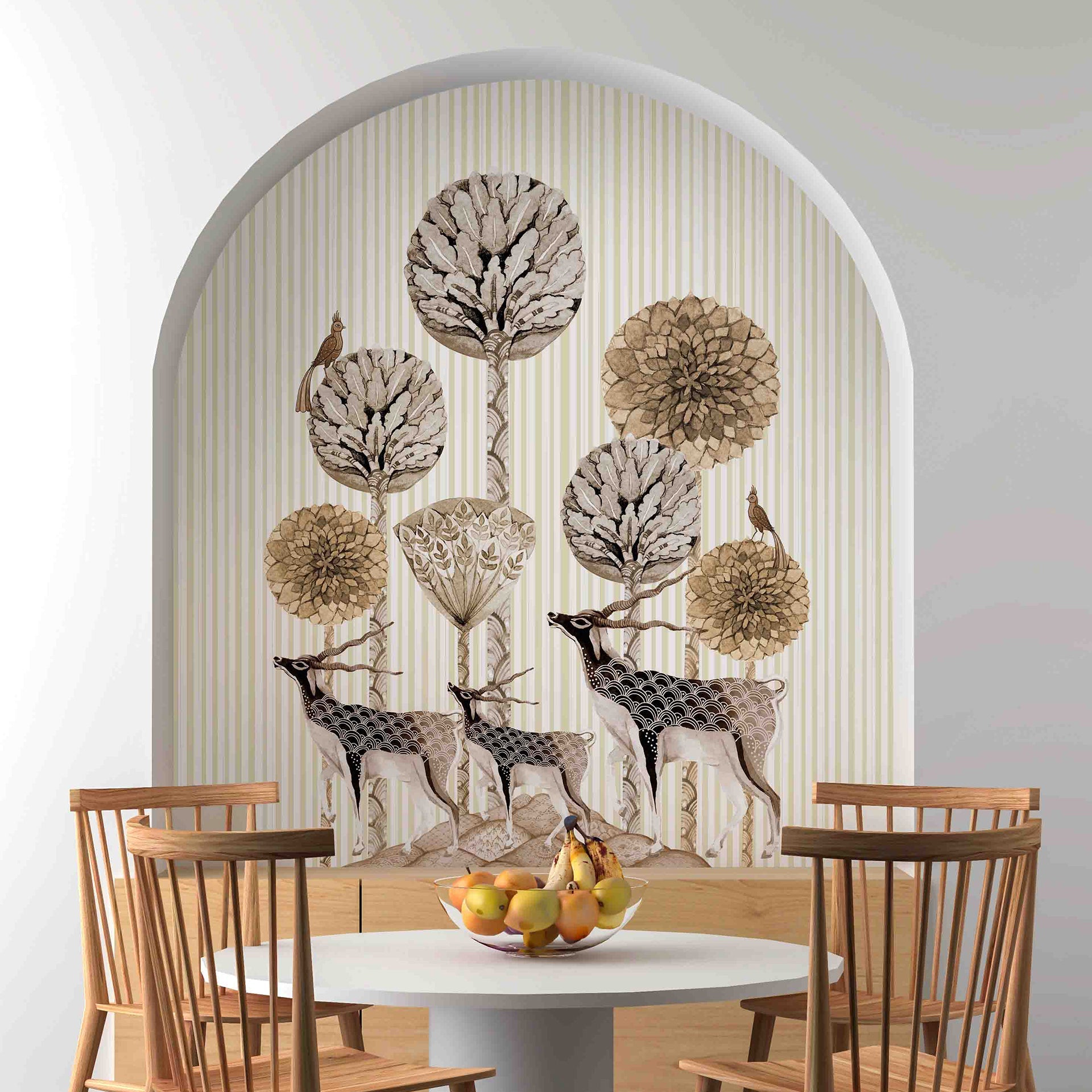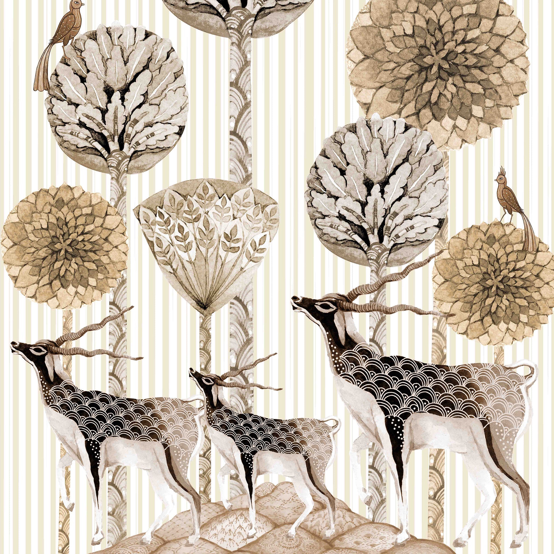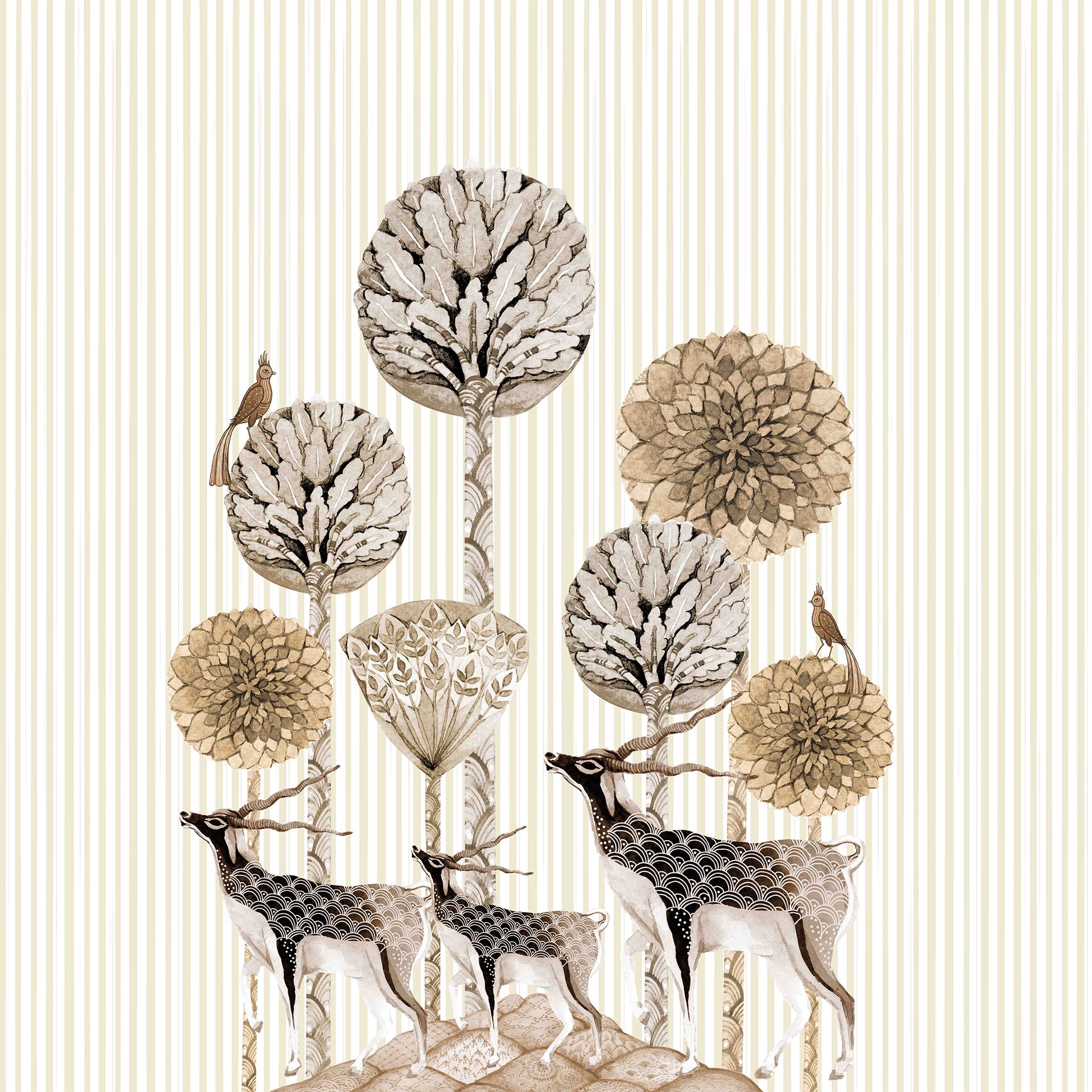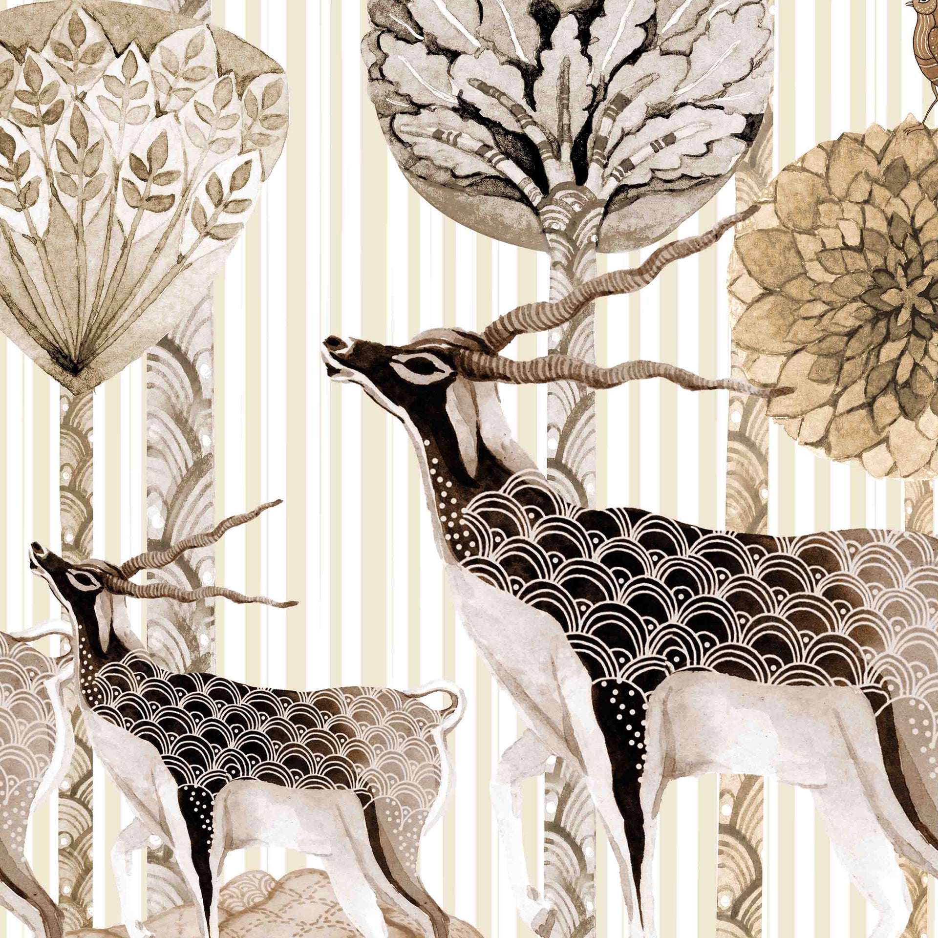 A detailed artistic composition featuring deer, stylized botanical elements, and perched birds, with a serene and harmonious design emphasized by a beige-toned background.