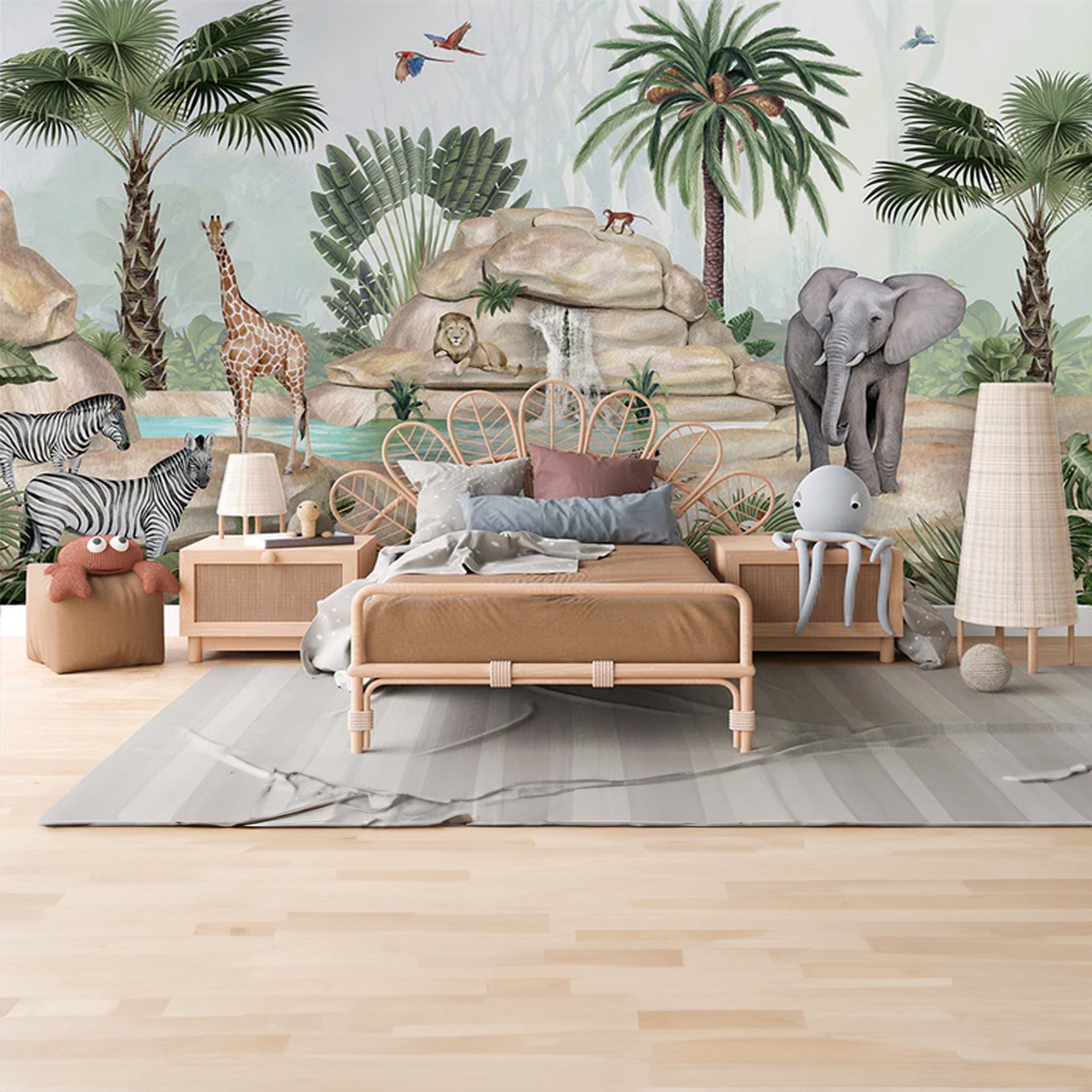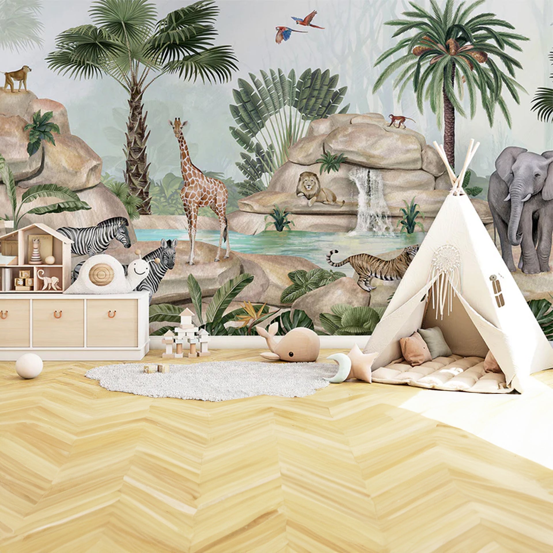 A lush jungle scene featuring elephants, giraffes, zebras, tigers, and a lion by rocks and a waterfall, surrounded by palm trees and tropical plants for a vibrant wildlife setting.
