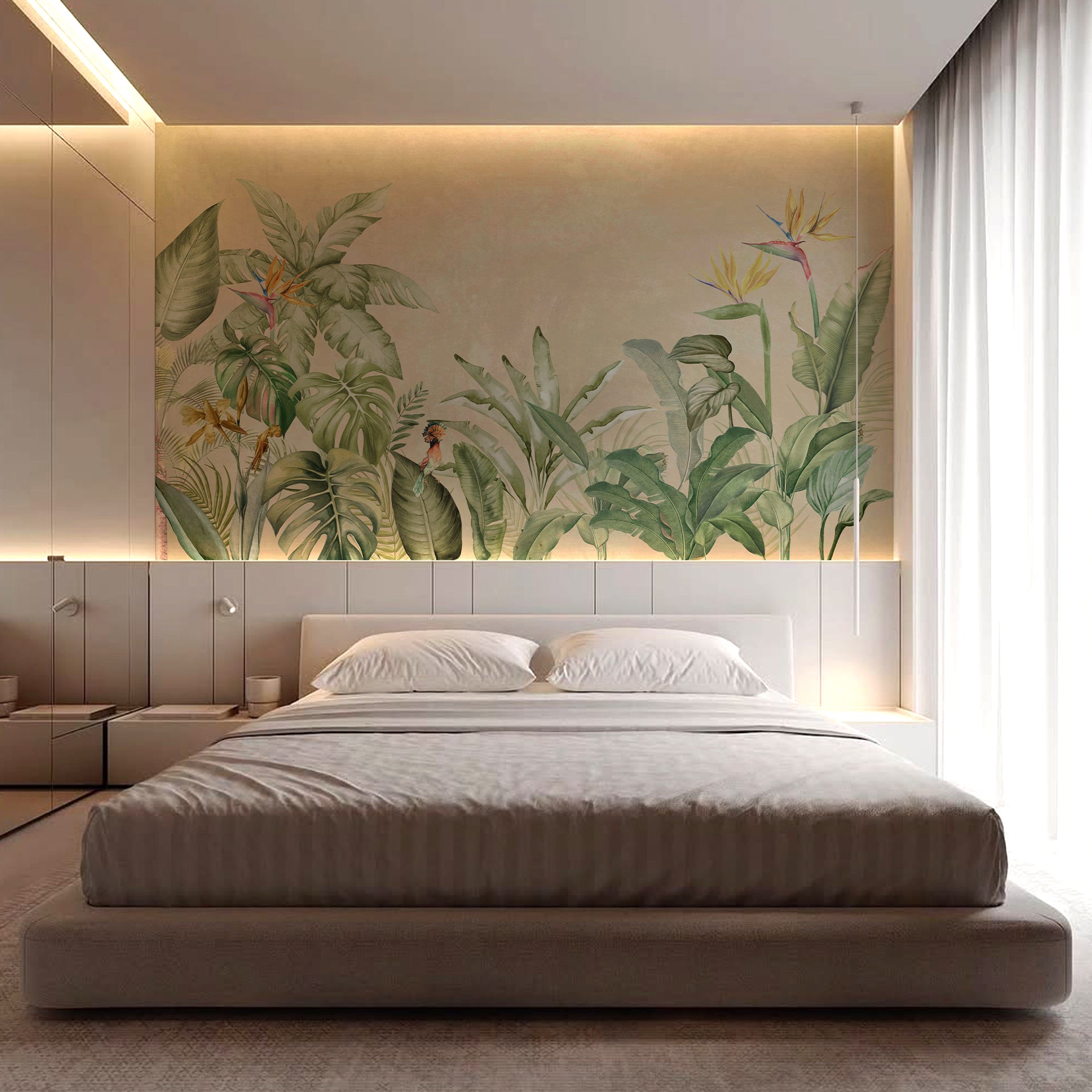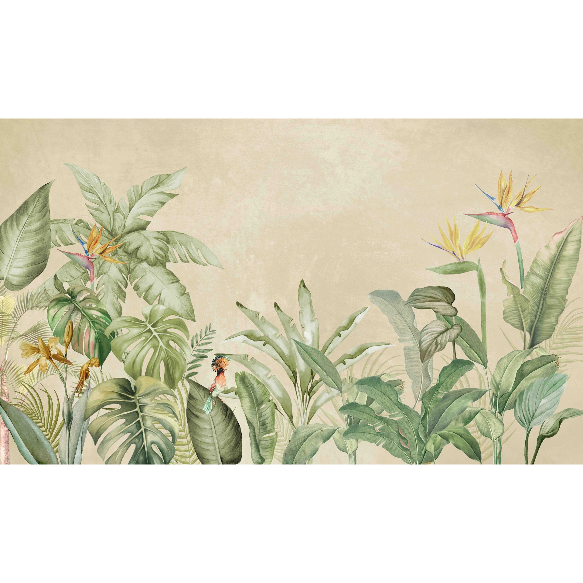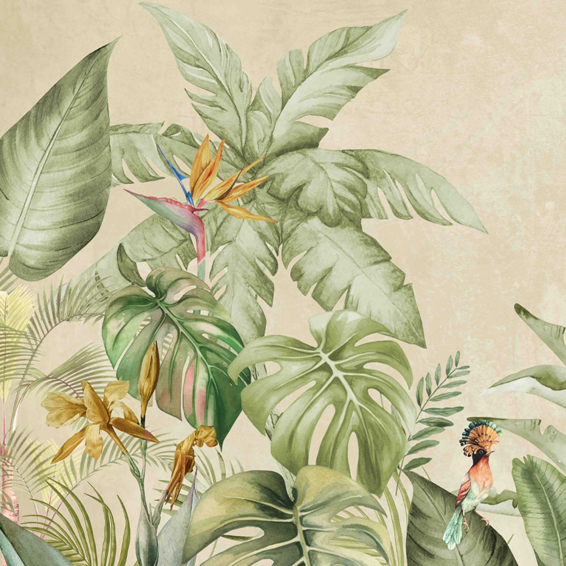 A watercolor-inspired jungle scene featuring large green leaves, tropical plants, and a small colorful bird. Soft beige background creates a warm, vintage, nature-inspired backdrop perfect for decor and editorial uses.