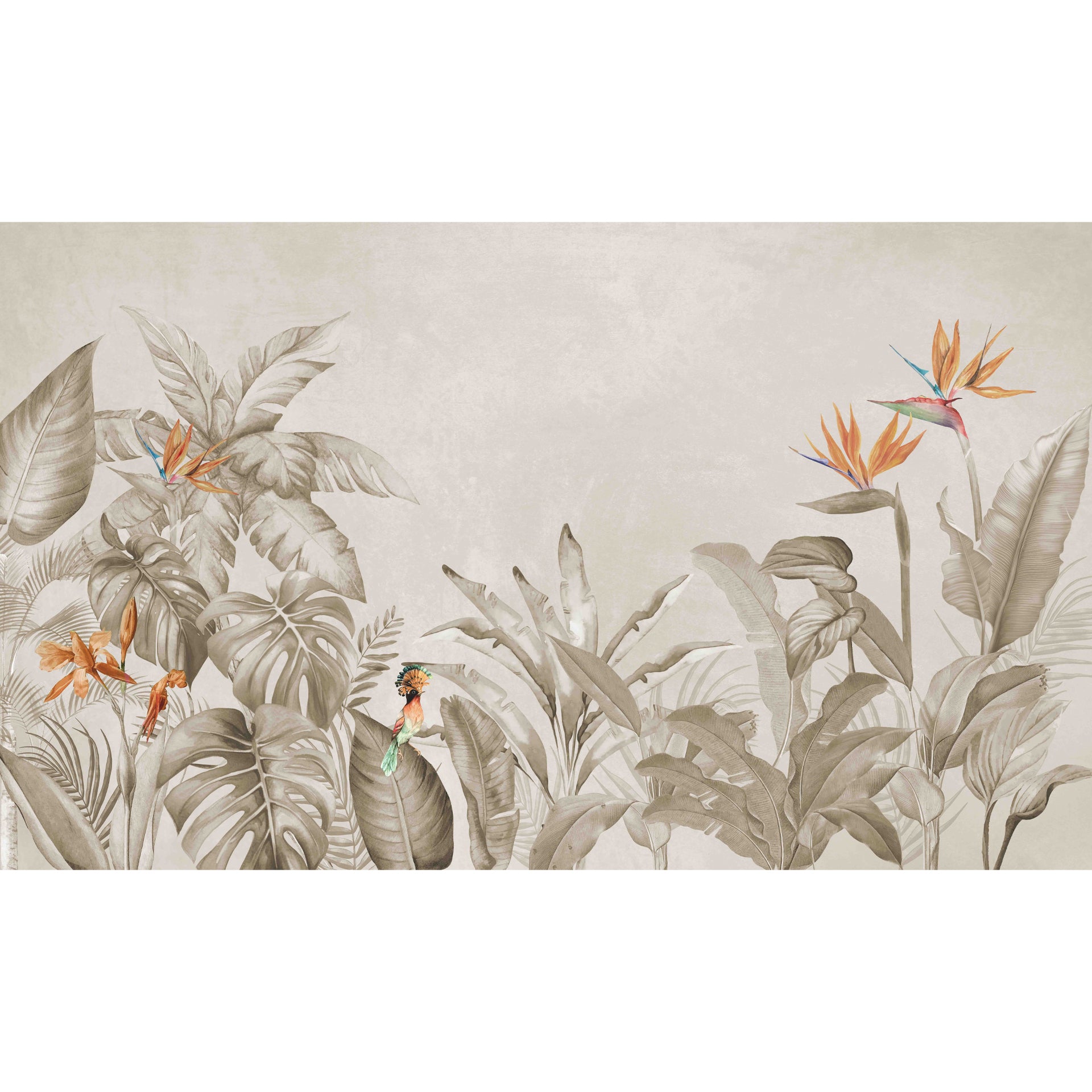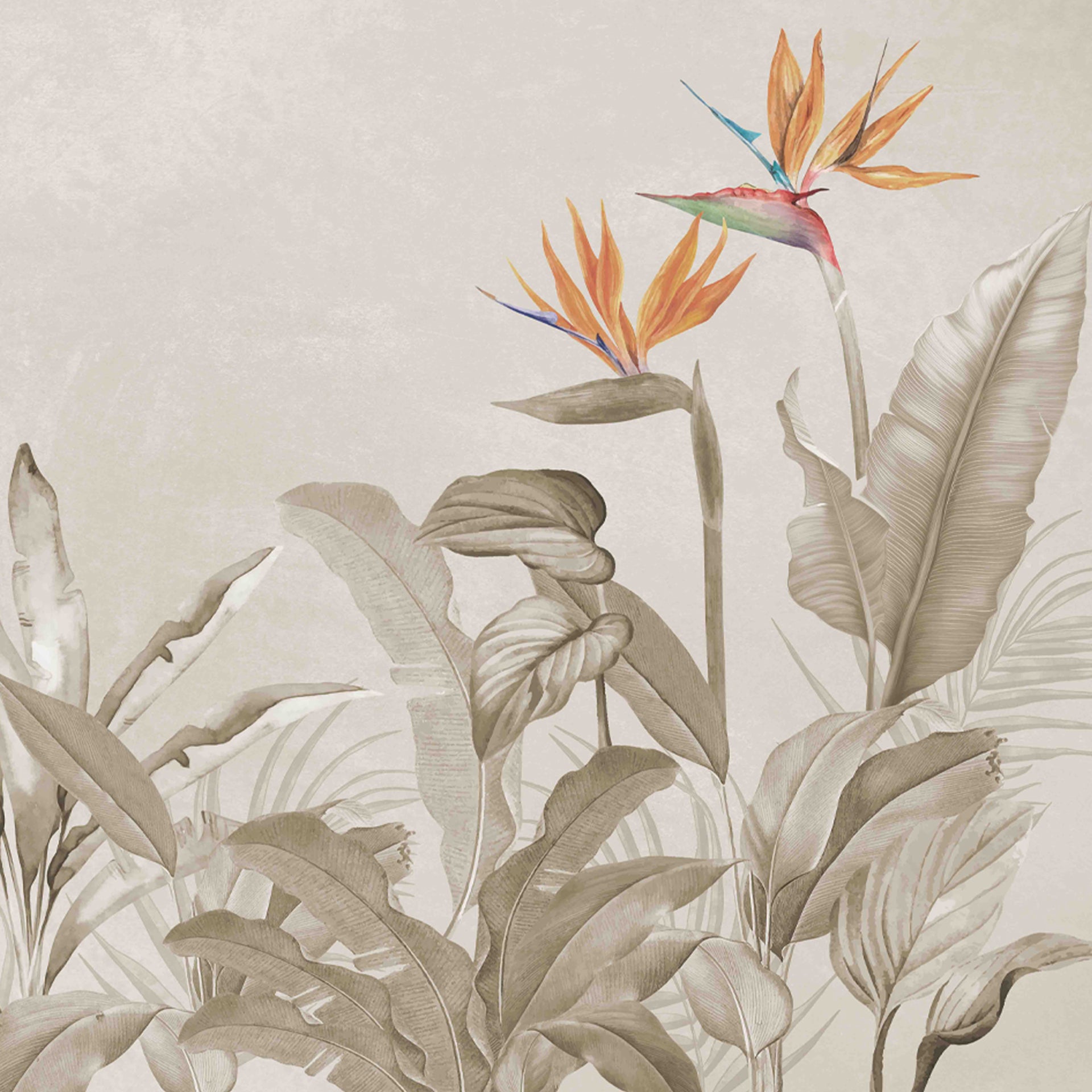 A serene sepia-toned jungle scene featuring lush tropical leaves and vibrant birds of paradise. This botanical artwork evokes calm, nature, and exotic appeal, ideal for wall art and nature decor.
