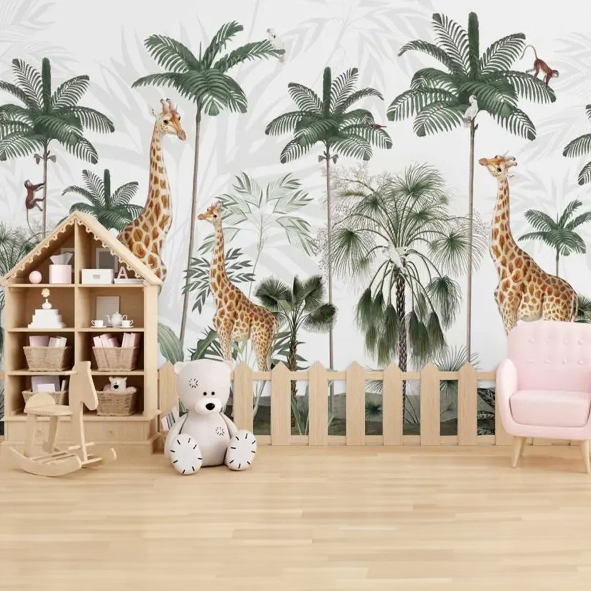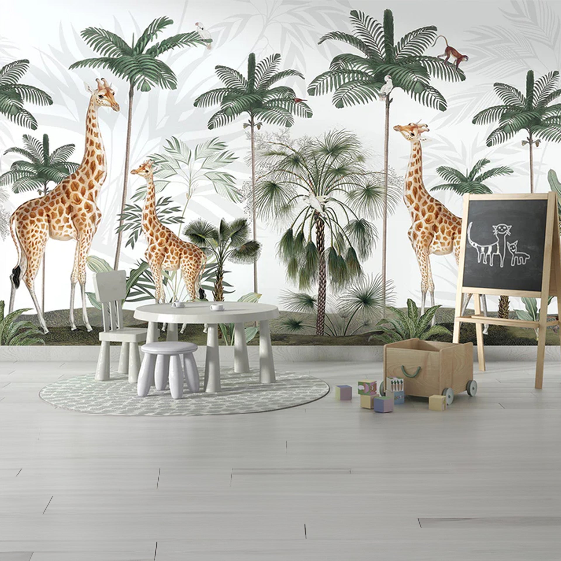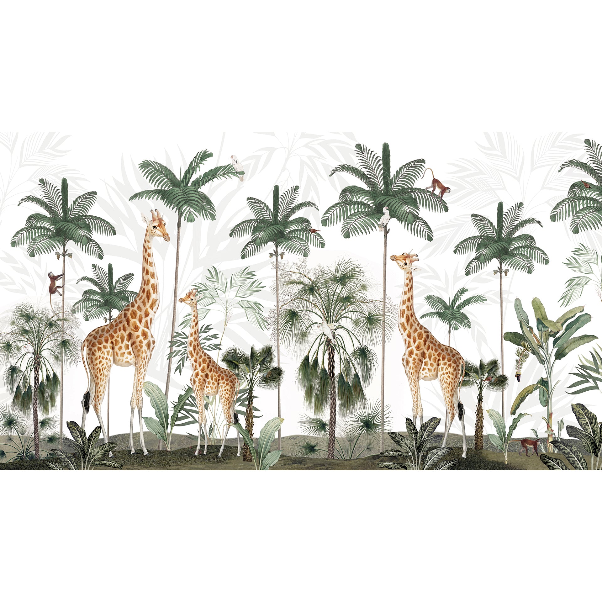 A charming tropical jungle backdrop featuring tall giraffes amid palm trees, lush foliage, and scattered wildlife. Ideal for nature, wildlife, family, travel, or educational imagery in editorial or decorative projects.