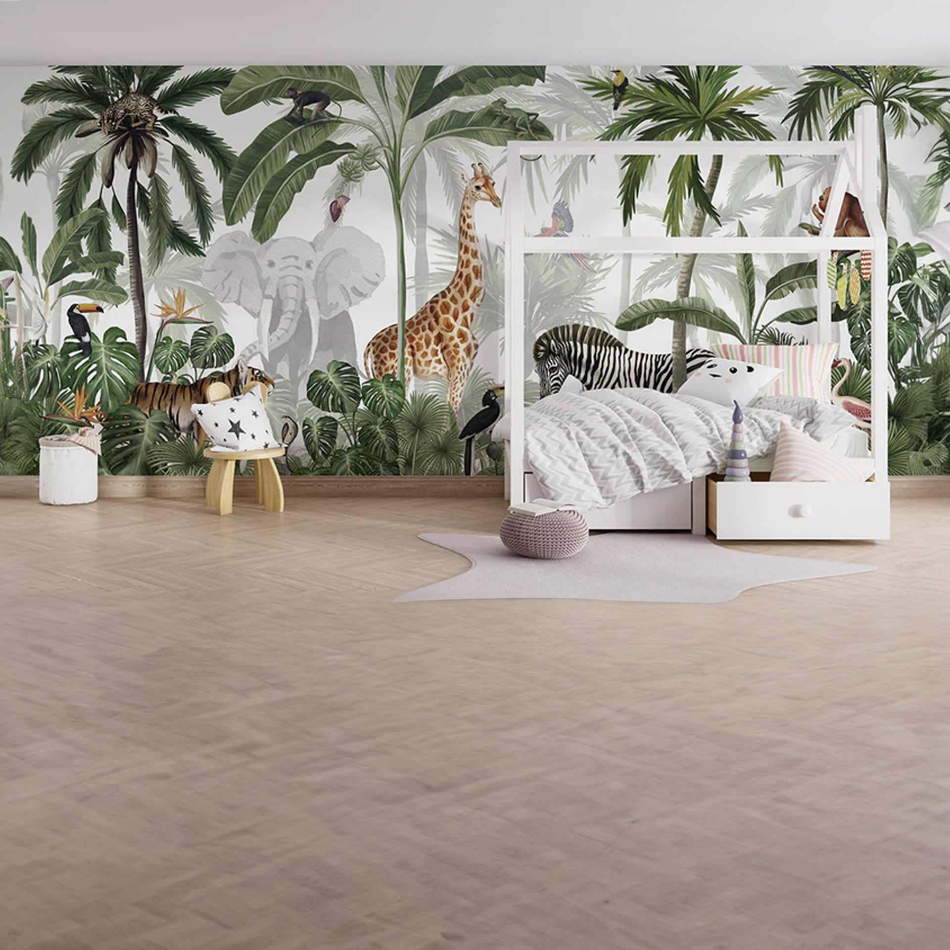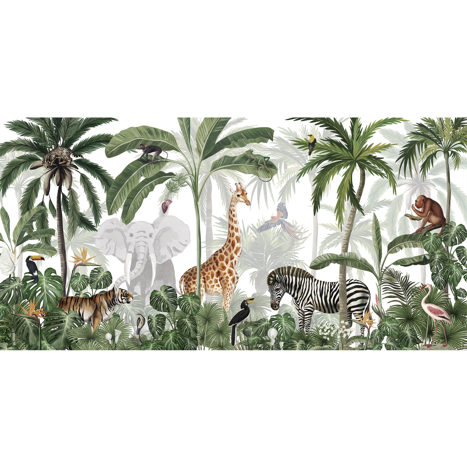 A lively tropical jungle illustration featuring giraffe, zebra, tiger, monkey, parrot, elephant silhouette, and dense green palm trees, capturing wild wildlife and lush foliage in a peaceful rainforest setting.