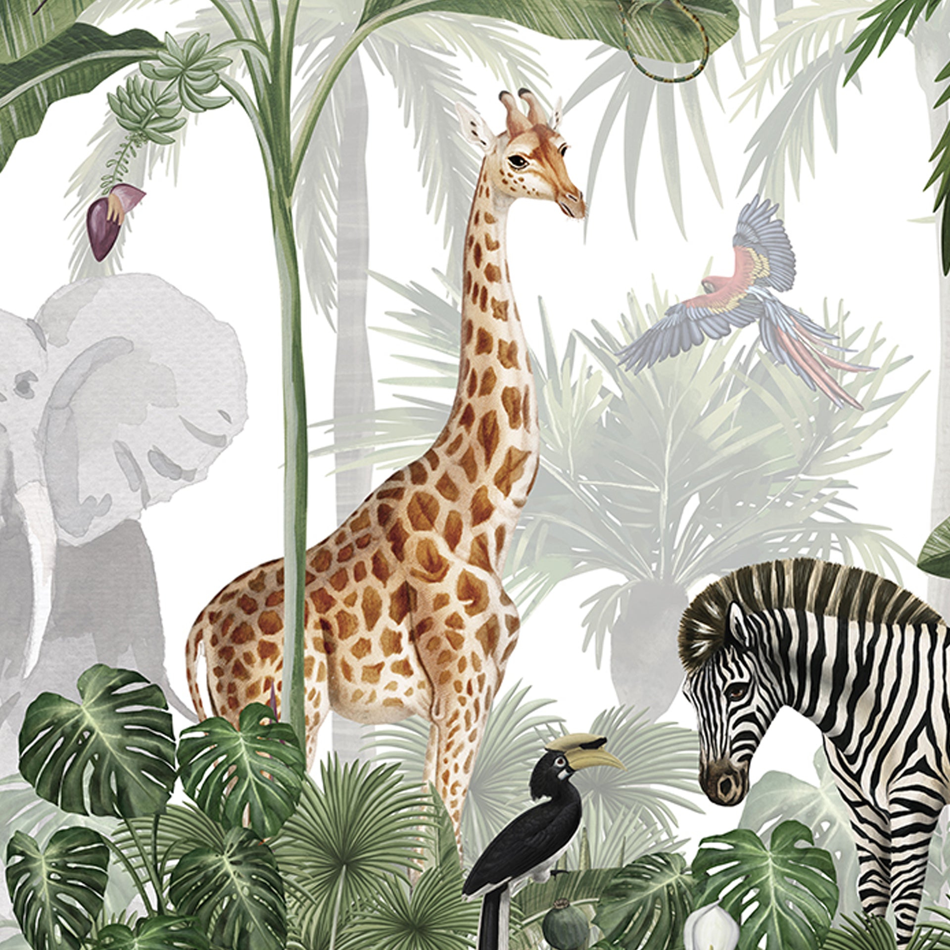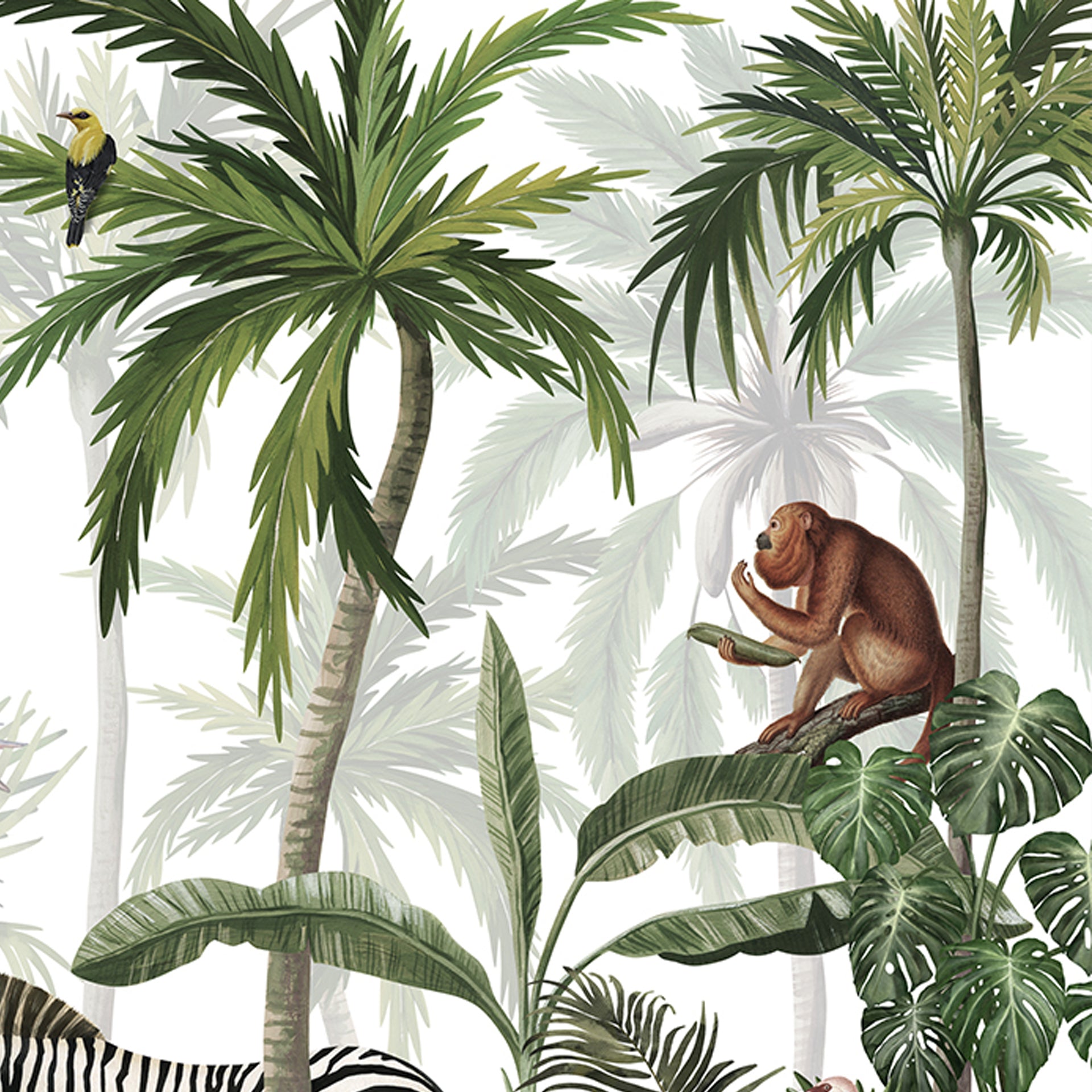 Jungle-Jive:Wallpaper With Giraffe Zebra Tiger Monkey Parrot And Palm Trees In Lush Tropical Forest-Sample