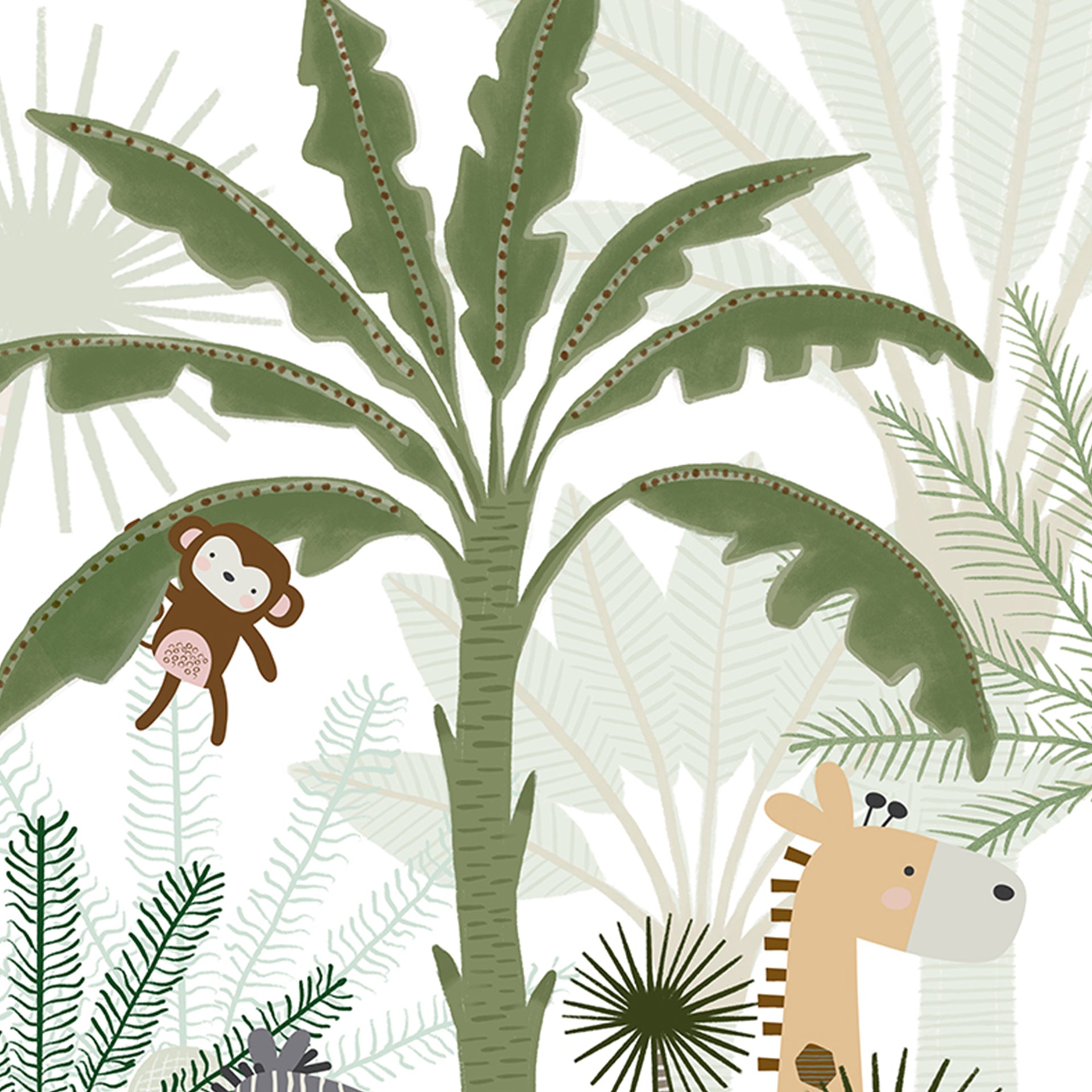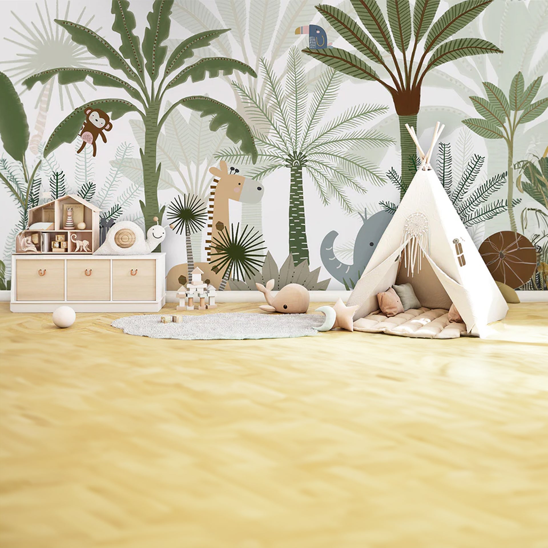 Playful, pastel-toned jungle scene featuring monkeys, giraffes, elephants, lions, and a toucan among palm trees and exotic plants. Perfect for children’s books, educational materials, and nature-themed decor.