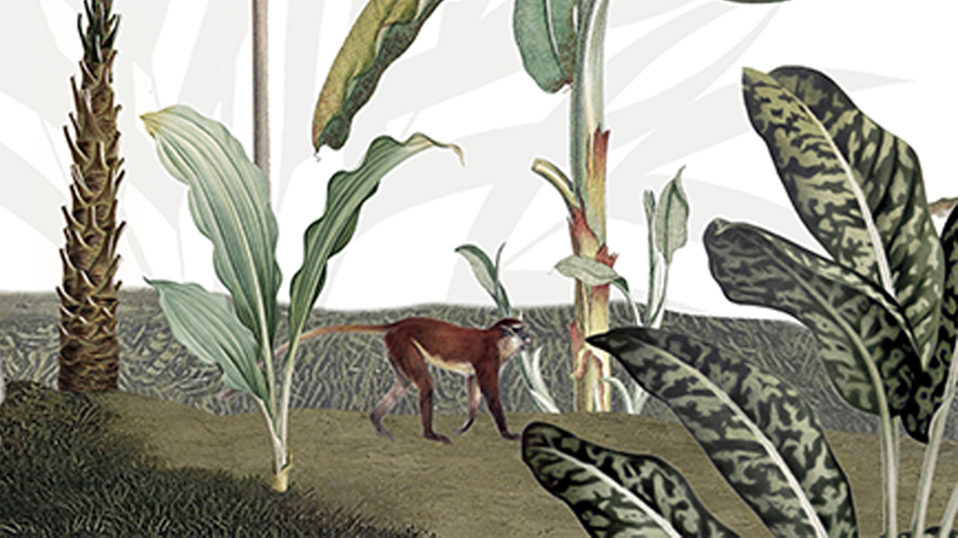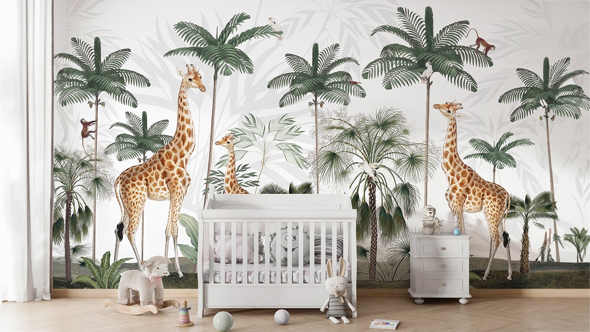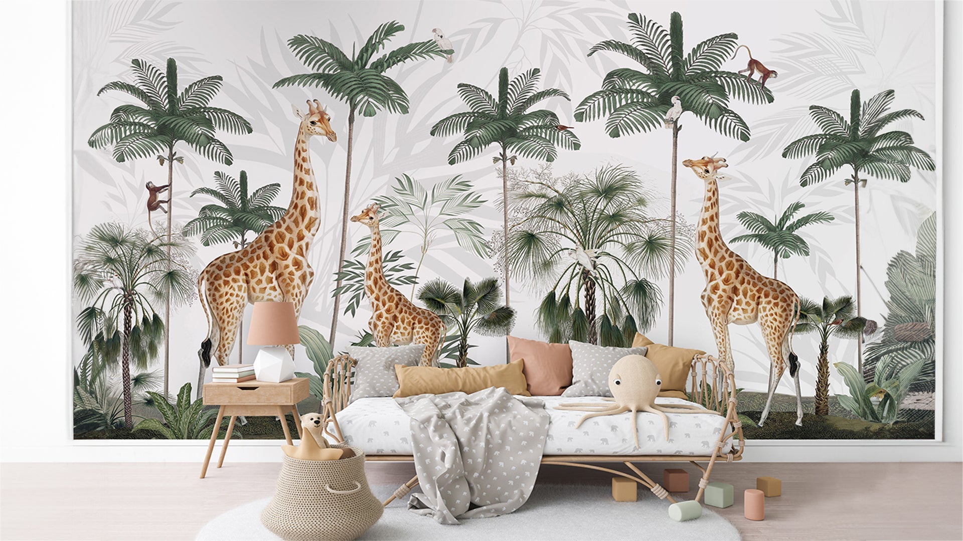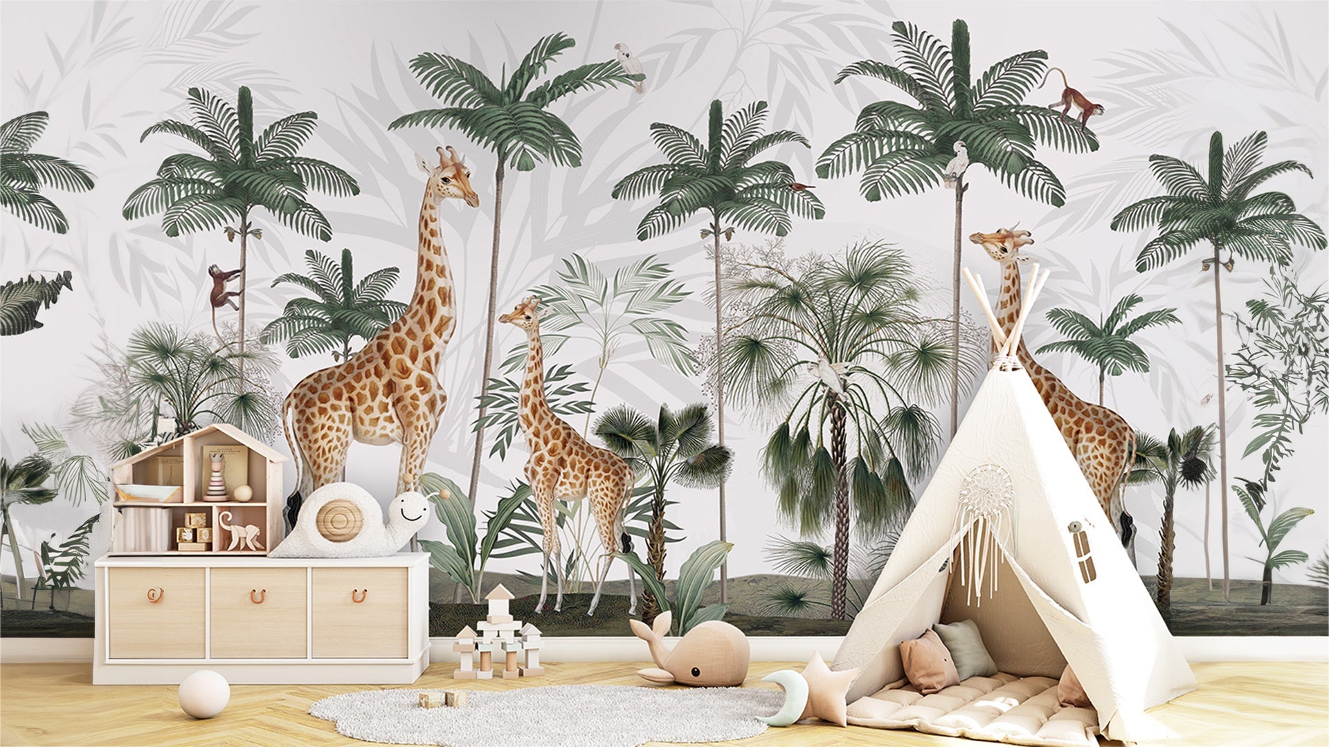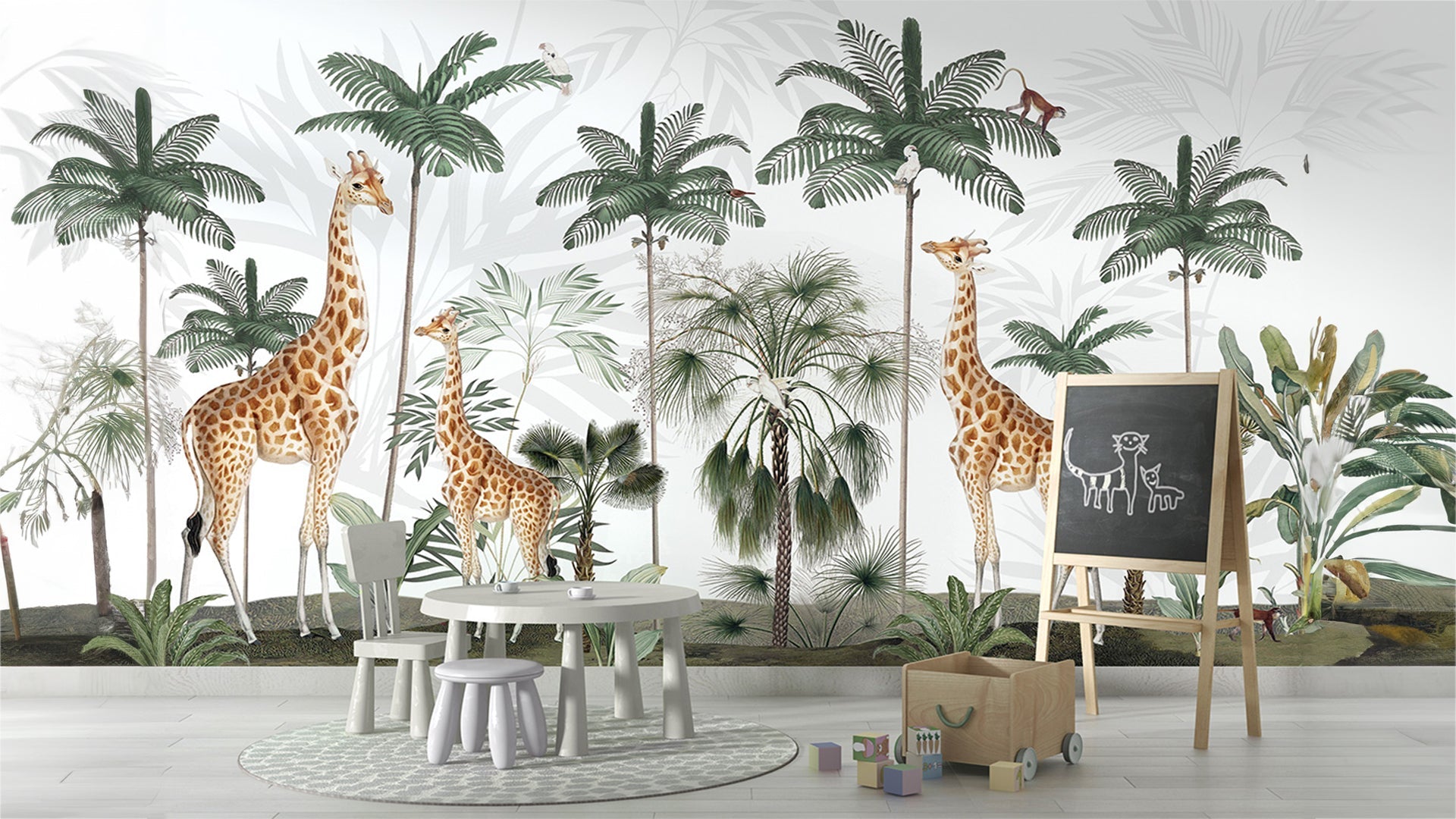 Jungle Theme Wallpaper With Giraffes, Palm Trees, and Playful Monkeys-sample