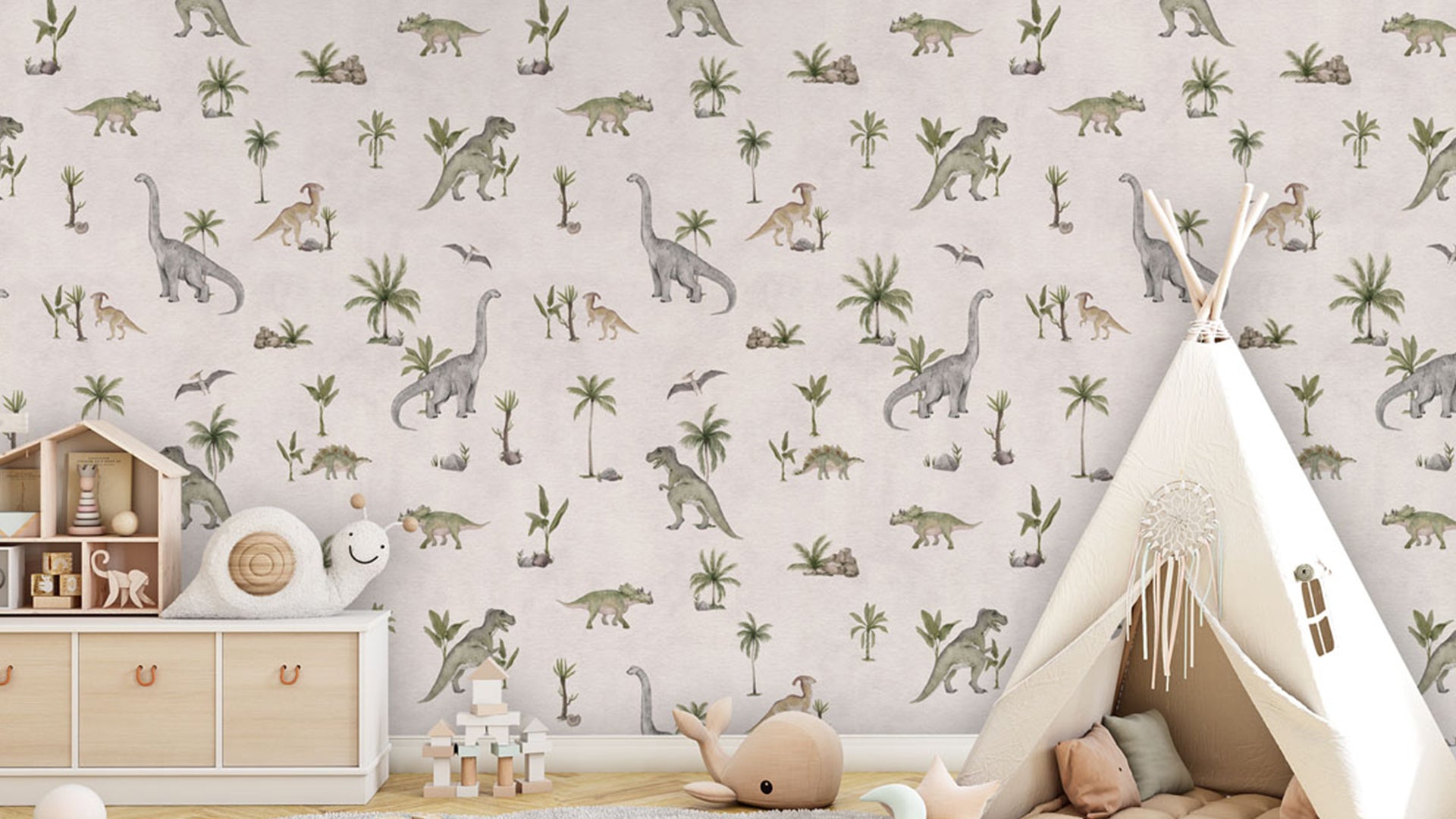 Jurassic era inspired wallpaper with dinosaur motifs. This wallpaper adds a fun and engaging element to pre school, indoor play area for kids, playroom or nurseries.