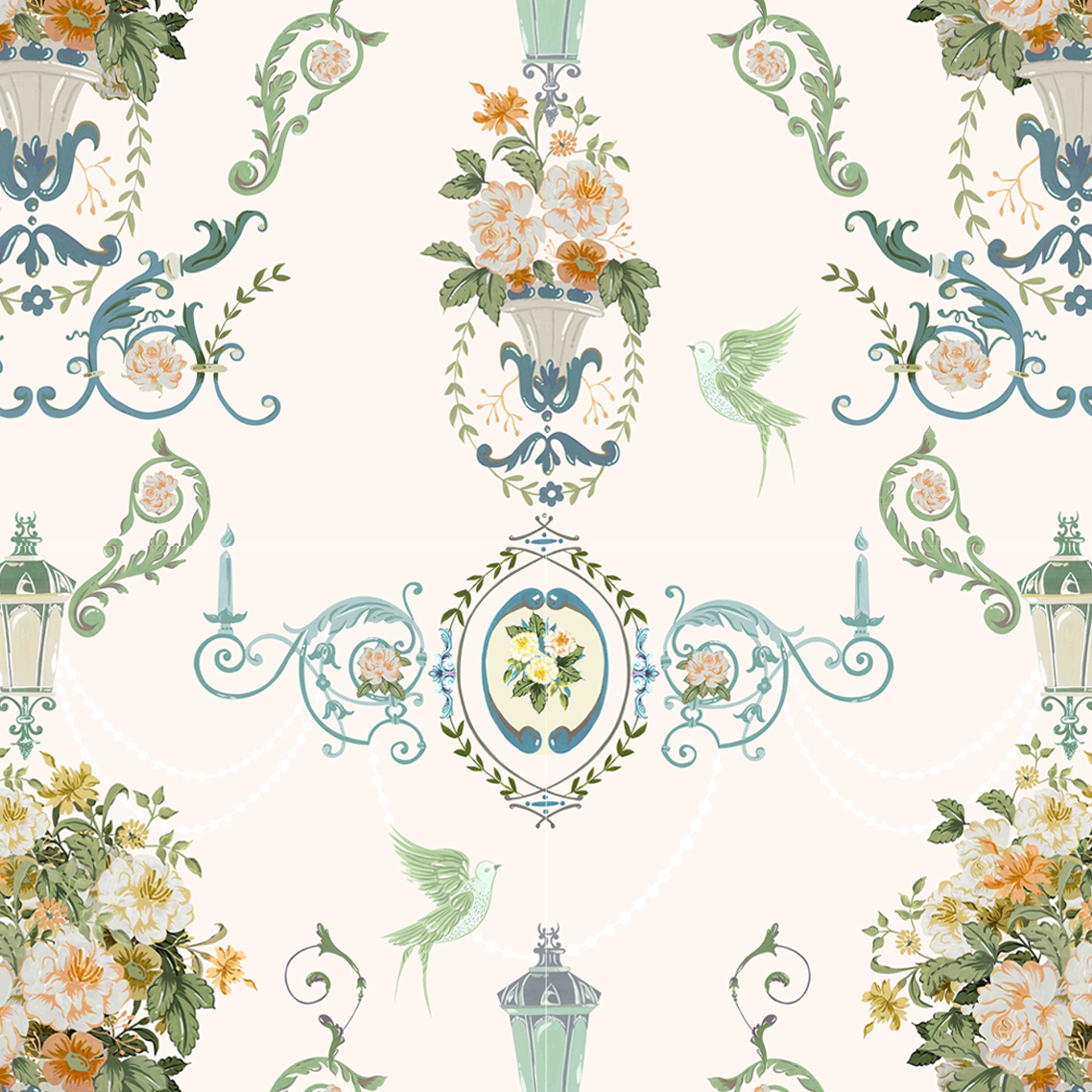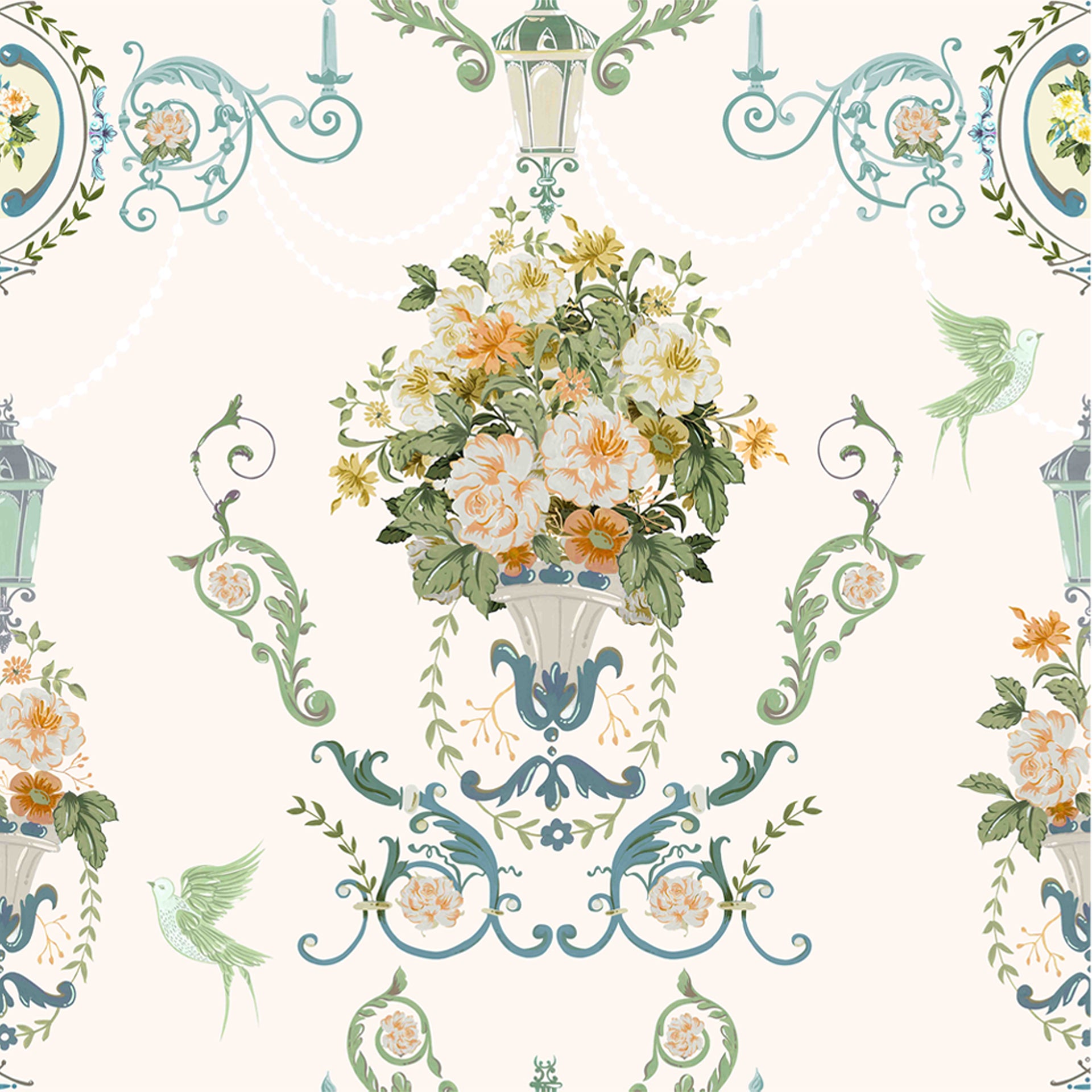La Roseraie: An elegant composition of blooming florals in a classical urn, framed by vintage lanterns, soft scrolls, and delicate birds- Sample