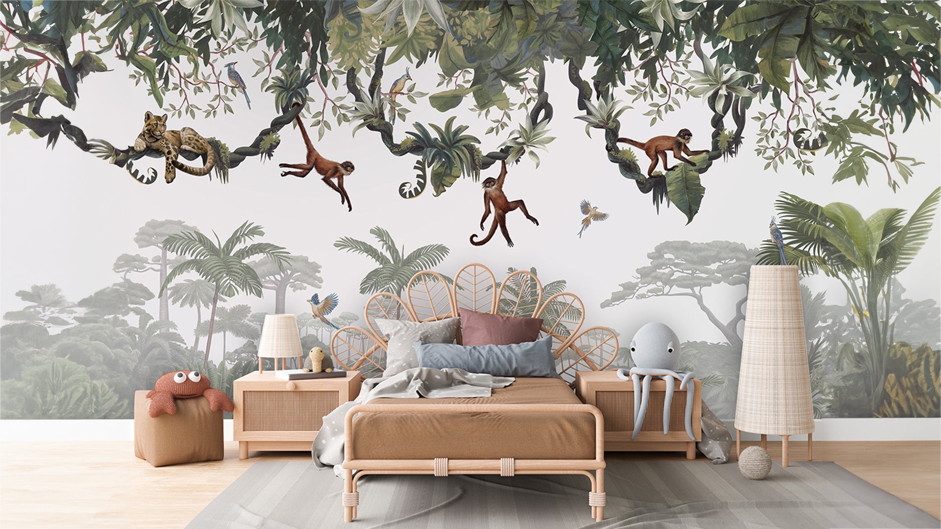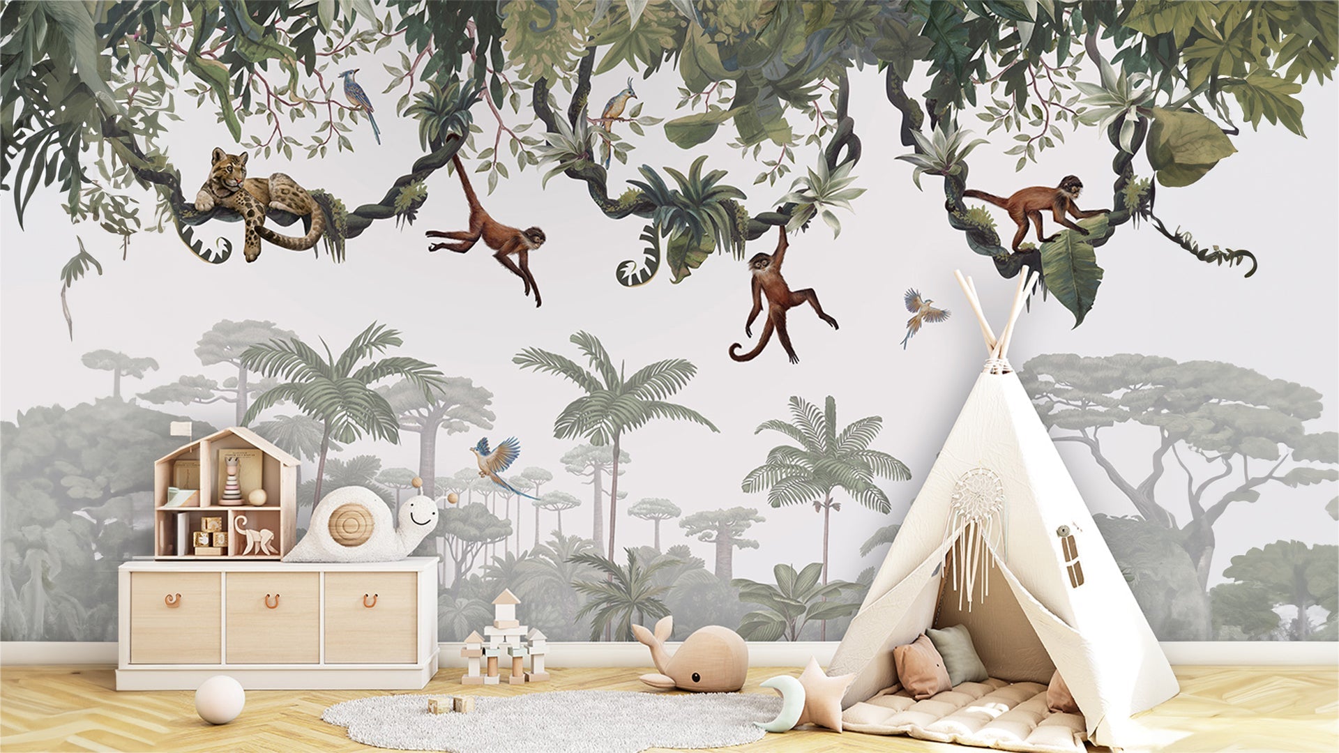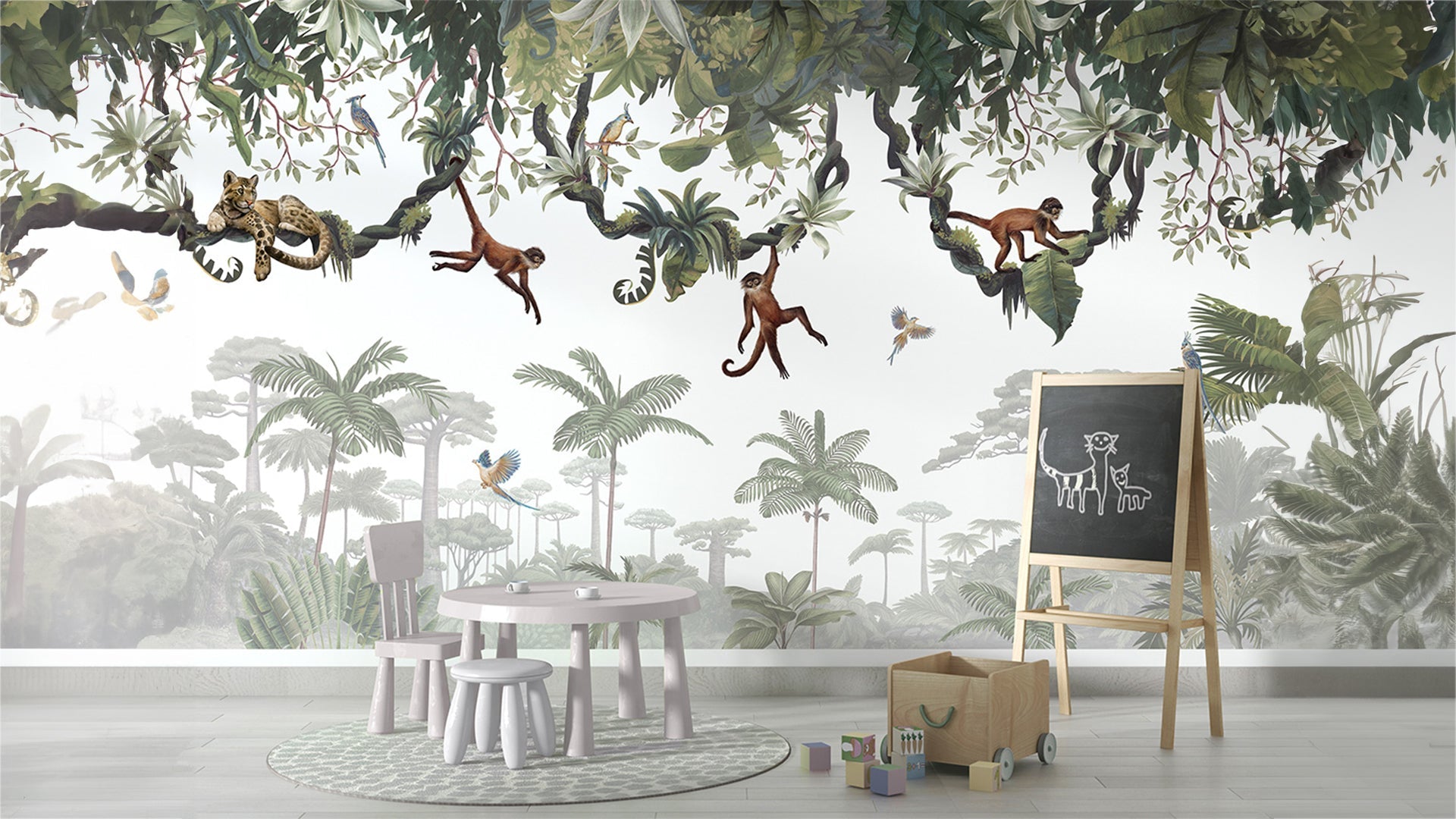 Transform your child's room into a jungle adventure with our 'Monkeys Hanging on Trees' wallpaper. Featuring playful monkeys swinging through lush green trees, perfect for nurseries, baby play centers, and play areas.