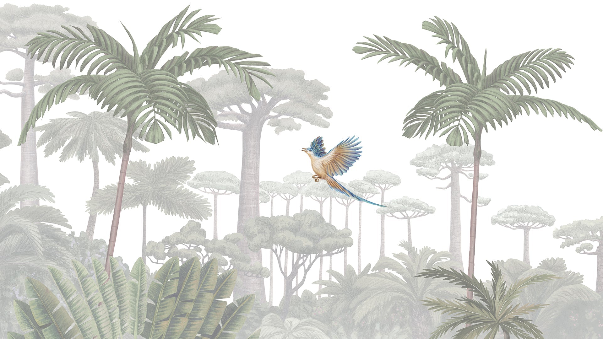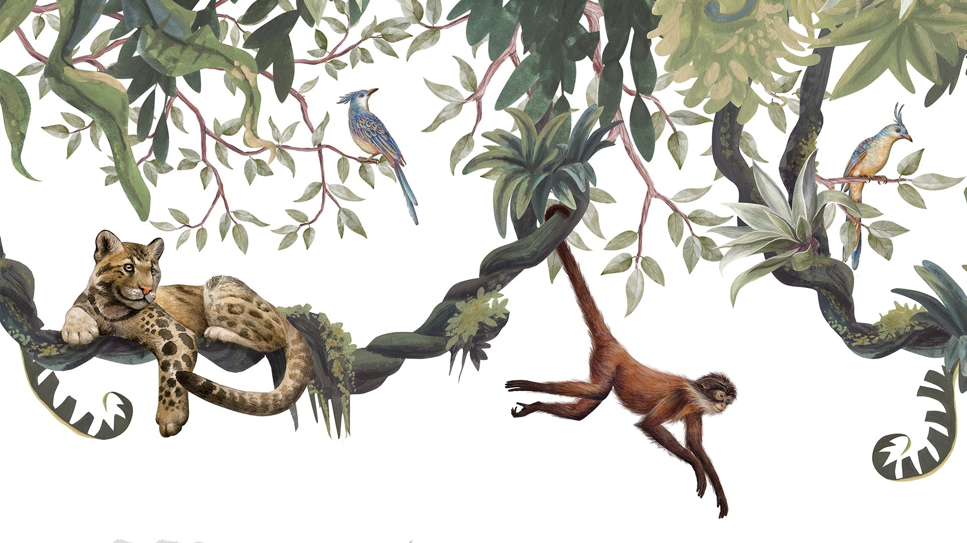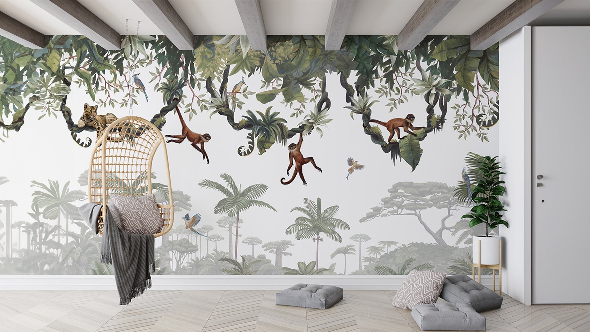 Transform your child's room into a jungle adventure with our 'Monkeys Hanging on Trees' wallpaper. Featuring playful monkeys swinging through lush green trees, perfect for nurseries, baby play centers, and play areas.