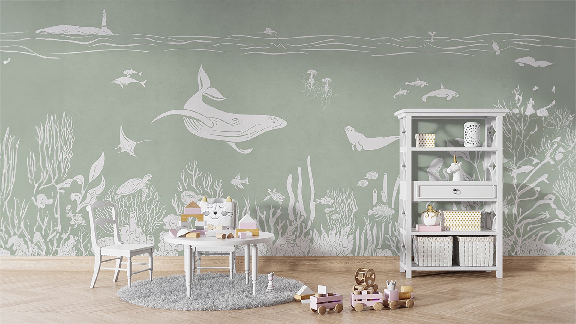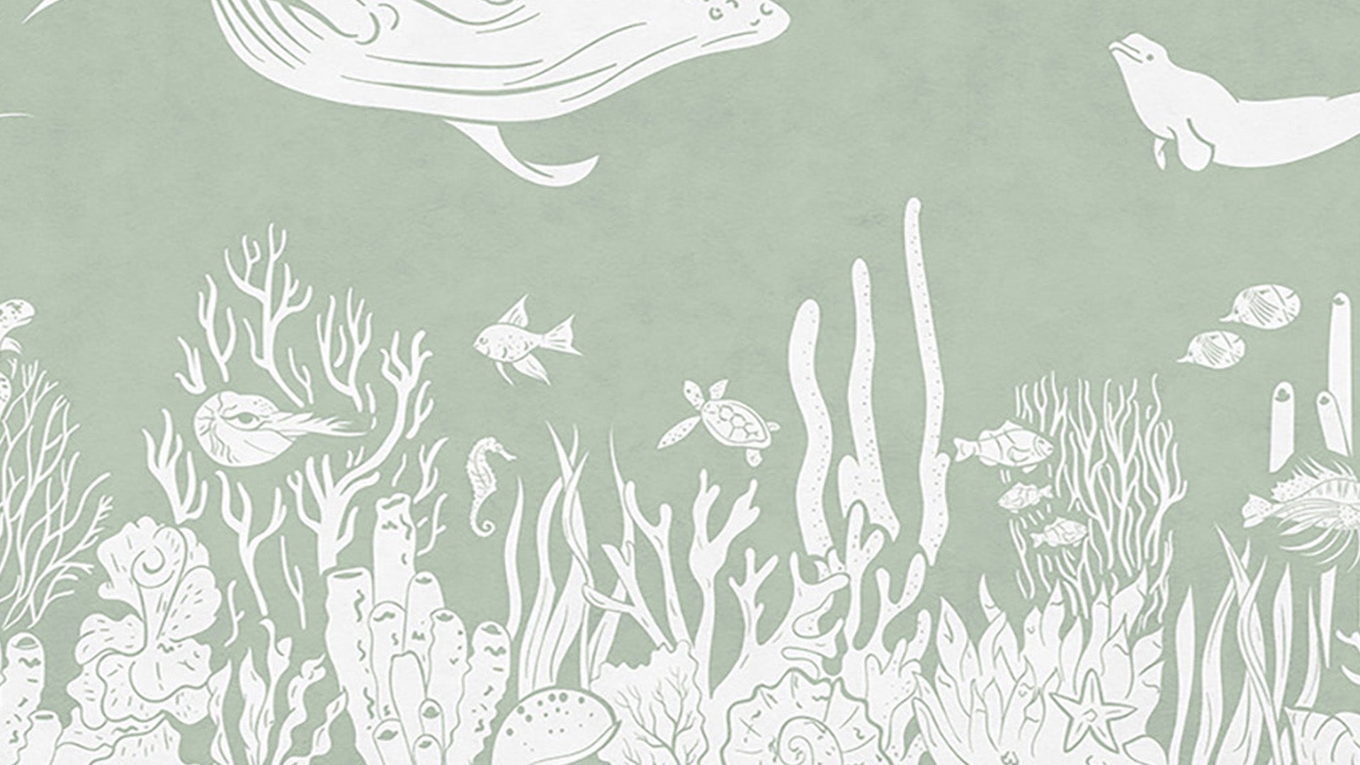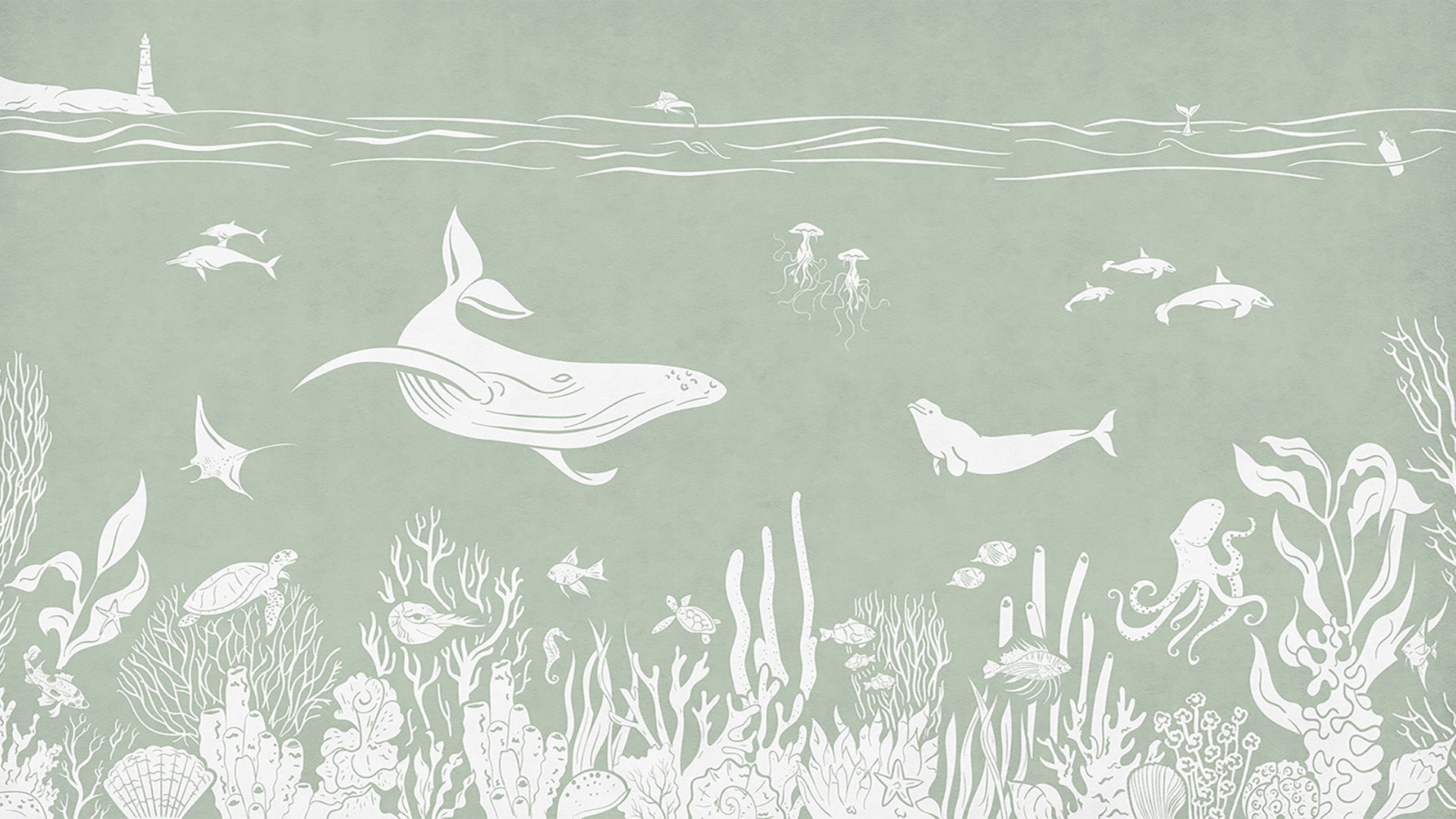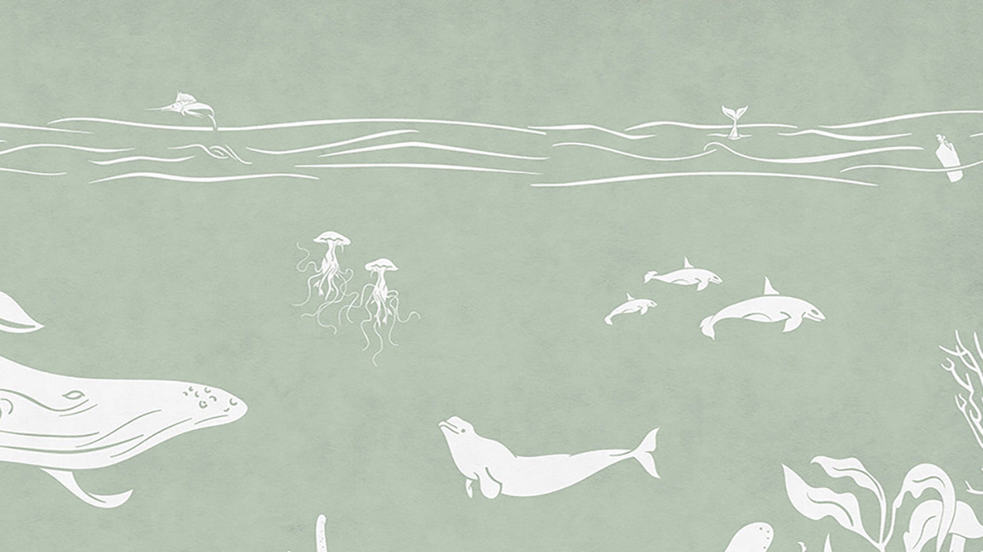 Ocean-themed pastel green wallpaper design showcase its peaceful waves and soft colors. Ideal for children's rooms, nurseries, and other spaces.