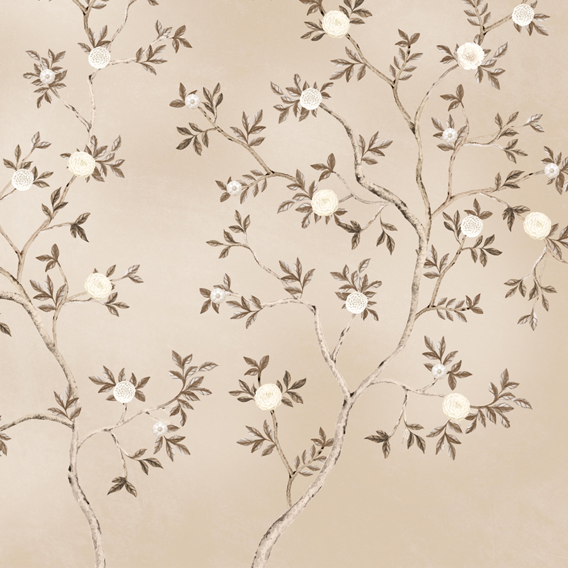 Petal Chorus: Delicate floral branches with soft white blooms on a muted beige base- Sample