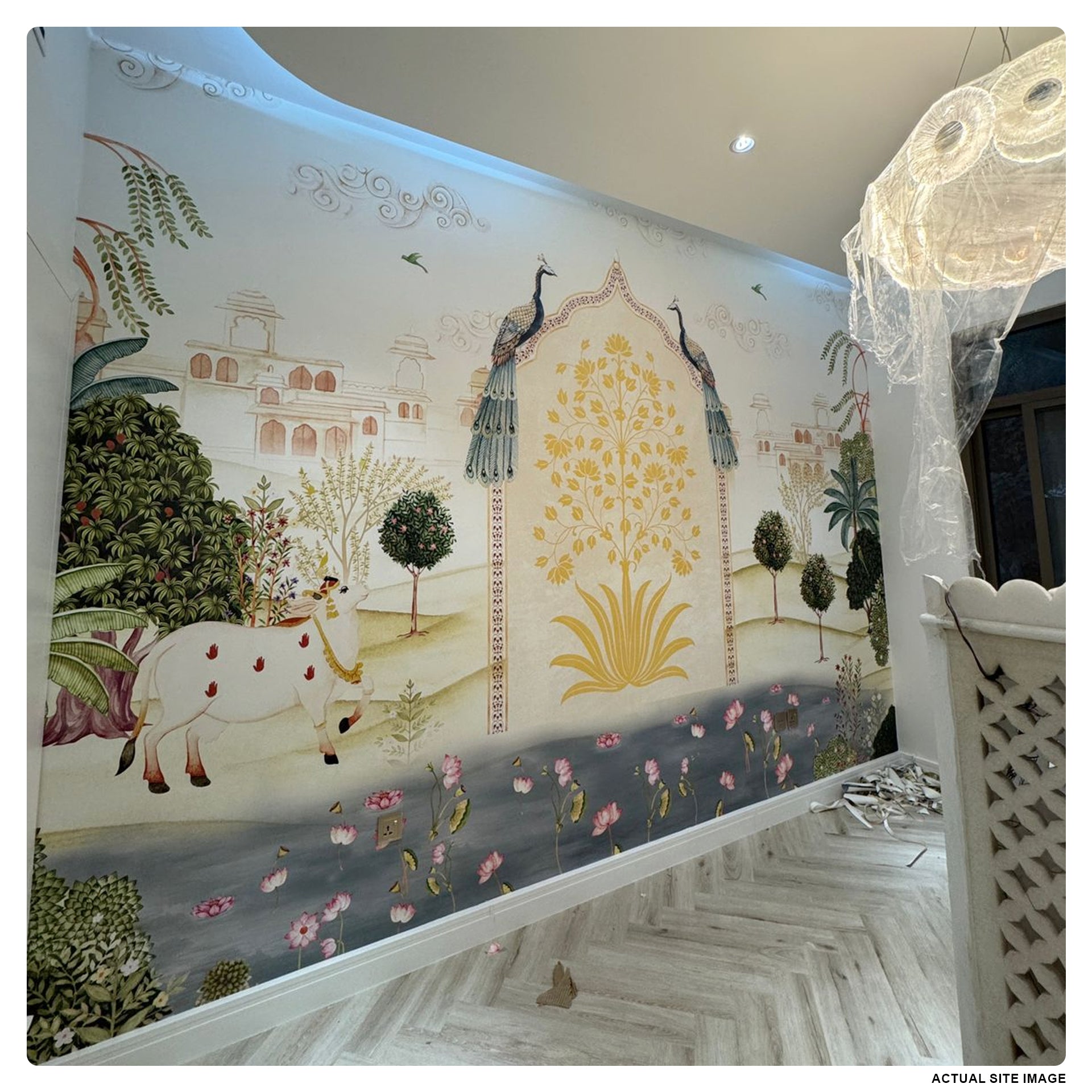 Pichwai peacock and cow wallpaper with domes for living room, guest room, clothing showrooms or office spaces