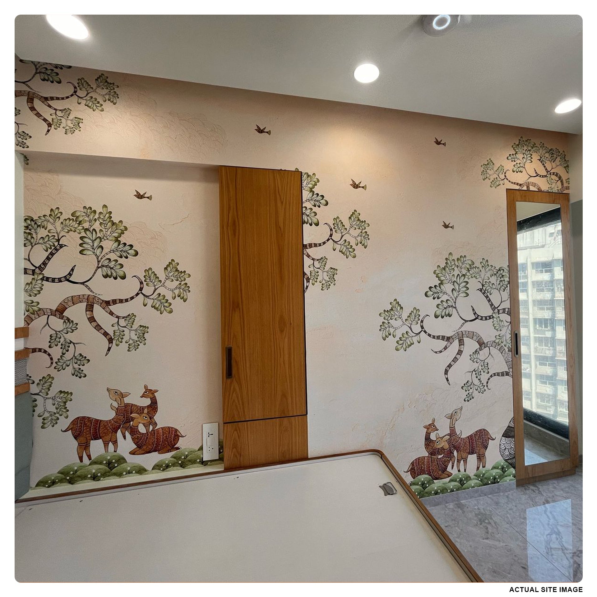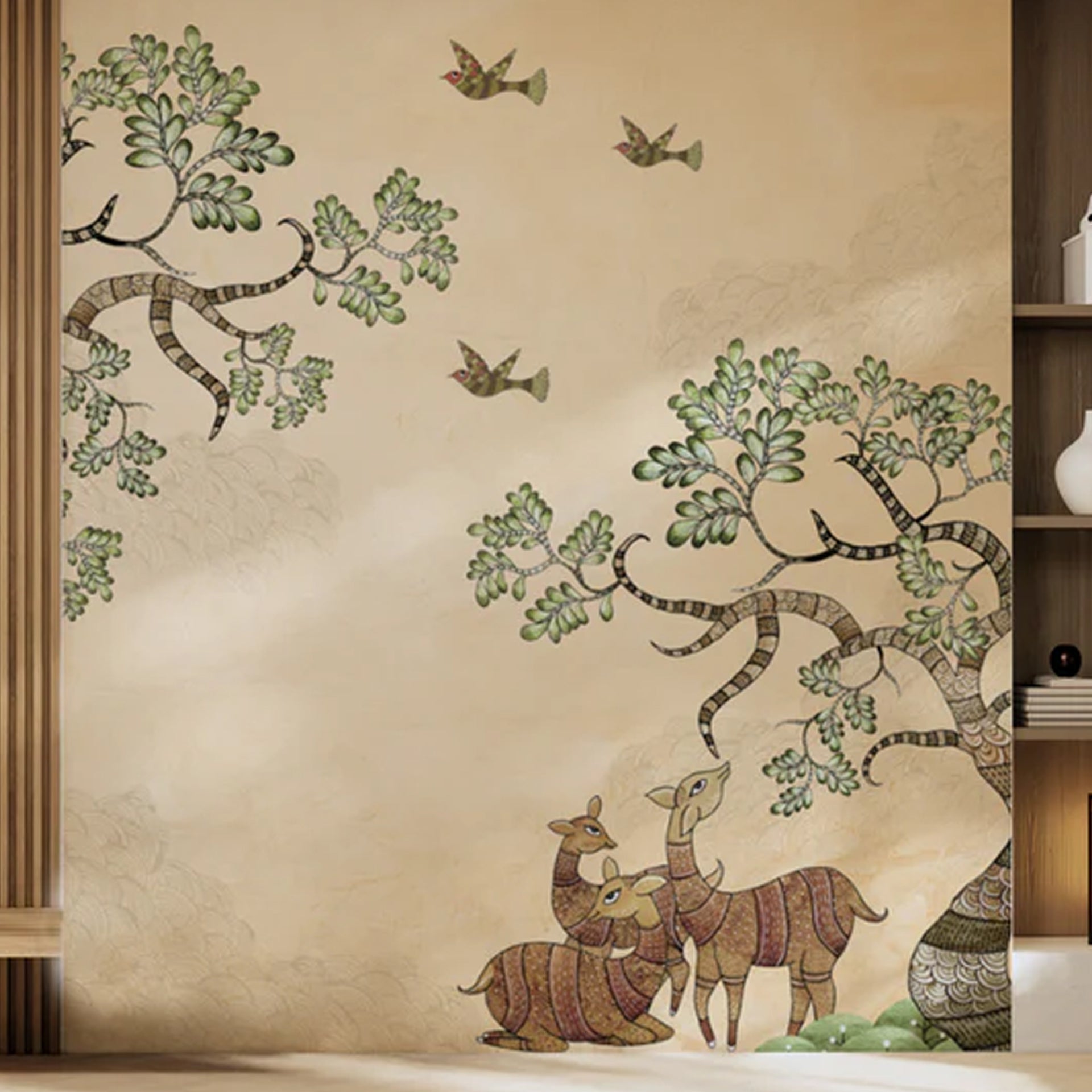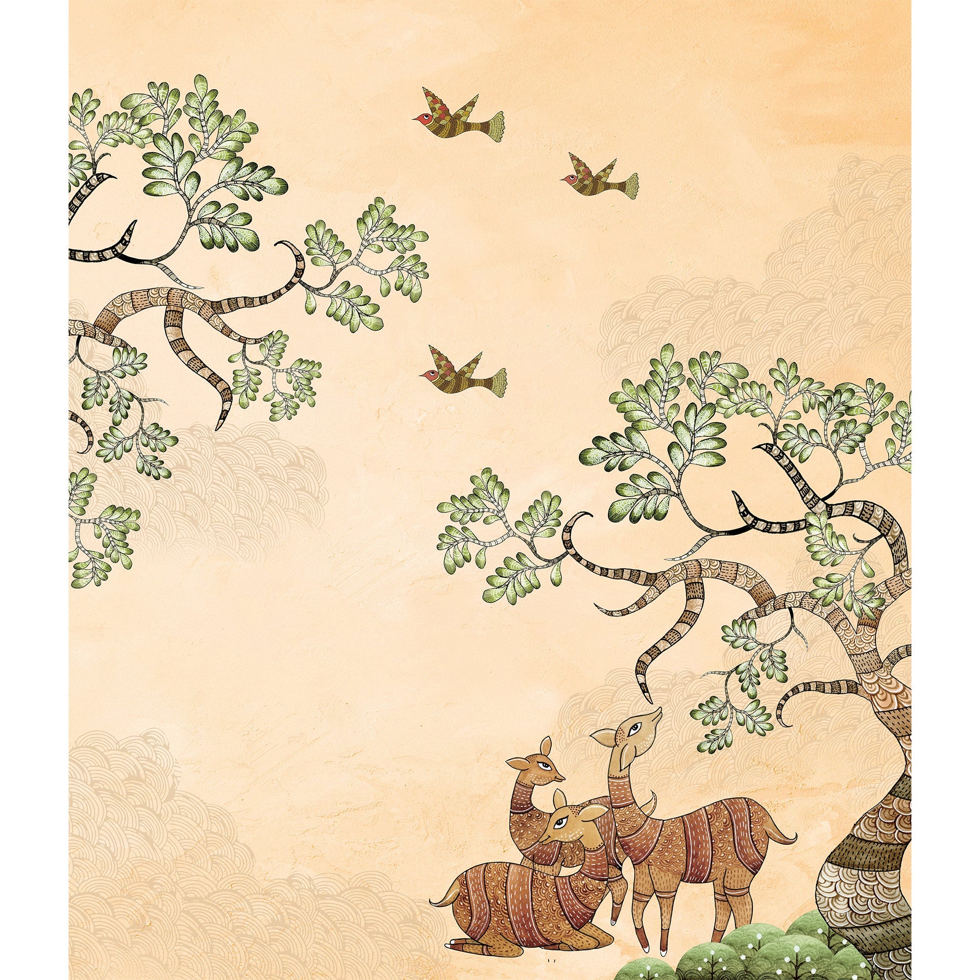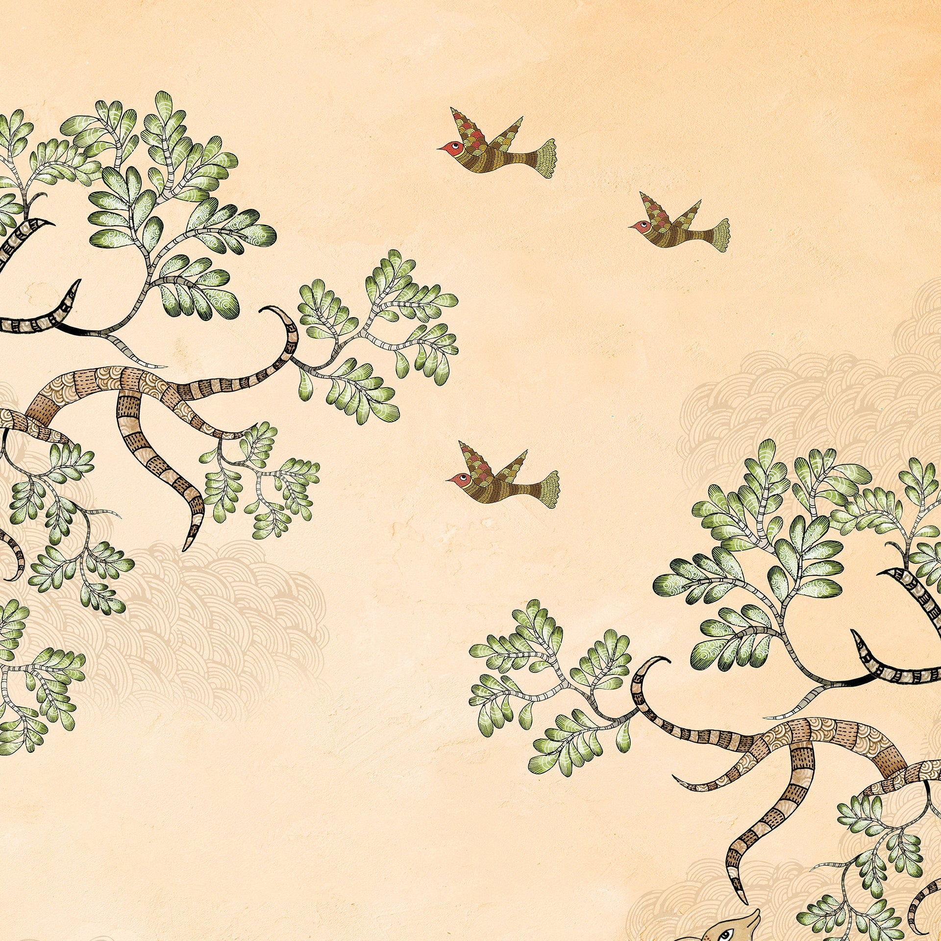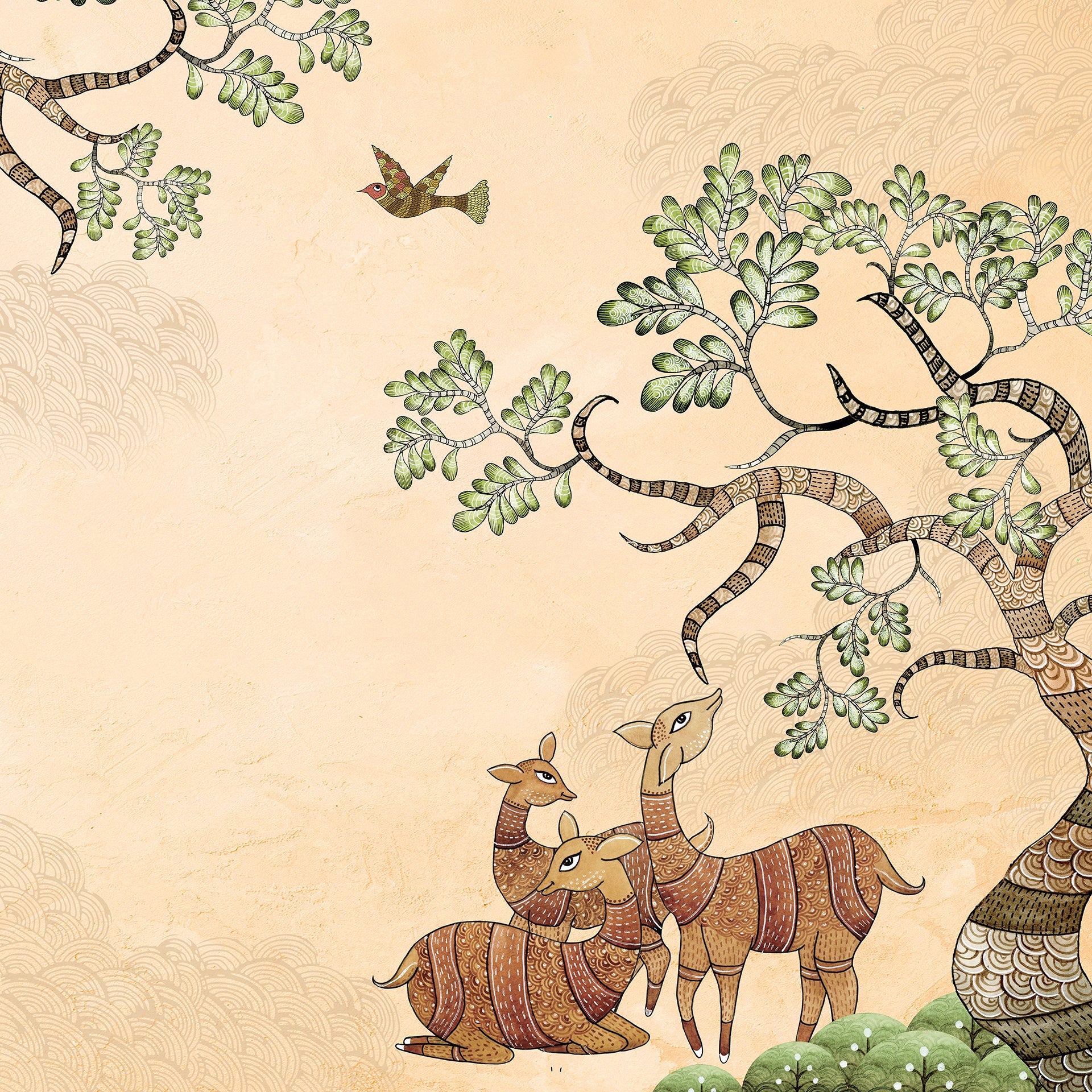Picture Perfect-Gond art wallpaper with deers and flying birds-sample