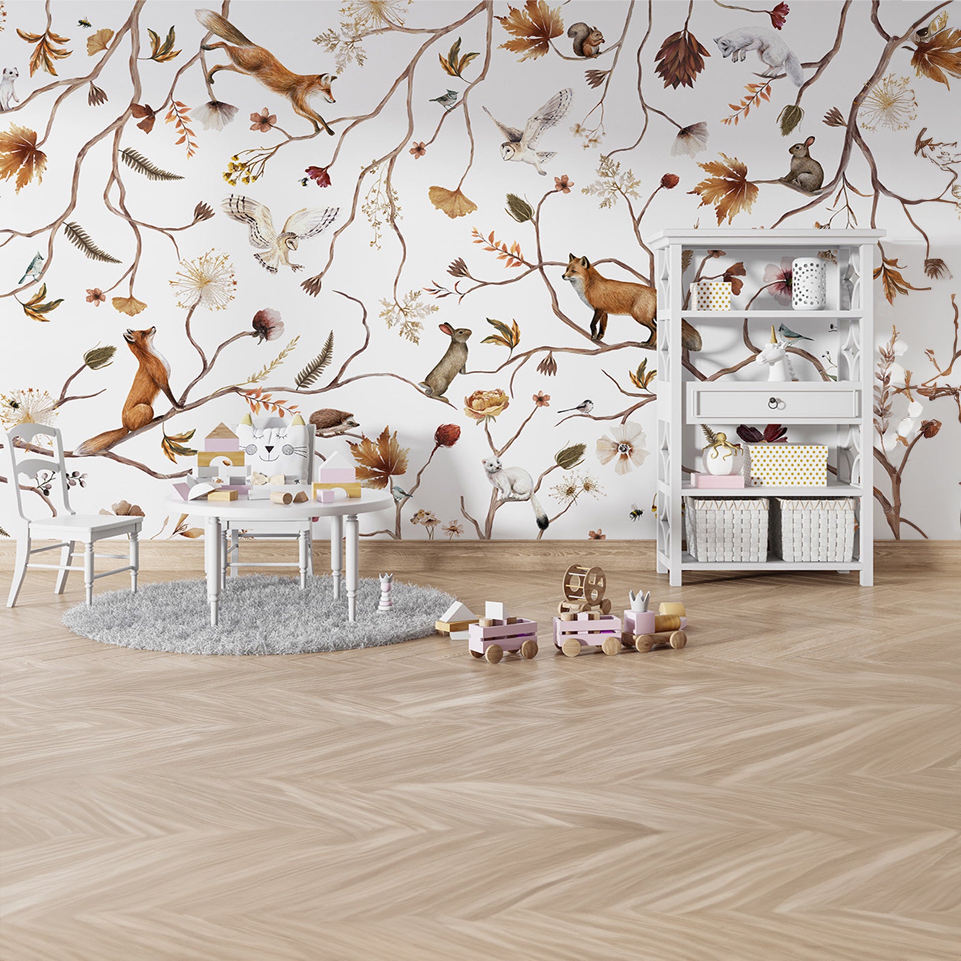 Playful-Forest: Autumn Forest Branches With Foxes Squirrels Birds And Flowers-Sample