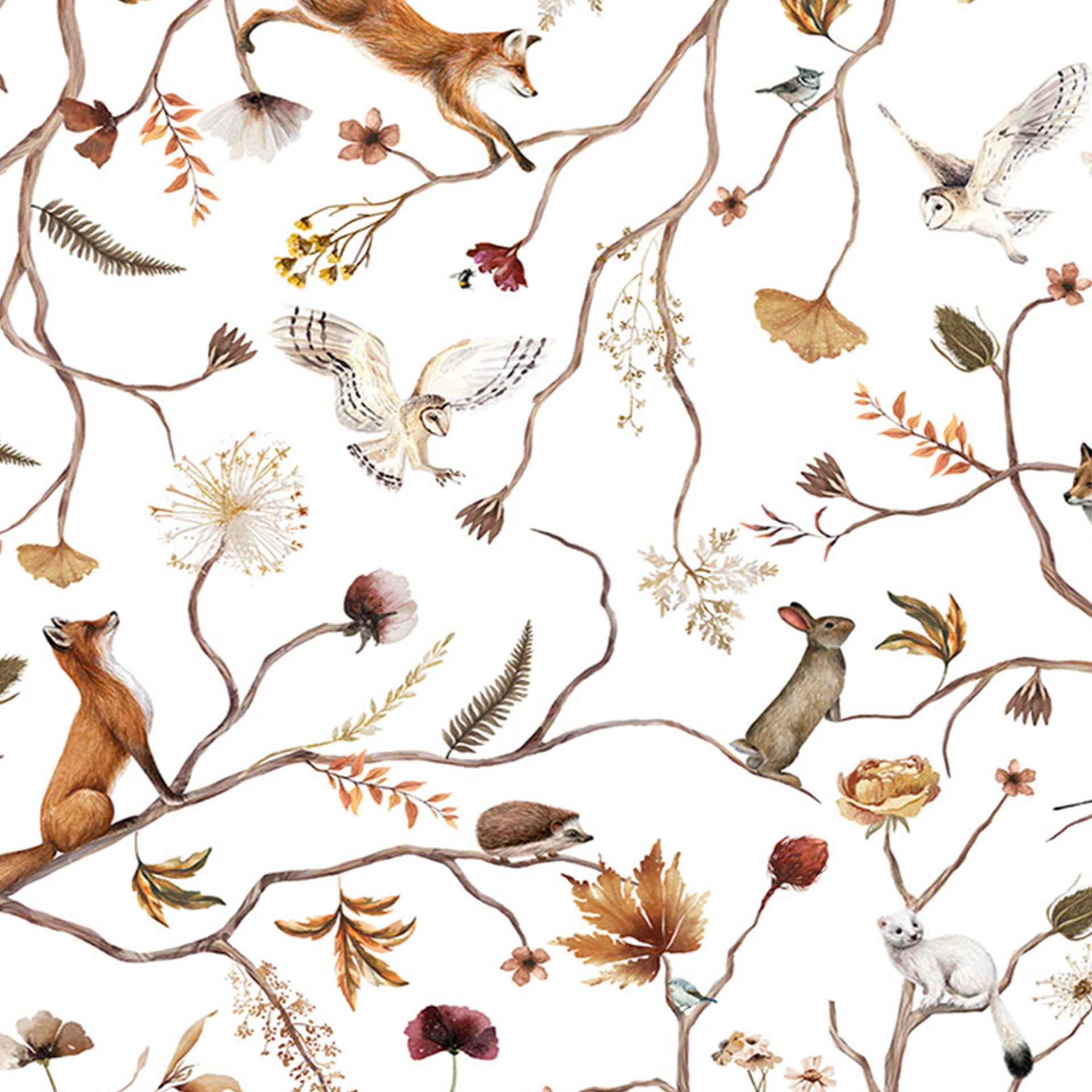 A watercolor-style scene of intertwined branches, leaves, and flowers with foxes, squirrels, owls, and birds in warm autumn tones. Ideal for nature themes, textiles, wallpaper, and stock projects.