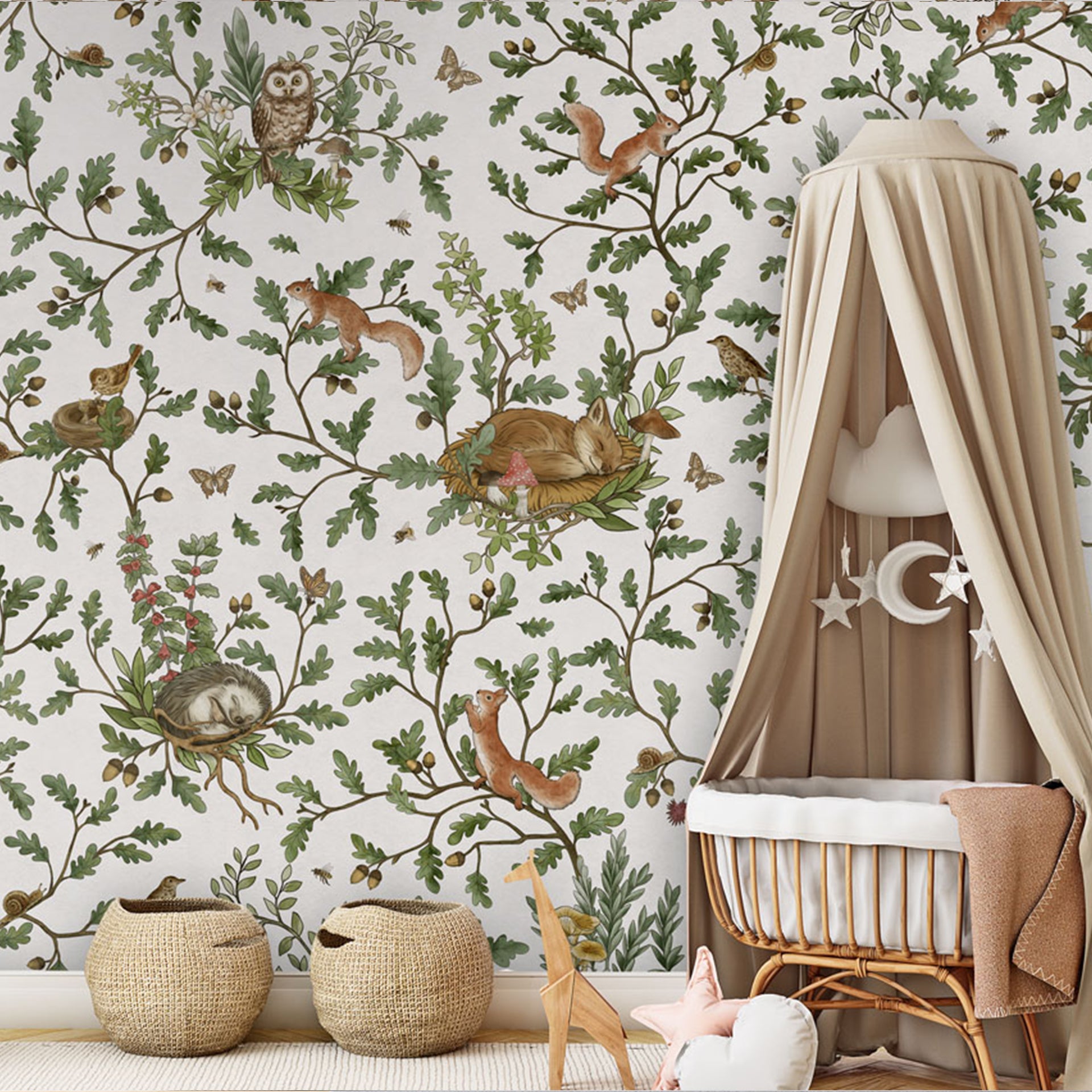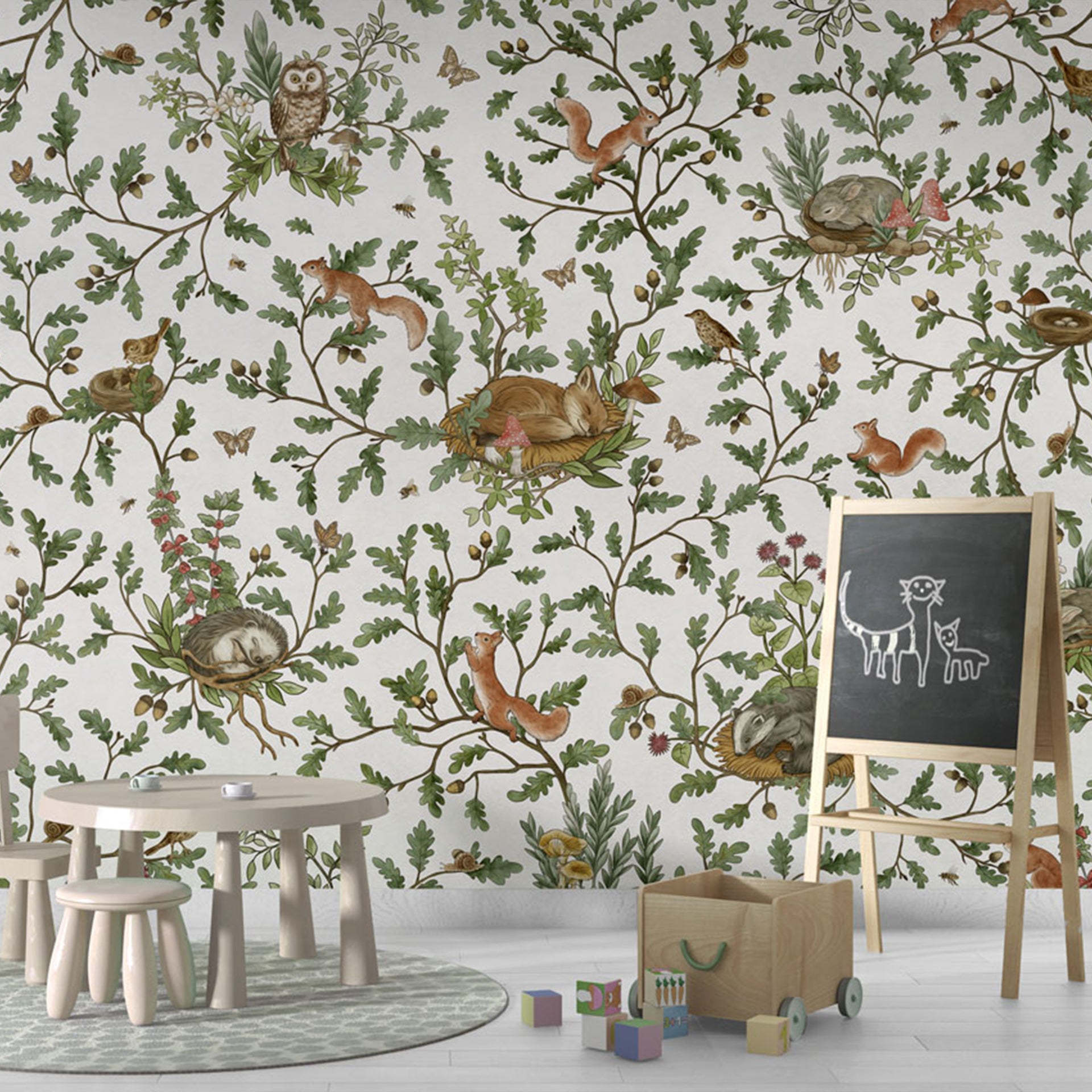 Charming wallpaper pattern featuring tiny woodland creatures such as squirrels, owls, and rabbits perched on leafy branches, set among lush greenery. A tranquil, nature-inspired design perfect for nature lovers and cozy decor.