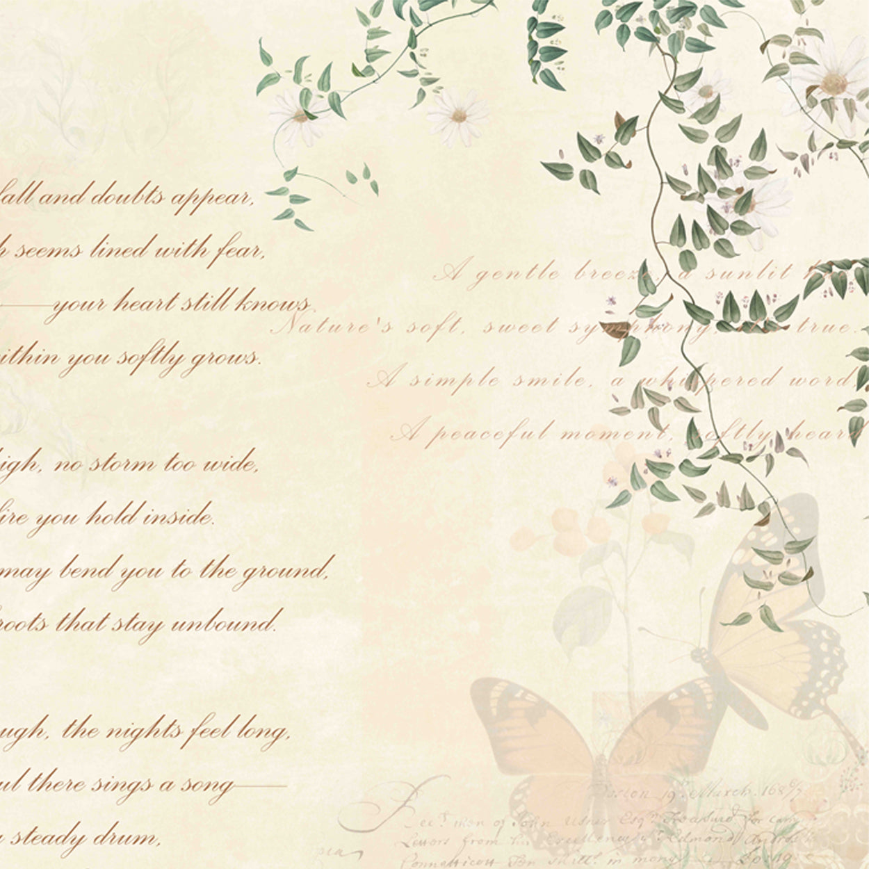 Poetic Flutter: A soft interplay of handwritten verse and fluttering butterflies evokes serenity, grace, and fleeting beauty- Sample