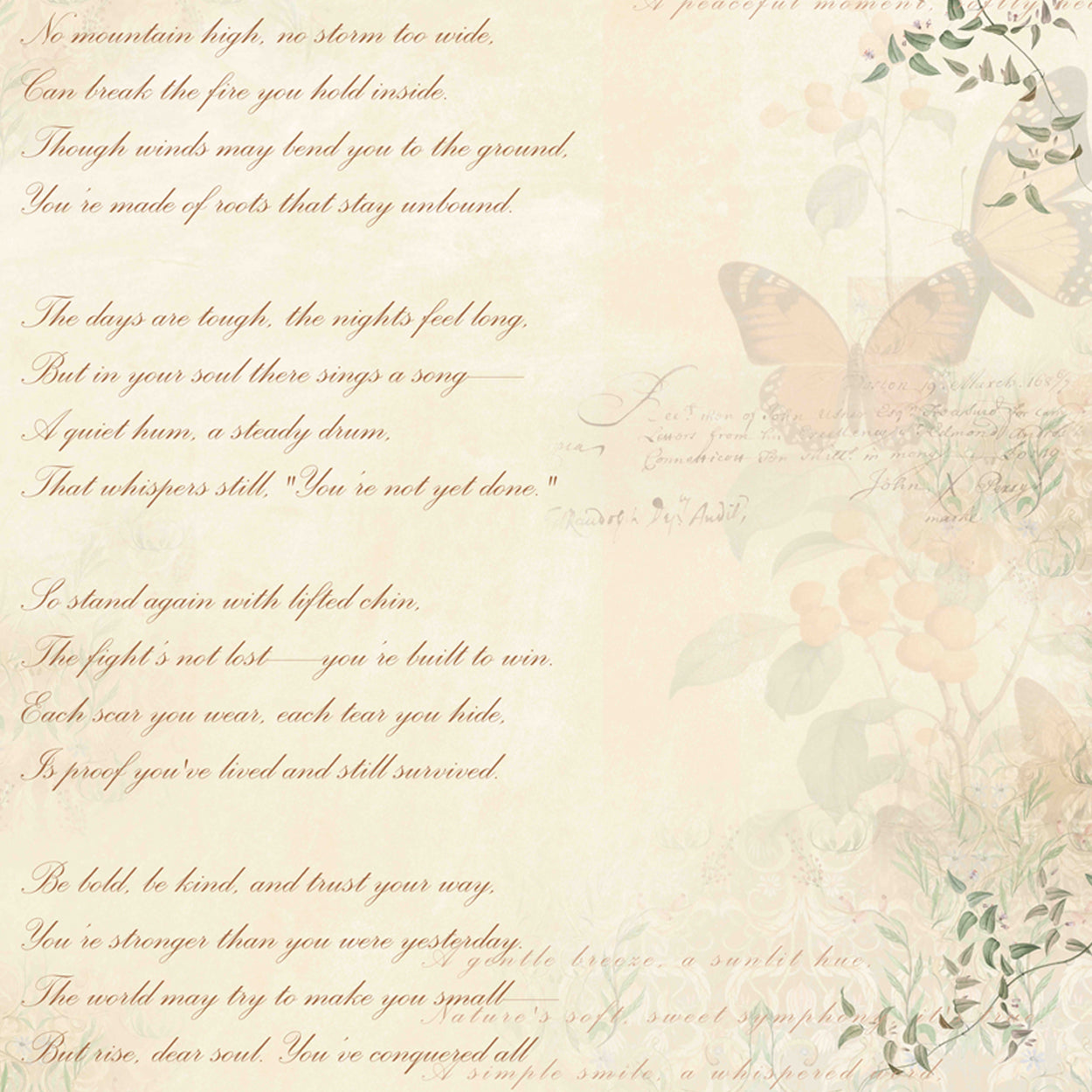 Elegant poem text features an empowering message surrounded by flowery decor and butterfly motifs. An uplifting composition blending nature-inspired elements with motivational writing for spiritual and creative inspiration.