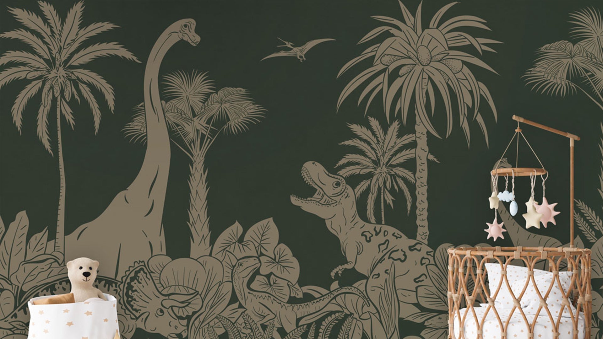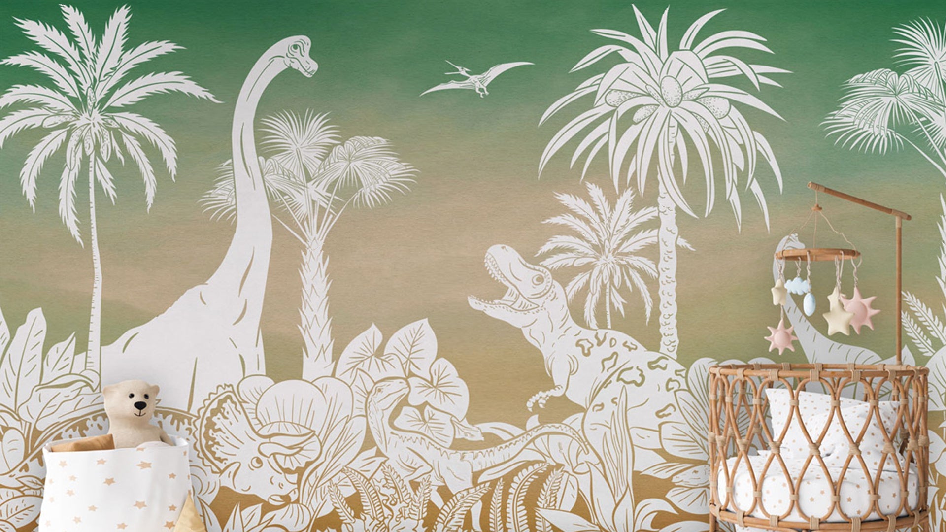 Prehistoric creatures wallpaper for Kids' Room Wallpaper evokes ancient excitement with brilliant colors and whimsical dinosaurs.