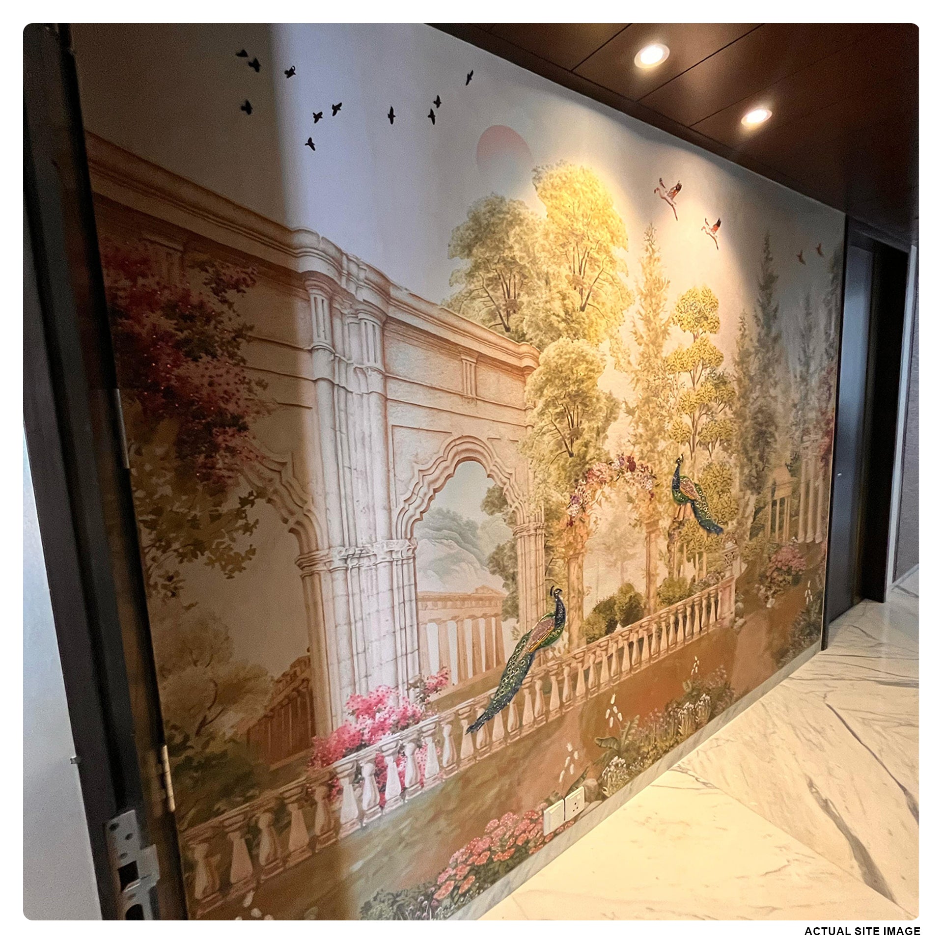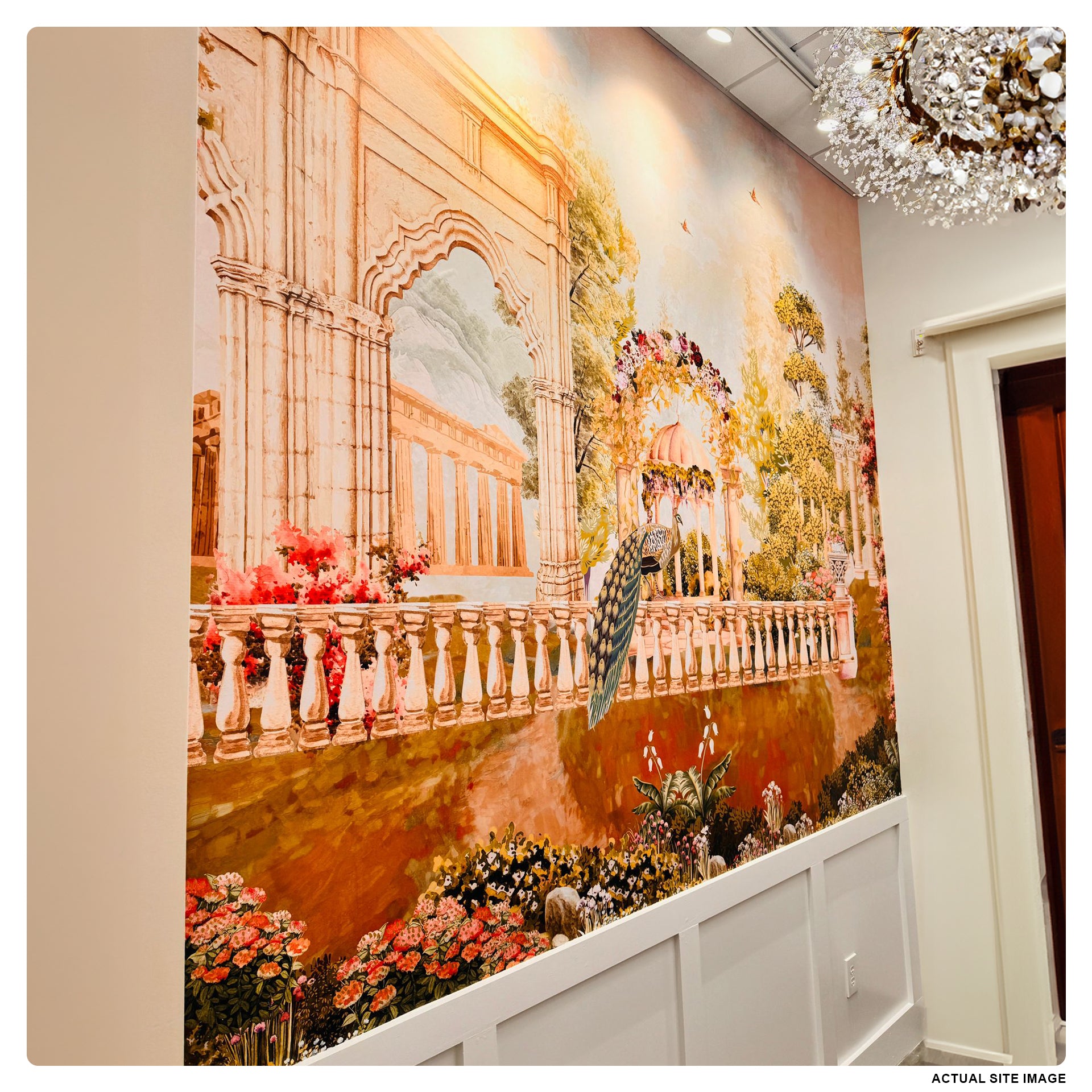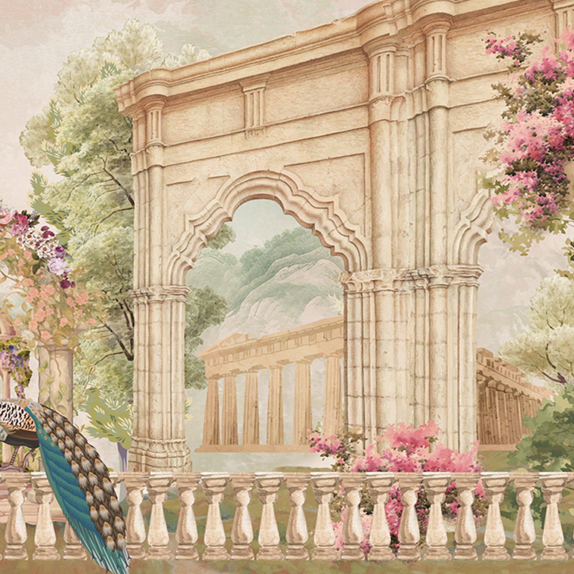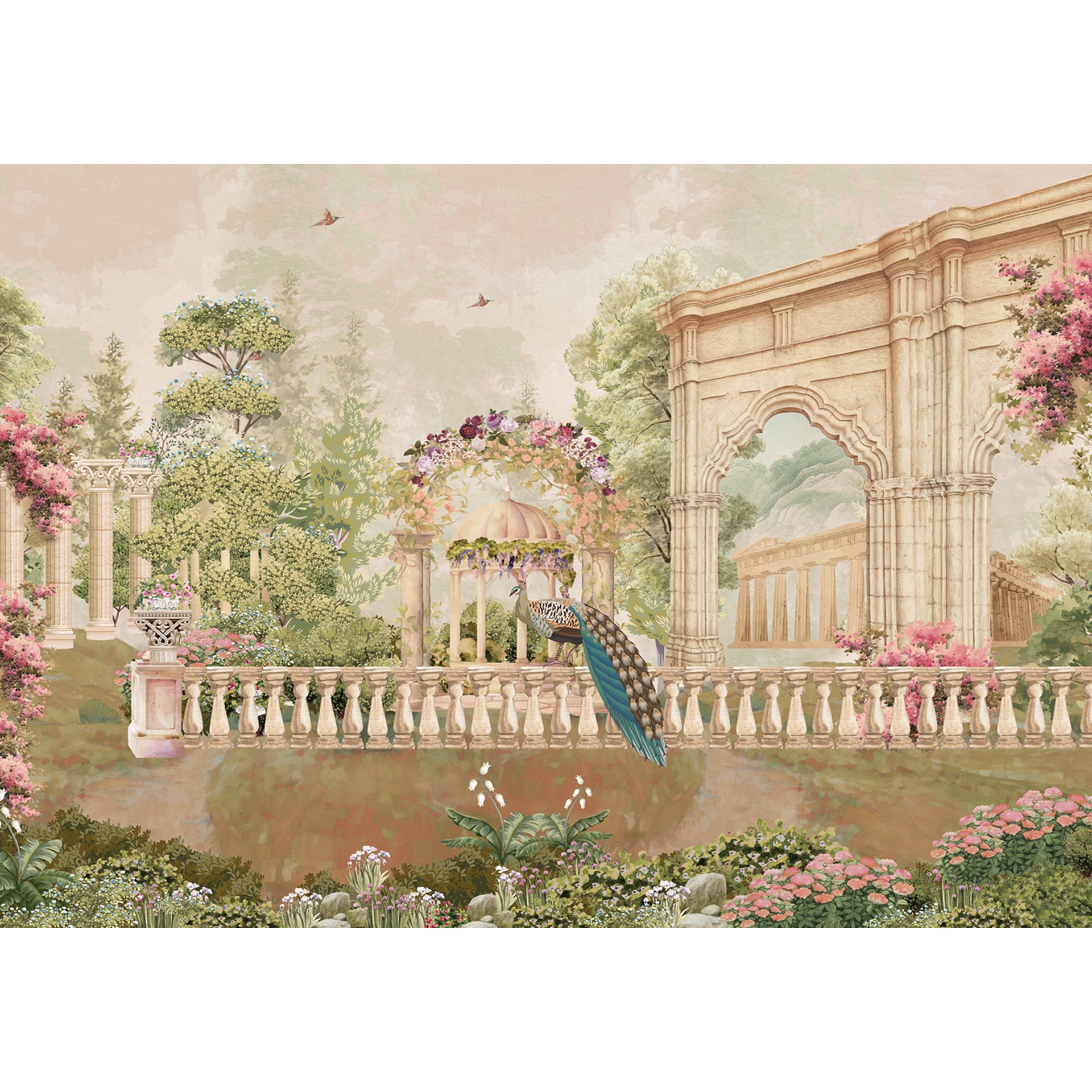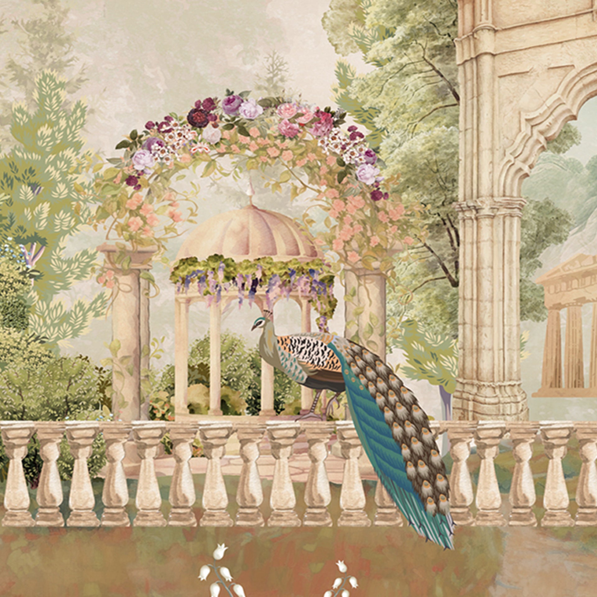Regal-Peacock: Romantic Garden With Peacock, Archways In Soft Pastel Tones - Sample