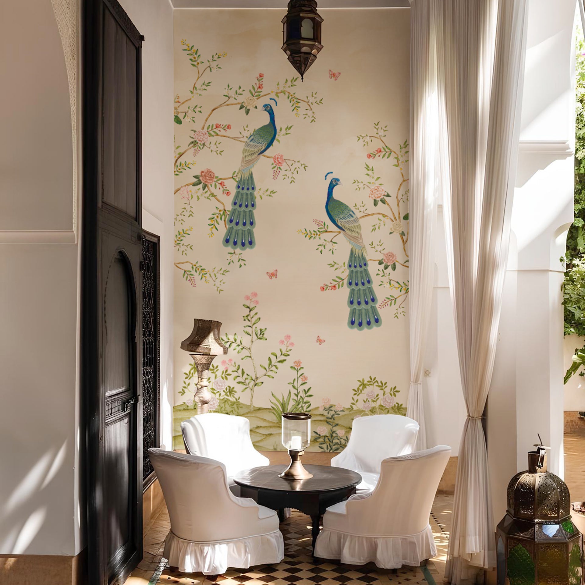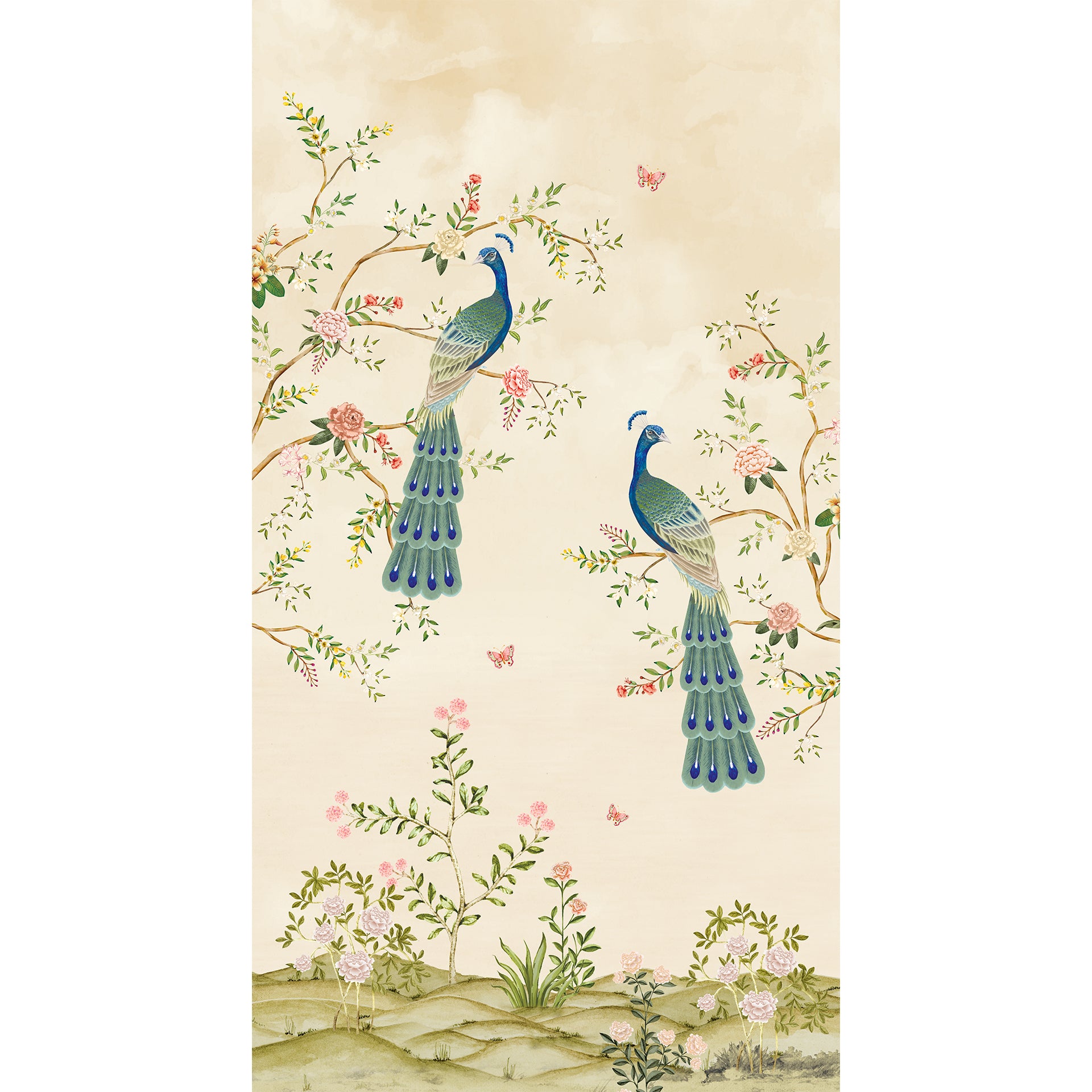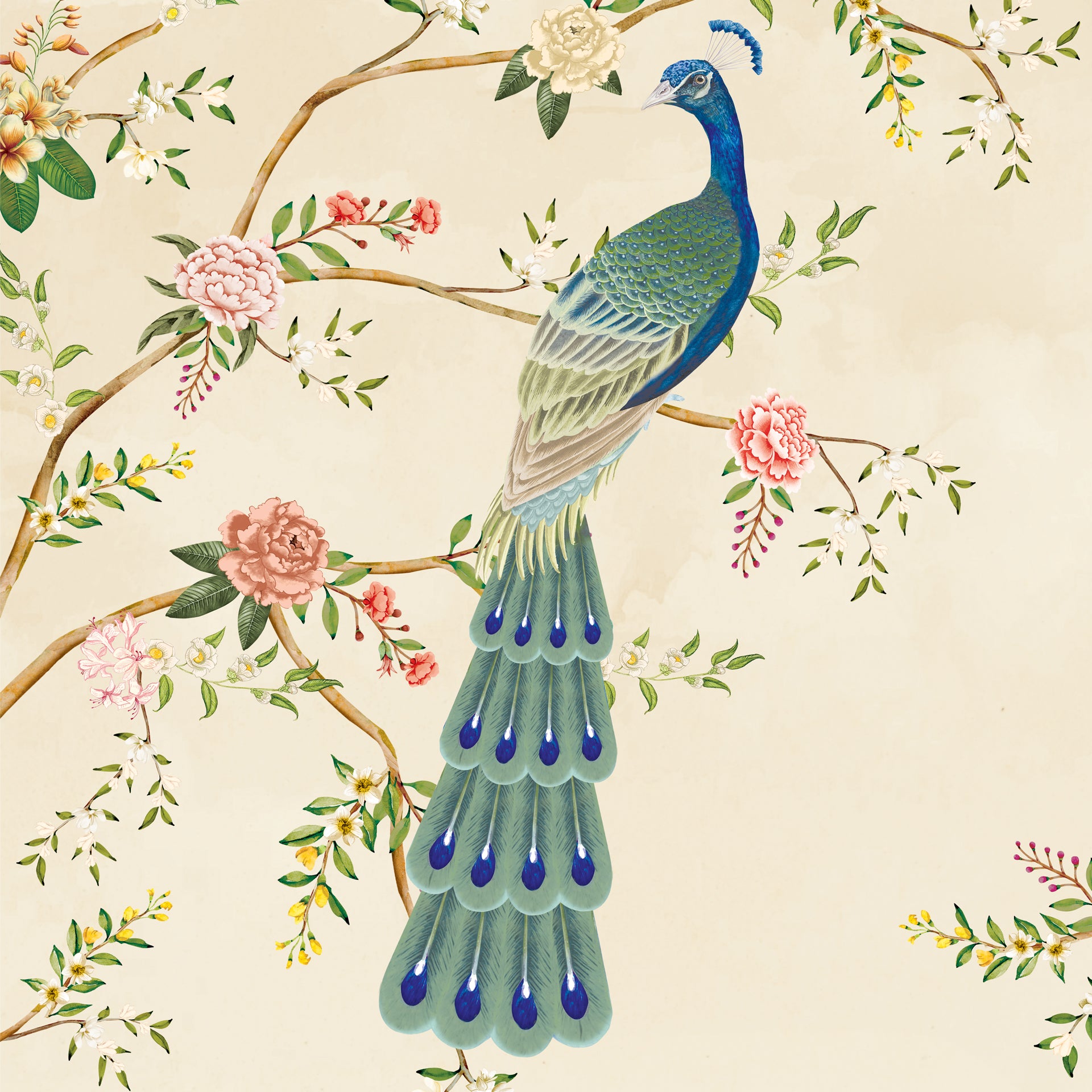 Royal-Bloom: A graceful chinoiserie composition featuring two peacocks perched amid blooming florals-Sample