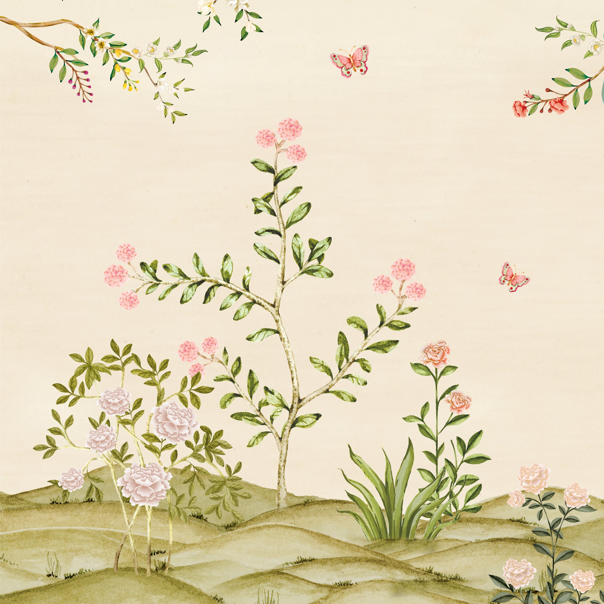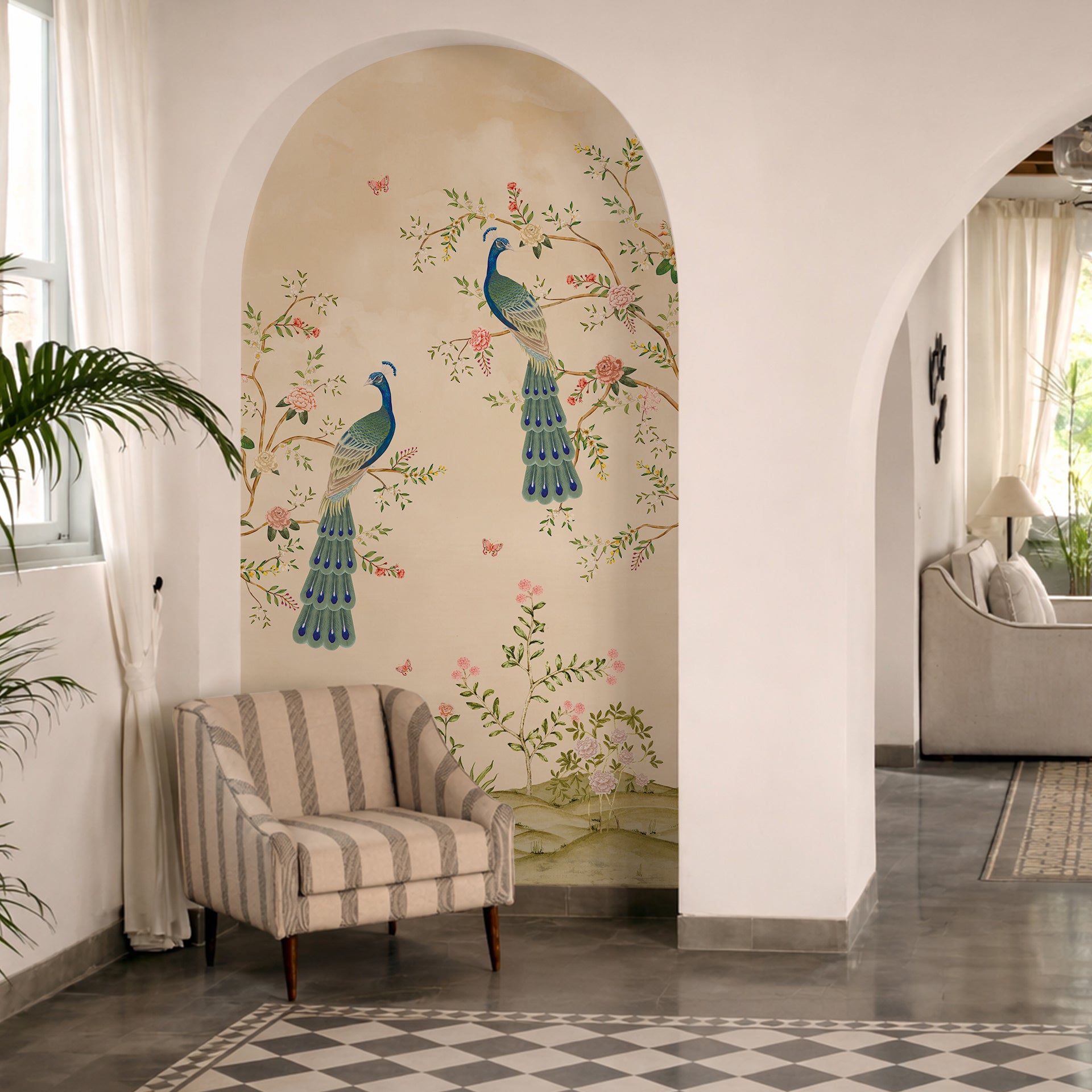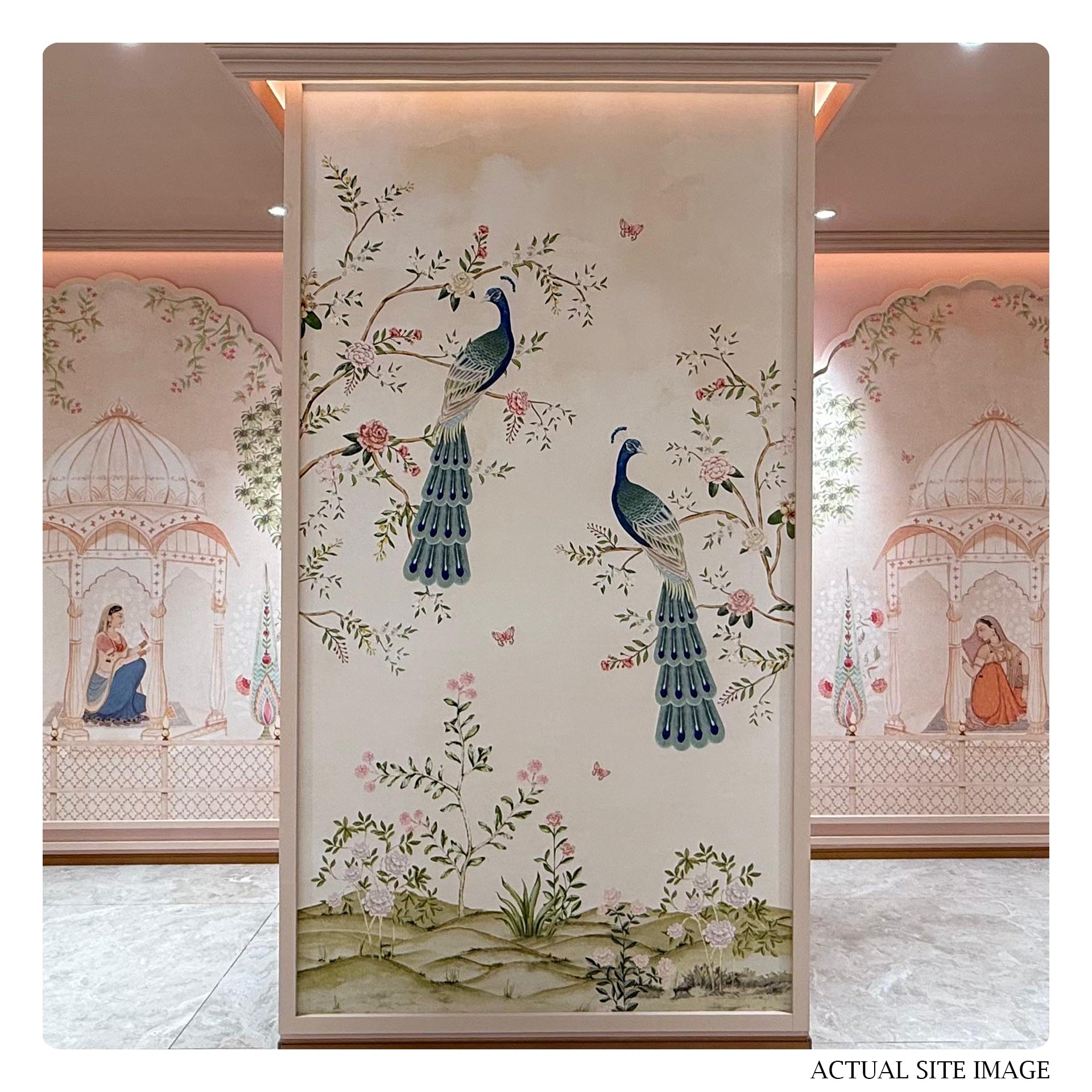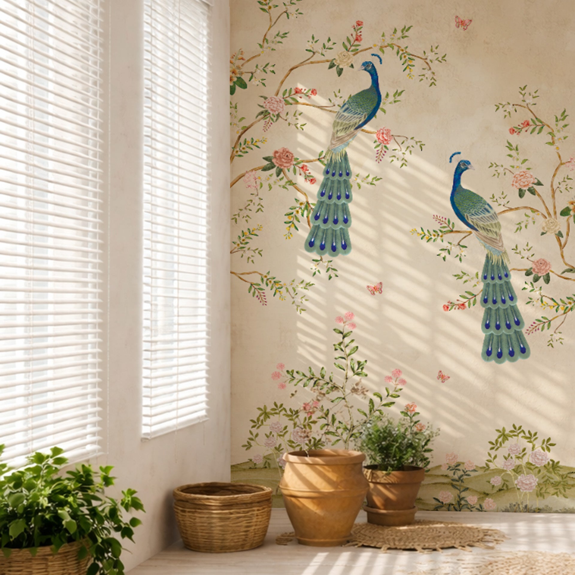 Royal-Bloom: A graceful chinoiserie composition featuring two peacocks perched amid blooming florals-Sample