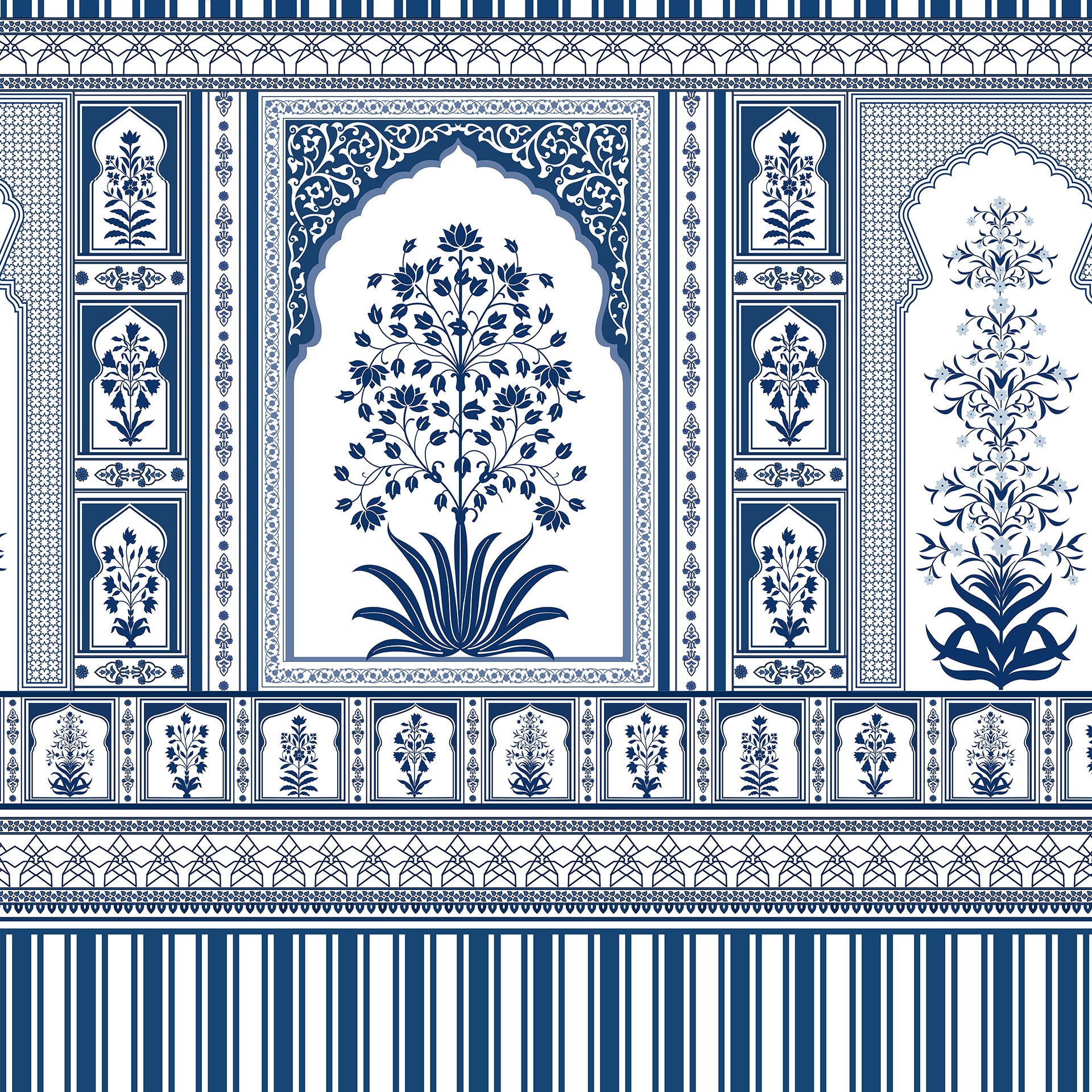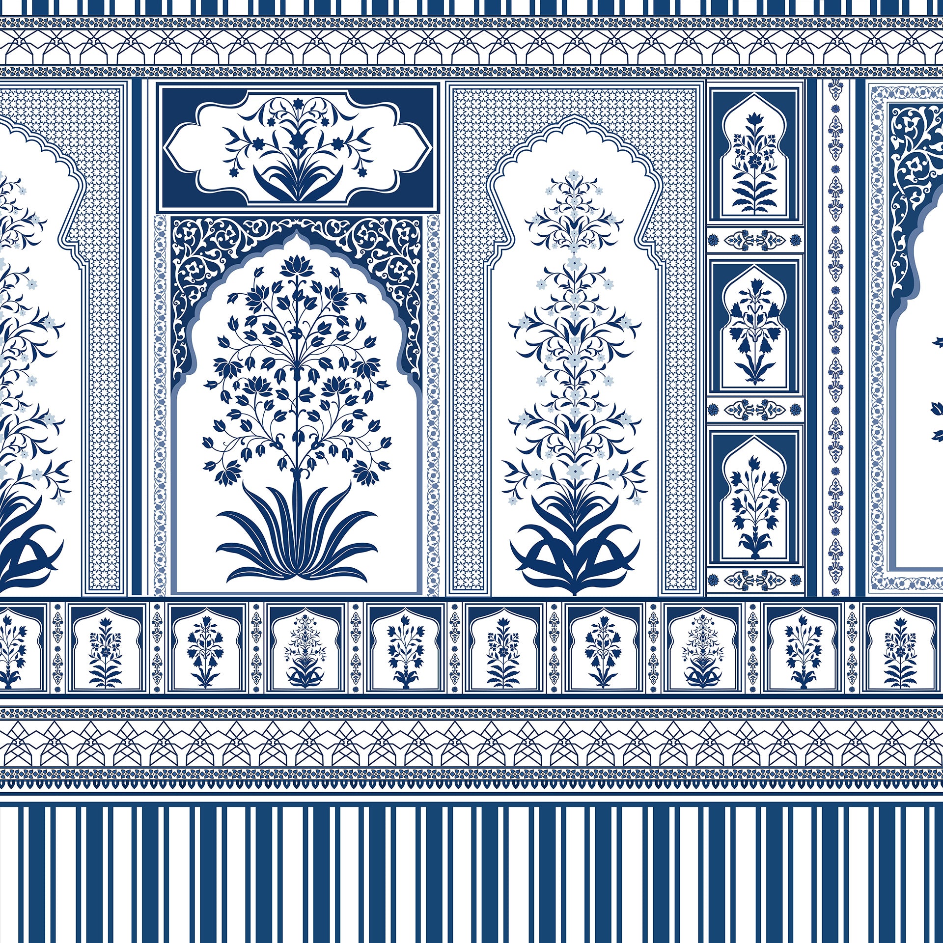 Royal-Blue: Intricate Blue and White Pattern With Floral Panels and Ornamental Borders-Sample