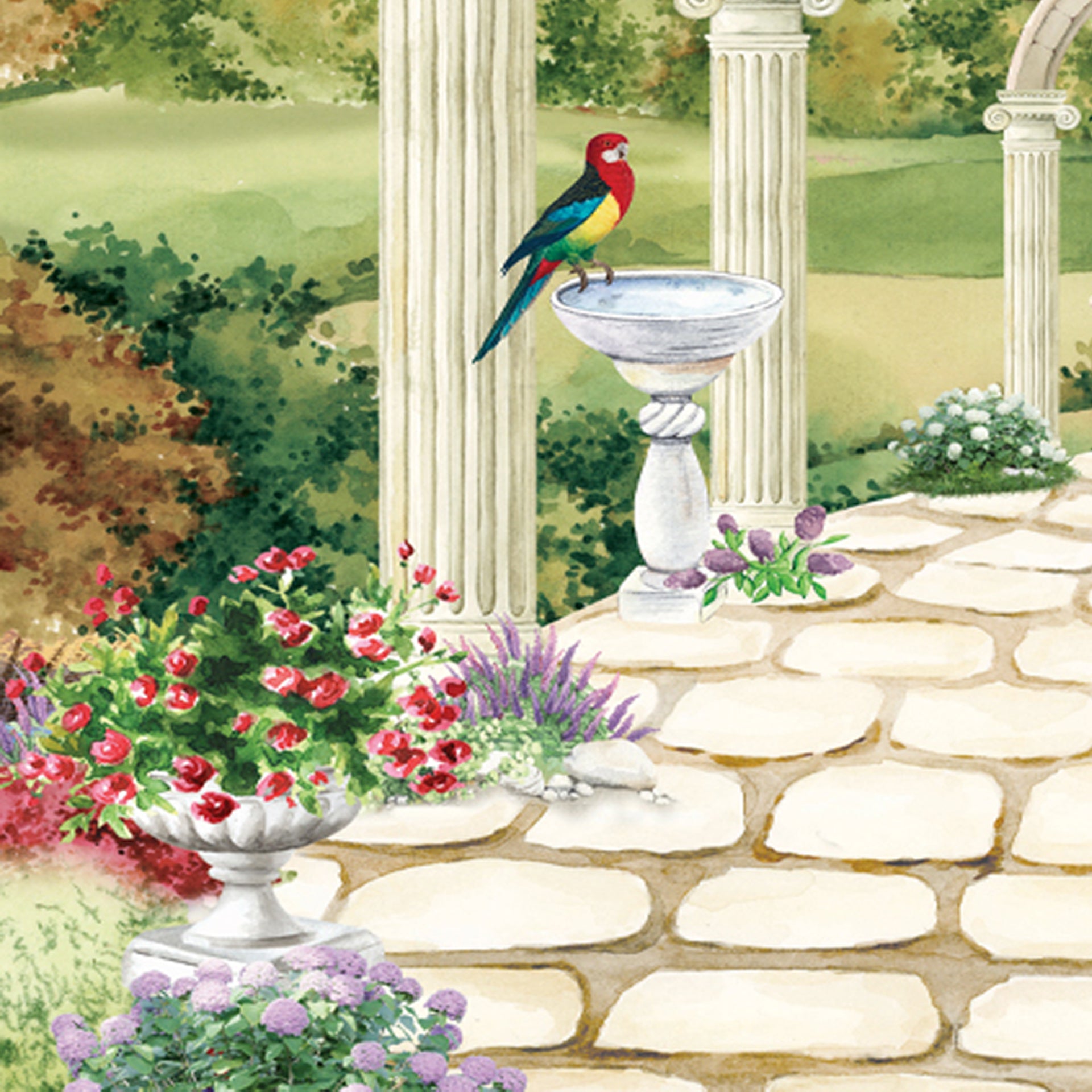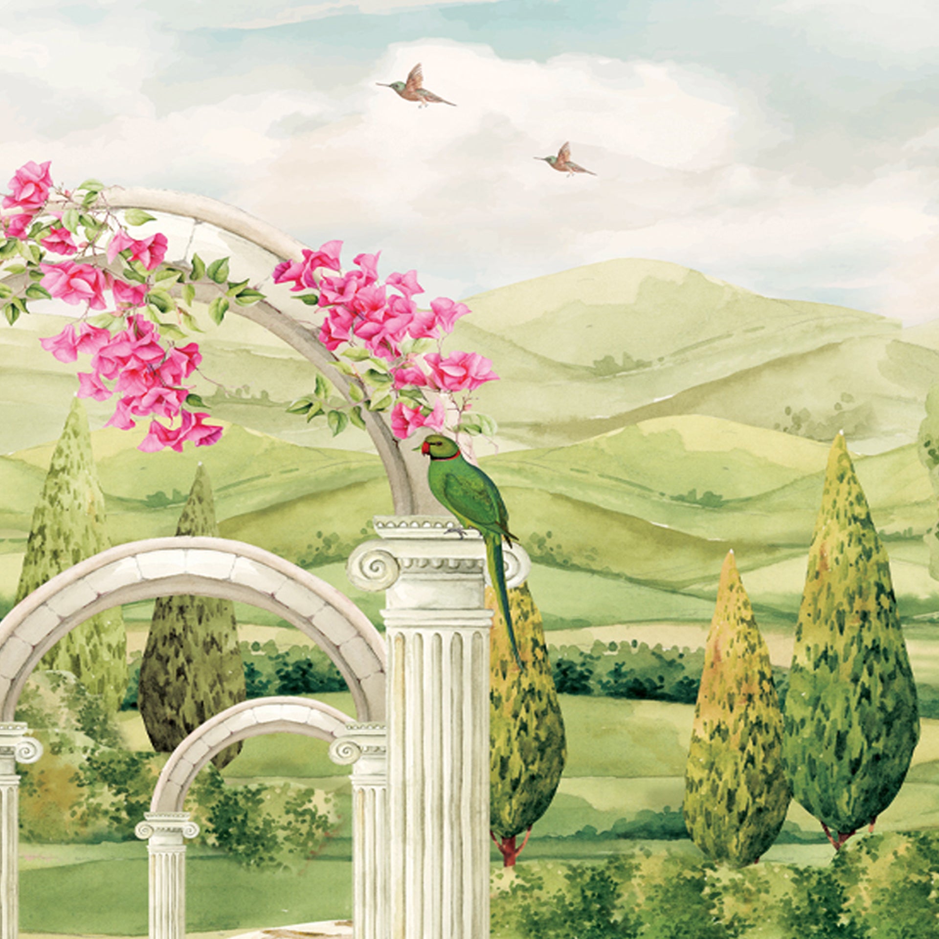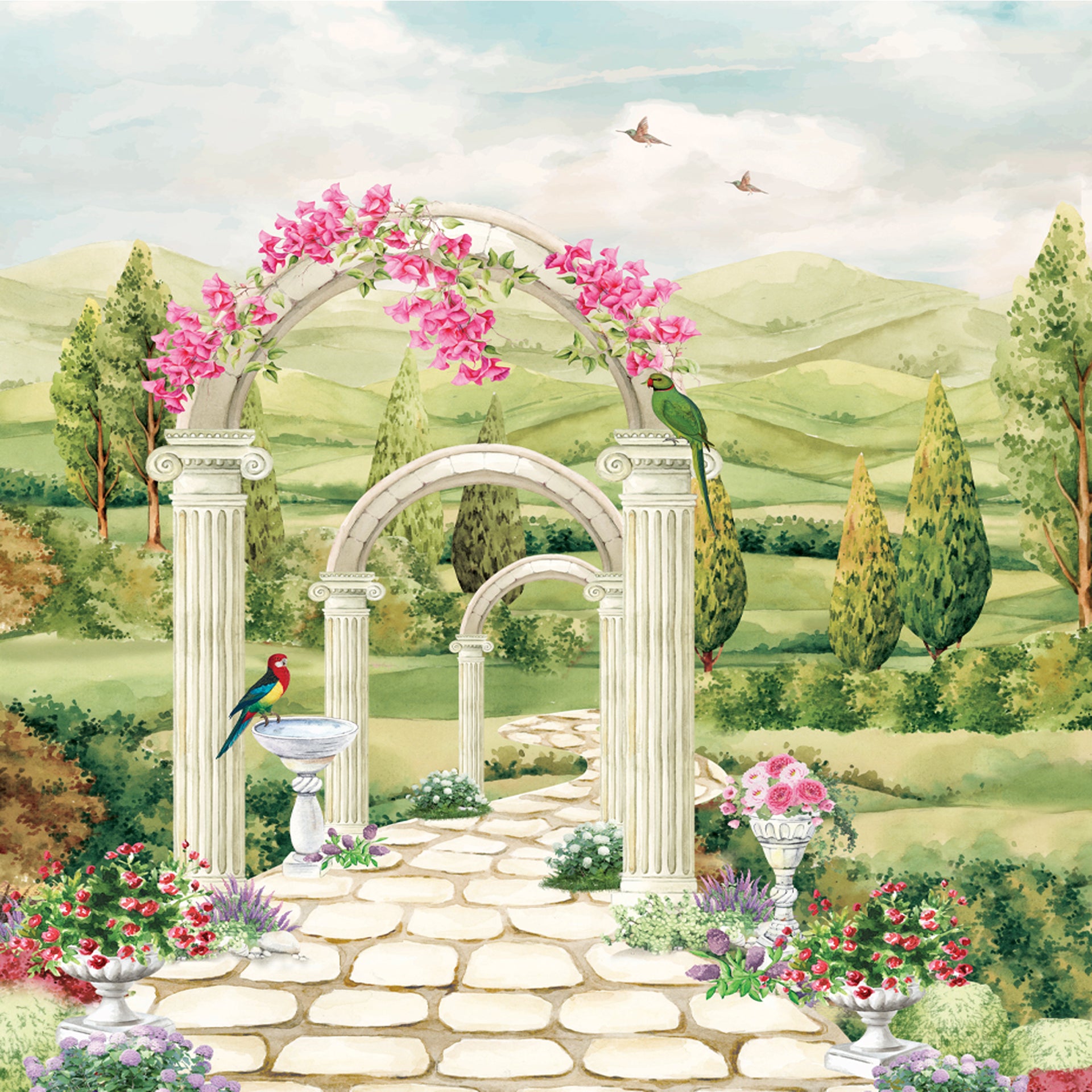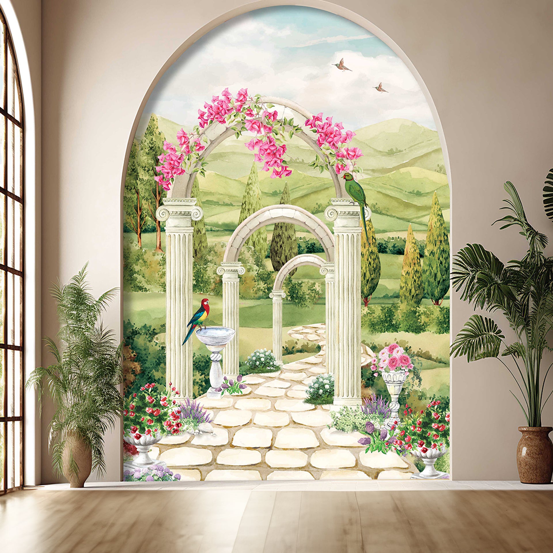 A watercolor garden scene featuring an ornate stone arch and pillars draped with pink bougainvillea, a winding stone path, fountains, and colorful birds, evoking tranquility, romance, and timeless garden beauty.