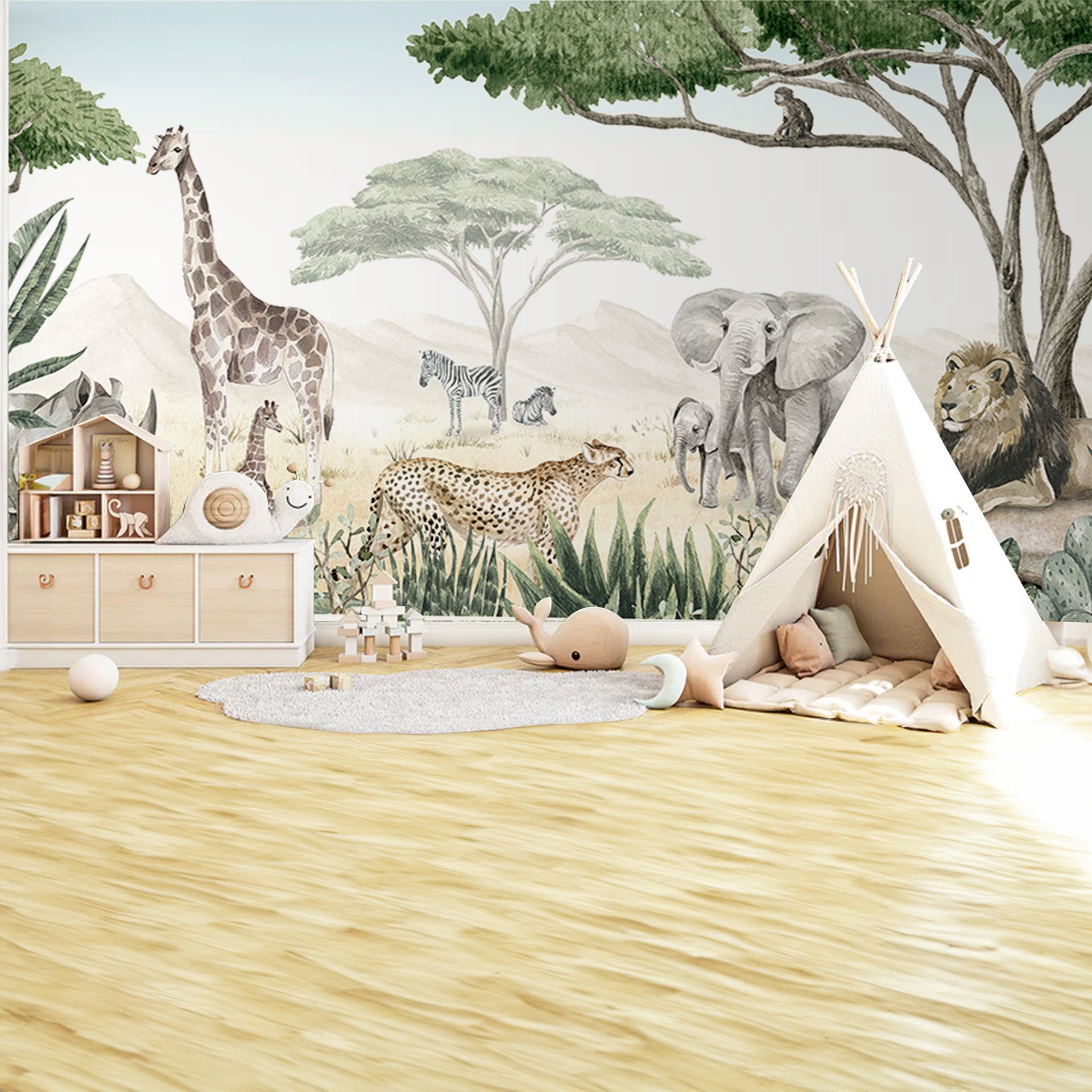 A watercolor-style savanna scene featuring giraffes, elephants, lions, zebras, rhino, cheetah, and a perched monkey among trees and grasses, conveying harmony in nature and diverse wildlife.